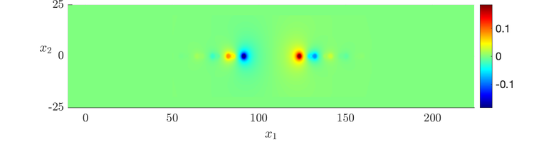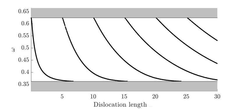 A A A Fine tuning topological waveguides using asymptotic analysis Bryn Davies 1 Department of Mathematics, Imperial College London 180 Queen’s Gate, South Kensington Campus, London, SW7 2AZ ABSTRACT We use asymptotic methods to quantify the properties of topological waveguides and show how these concise results can be used very e ffi ciently to design materials with specific, custom specifications. This work presents a general method for studying localised eigenmodes in periodic media with defects. The results of this analysis characterise the existence of localised eigenmodes, determine their eigenfrequencies and quantify the rate at which they decay away from the defect. These results are obtained using both high-frequency homogenisation and transfer matrix analysis, with good agreement between the two methods. This approach is ideally suited to studying problems arising in topological wave physics and we demonstrate its e ffi cacy by studying materials based on the famous Su-Schrie ff er-Heeger model. 1. INTRODUCTION A powerful phenomenon in the design of waveguides is the principle that if a perturbation is made to a periodic structure, then there is a tendency for specific frequencies to be strongly localised in a region of that defect. These localised eigenmodes (often known as defect modes) have eigenfrequencies that are within a stop band of the spectrum of the unperturbed periodic structure and typically decay exponentially away from the defect. This phenomenon can be used to build powerful waveguides, capable of guiding waves of specific frequencies both along straight lines and around corners [1,2]. As is true for metamaterials in general, the increasing complexity and sophistication of these waveguides poses an ever greater challenge for computaitonal simulation. In order to be able to fine tune and optimise designs, it is important that we find novel ways to describe the fundamental properties of these materials with minimal computational cost. In this work, we will consider metamaterial versions of the famous Su–Schrie ff er–Heeger (SSH) model [3]. This model arose in the study of electron localisation in polyacetylene, which features alternating ‘weak’ and ‘strong’ coupling between adjacent atoms. Since its discovery, the SSH model has been canonised as the simplest periodic structure with non-trivial topology. There have been many subsequent studies in settings including acoustics [4], photonics [5], elastic plates [6] and mechanical systems [7]. The motivation for studying these topological waveguides is that they enjoy enhanced robustness properties compared to other defect modes. We will consider two versions of the SSH model. In both models, we arrange metaatoms in an SSH-type pattern, with short and long separation distances playing the role of the ‘weak’ and ‘strong’ 1 bryn.davies@imperial.ac.uk a slaty. inter.noise 21-24 AUGUST SCOTTISH EVENT CAMPUS O ¥, ? GLASGOW l l ′ l l ′ Figure 1: The two SSH-type metamaterials that we will consider in this work. Left: a sequence of lamina, arranged in an SSH-type pattern, which we study using high-frequency homogenisation. Right: an array of three-dimensional bounded material inclusions arranged according to an SSH- type pattern in one dimension, which we study under a high-contrast assumption. In both cases, the lengths l and l ′ are the crucial parameters which describe the materials’ topological wave transmission properties. The materials are periodic with periodicity length L = l + l ′ . coupling. The first model is a sequence of lamina, arranged in an SSH-type pattern, which can be described by a one-dimensional equation (on the left in Figure 1). We will perform asymptotic analysis in terms of the scale of periodicity, to compute homogenised fields. The second model is an array of three-dimensional bounded material inclusions arranged according to an SSH-type pattern in one dimension (on the right in Figure 1). We will study the three-dimensional di ff erential problem under a high-contrast assumption: we will assume that the density of the material inside the inclusions is much less than that of the background material and perform asymptotic analysis in terms of the material contrast parameter. This approach will yield a concise characterisation of the subwavelength resonant modes of the system, in terms of the eigenstates of the generalized capacitance matrix. In both models, we will create a localised defect mode by introducing a dislocation to the periodic structure. We will see that by varying the size of the dislocation we are able to create localised eigenmodes with any localised frequency within the band gap. In the case of the one-dimensional model, homogenisation will also allow us to estimate the rate at which the localised eigenmode decays away from the defect, in addition to quantifying its resonant frequency. 2. HOMOGENISATION OF A ONE-DIMENSIONAL MODEL We begin by studying the mathematically simpler one-dimensional model. We model the transmission of time-harmonic waves by studying the Helmholtz problem u ′′ ( x ) + ω 2 c − 2 ( x ) u ( x ) = 0. Here, c is the material shown in Figure 1 which has c = 1 in the background and c , 1 on strips that are arranged according to an SSH-type pattern. We can introduce a defect by dislocating, as shown in Figure 2. Introducing the mesh { x n = 2 n : n ∈ Z } , as shown in Figure 2, we can define transfer matrices T = T ( ω ) and D = D ( ω ) to be such that u ( x n + 1 ) = T u ( x n ) + δ n , 0 ( D − T ) u ( x n ) , for n ∈ Z . (1) u ′ ( x n + 1 ) u ′ ( x n ) u ′ ( x n ) An important goal of this work is to estimate the rate at which a localised eigenmode decays away from the interface. We can estimate this from (1) based on the eigenvalues of the transfer matrices. We immediately have that u ( x n ) = O ( | λ 1 | n ) as n →∞ , where λ 1 is the eigenvalue of T with | λ 1 | < 1. Similarly, using the symmetry 