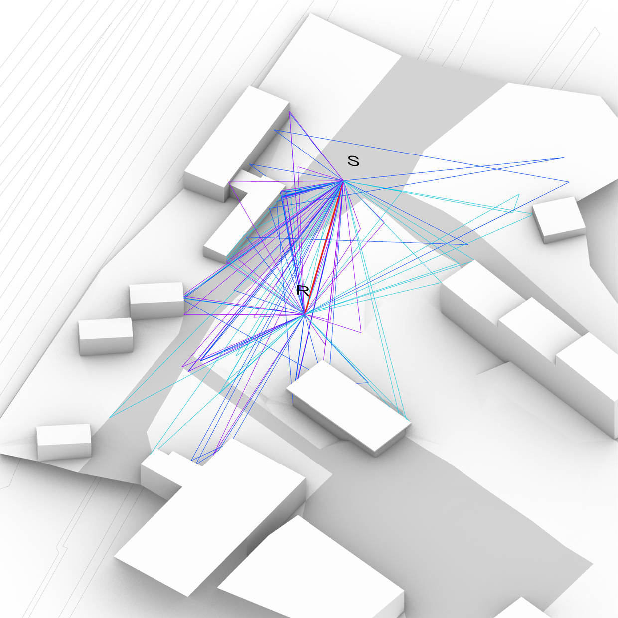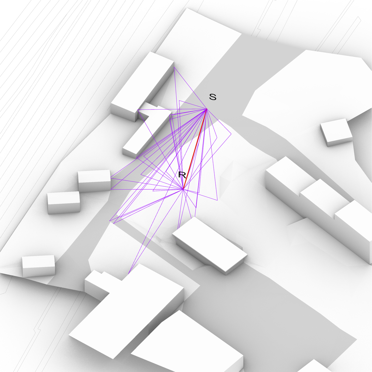 A A A Vehicle pass-by noise auralization in a virtual urban environment Christian Dreier 1 , Michael Vorländer 2 Institute for Hearing Technology and Acoustics, RWTH Aachen University Kopernikusstraße 5, 52074 Aachen, Germany ABSTRACT Auralization is a suitable method for the subjective evaluation of environmental noise. Due to its complexity, the plausible and immersive acoustic representation of outdoor scenarios in urban environments is an ongoing field of research. This work presents the design and implementation of a vehicle pass-by noise model with application in a spatial environmental noise auralization and visualization framework. The acoustic sources are implemented by procedural audio syntheses of engine and road-tyre noise with according directivities. For audio-visual demonstrations, the resulting source model is auralized considering the sound propagation phenomena in a virtual urban environment using the Virtual Acoustics framework. 1. INTRODUCTION 1.1. Background Auralization of complex urban scenarios is a promising, but technically challenging approach. From a theoretical point of view, urban noise auralization deals with inherent non-LTI (i.e. linear time- variant) properties of the propagation medium (air) that occurs due to turbulence-induced advection as well as refraction due to temperature, humidity and pressure inhomogeneities. As exemplarily shown in a recent publication [1] and demonstrated in an according 360 ◦ video 3 , environmental noise studies can be performed in Virtual Reality (VR). An auralization usually consists of separated simulation models for sources, propagation and receivers [2]. Especially for psychoacoustic perception studies of noise sources – such as aircrafts, cars or trains – the acoustic source models should reproduce spectro-temporal characteristics and enable dynamic parameter control for enhanced plausibility. Tra ffi c noise auralization approaches based on simulated sources have been performed e.g. in the LISTEN project [3]. The model combines a pre-calculated road-tyre noise component and additive harmonics for the engine component. Furthermore, the model is enhanced by horizontal directivities in the frequency range up to 8 kHz. Based on this signals, the propagation simulation for fixed, pre-calculated positions – in combination with measurement-based [4] or simulated propagation path impulse responses using the pseudo-spectral time domain method (PSTD) [5] – have been 1 cdr@akustik.rwth-aachen.de 2 mvo@akustik.rwth-aachen.de 3 https://www.youtube.com/watch?v=rudxfV94UwA&list=PLjVMT5BkCe83h299e3FWNivk-MFtRnpw-& index=2 a slaty. inter.noise 21-24 AUGUST SCOTTISH EVENT CAMPUS O ¥, ? GLASGOW performed. Recently, a framework that includes visualization was developed by researchers at the University of York [6]. In this approach, di ff erent tools – Unity3D, Pure Data, Wwise, and Matlab – are concatenated with the underlying vehicle pass-by model being based on the analytic horizontal directivity description from the HARMONOISE catalogue [7] and the propagation e ff ect simulation assuming a first order image source of a sound hard ground. 1.2. Contribution With regard to compatibility to the open-source Virtual Acoustics auralization software (VA) [8] and according real-time constraints, this work presents a vehicle pass-by noise model for dynamic, real-time auralizations. To the research field on environmental noise auralizations, the presented approach further contributes a spatial directivity encoding using the OpenDAFF file format [9]. The sound propagation including directivity-dependent reflections and di ff ractions of building surfaces are calculated based on the image edge model [10]. The framework enables rendering to multiple spatial headphone- or loudspeaker-based reproduction systems. Due to the server-based nature of Virtual Acoustics the framework can be connected to visualization engines, such as Unity3D or Unreal Engine. 2. AURALIZATION MODEL The VA framework is following a three-step paradigm of discrete source-propagation-receiver models. The following block diagram (fig.1) includes a parameter overview of environmental noise auralization in VA. Figure 1: Block diagram of environmental noise auralization in VA. 2.1. Source model of vehicle pass-by noise The source model is subdivided into an omnidirectional and a higher-order directional component. The latter component is coded into a file using the OpenDAFF format [9]. The source model is obtained from an inverse modelling method, described in [11]. The inverse method focuses on the measurement and calculation of acoustic far-field directivities of moving sources. In such a far-field directivity some e ff ects on the wave propagation are included that cannot easily be simulated even with elaborated numerical methods and therefore have to be measured: – Advection due to the object speed and the laminar flow around the moving object; – Refraction due to turbulent flow at body cavities; – Di ff raction due to object geometry; Auralization of complex urban scenarios ‘Outdoor propagation Source signals in inhomogeneous atmosphere Urban sound propagation Reproduction system Receiver signal Directivities Spreading loss. Reflections Parametric sound – Scattering due to surface roughness (of asphalt) that in turn influences both sound generation mechanism and the near-field propagation. In order to obtain a directivity that is comparable to free-field conditions, the measured signals from the pass-by are corrected for – an image source that appears due to the surface impedance, – the geometrical distance law-dependent loss, and – the air absorption between the measurement point and the virtual directivity hull of the moving object. The resulting omnidirectional road-tyre noise component spectrum and the higher-order directivity is shown in fig.2. Figure 2: Synthesized road-tyre noise component (left) and higher-order directivity component, 