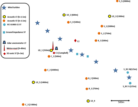A A A A large-scale, long-term experimental campaign for the investigation of wind turbine noise fluctuations and amplitude modulation phenom- ena. David Ecotière 1 Gwenaël Guillaume Laurent Brendel Cerema, Gustave Eiffel University, UMRAE 11, rue Jean Mentelin, 67000 Strasbourg, France Benoit Gauvreau Vincent Gary Gustave Eiffel University, Cerema, UMRAE 44340 Bouguenais, France Isabelle Schmich-Yamane Albert Alarcon EDF DTG 134, Chemin de l’Étang, 38950 Saint-Martin-le-Vinoux, France Marie-Cécile Nessi Fabrice Junker EDF Renewables Cœur Défense - Tour B, 100, esplanade du Gal de Gaulle, 92932 Paris La Défense Cedex, France Guillaume Litou Régis Boittin Lionel Ségaud Cerema 11 rue Laplace, 41000 Blois, France Hubert Lefèvre Cerema 8-10 rue Bernard Palissy, 63100 Clermond-Ferrand, France 1 david.ecotiere@cerema.fr worm 2022 ABSTRACT The understanding and prediction of wind turbine noise (WTN) remain a subject on which progress is needed to better address the concerns of residents of some wind farms and to help wind farm operators to better optimize their wind farms. A large-scale and long-term measurement campaign was conducted by partners of the PIBE project (https://www.anr-pibe.com/en) near a French wind farm during 410 days, in order to study the emission and propagation of WTN. The campaign pro- vided 100ms sound levels and acoustic spectra, together with periodically recorded 2 min audio sam- ples, at 5 locations ranging from 350m to 1.3km from the wind farm, in different propagation direc- tions. Meteorological data were simultaneously collected by a 80m meteorological mast, one or two Lidars and sonic anemometers, in order to characterize vertical profiles of wind speed, wind direc- tion, temperature, and wind turbulence. 2 distinct weeks of intensive measurements (one in summer and one in winter) completed the data by including 15 additional acoustic points at other locations. The database will mainly be used within the project for the investigation of an uncertainty model of WTN, and of WTN amplitude modulations. This communication presents the database and first results about temporal variabilities of WTN. 1. INTRODUCTION Wind energy industry is rapidly developing but the understanding and prediction of wind turbine noise (WTN) remain a subject on which progress is needed to better address the concerns of residents of some wind farms and to help wind farm operators to better optimize their wind farms production. Noise from wind turbines can fluctuate over time for people living near wind farms, even if the wind speed is stationary. This is often due to the variability of the meteorology, which affects both the emission of noise from the blades and the propagation of sound between the source and the local residents, as well as to the temporal evolution of the acoustic properties of the ground. Currently, the acoustic impact studies of a wind farm project do not consider these phenomena, and there is no available information on the uncertainties of SPL predictions. Addressing this problem would enable wind farm developers to estimate more precisely the risk of noise annoyance and to design optimally their wind farms. Developing an uncertainty model to predict these variabilities is one of goal of the PIBE project [1- 2], and this model, based on an extension of the approach of Kayser et al [3], needs to be validated against field measurements. In this context, a large-scale and long-term measurement campaign was conducted by partners of the PIBE project near a French wind farm during more than one year. The goal of this campaign was to study the emission and propagation of WTN, and to get information on sound fluctuations or other specific events, like amplitude modulation, at local residents to better understand which and how environmental parameters influence those phenomena. 2. EXPERIMENTAL PROTOCOL The wind farm where the measurements were made is located on the center of France, on a flat site (altitude gradient <1% over 3km), and is constituted of 8 wind turbines of 3MW nominal electrical power each. Each turbine has three 45m long blades, and a hub located at 80m high. The site has the advantage of a relatively quiet noise environment, a good diversity of wind speeds and directions, and the presence of a 80m high meteorological mast. Acoustical measurements have been done at local residents in order to observe the evolution of noise levels during 410 days, from February 2020 to April 2021. This long-term campaign was completed worm 2022 by two shorter observation period of one week each, at 2 different seasons (July 2020 and February 2021), and involving supplementary acoustic and meteorological sensors in order to increase the spa- tial distribution of sensors. N worm 2022 Figure 1: Experimental set-up with the location of the wind turbines and of the sensors installed during the long-term campaign (LT) and the short-term campaigns (ST). 2.1. Acoustical measurements Long-term campaign Five sound level meters were located on both sides of the wind farm (Figure 1) in directions corre- sponding to the predominant winds directions of the site, at distances -1400m, -1100m, -400m, +620m, +1300m from the wind turbine line (‘+’ and ‘–‘ notation account for South and North location respectively). This arrangement enables to measure simultaneously sound levels for upwind and downwind situations. The sound level meters (ACOEM Fusion) were placed at a height of 1.5m and recorded Leq(100ms) data in the frequency bands [6.3Hz ; 20kHz]. Each point also recorded a 2min audio signal every 10min. All data were automatically transfered each day to a remote server. Short-term campaigns During the two short-term campaigns, 10 additional sound level meters were placed at distances rang- ing from 500m to 2000m to the wind farm (Figure 1), both in upwind and downwind directions, to complete the spatial distribution of sensors during one week each time. The two furthest poi