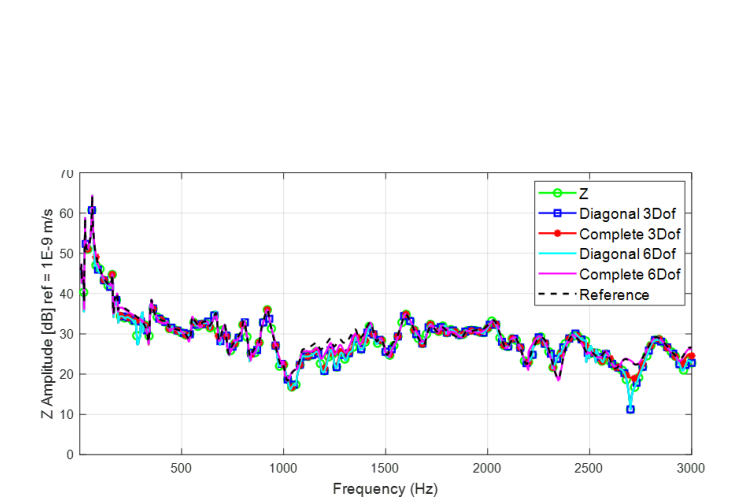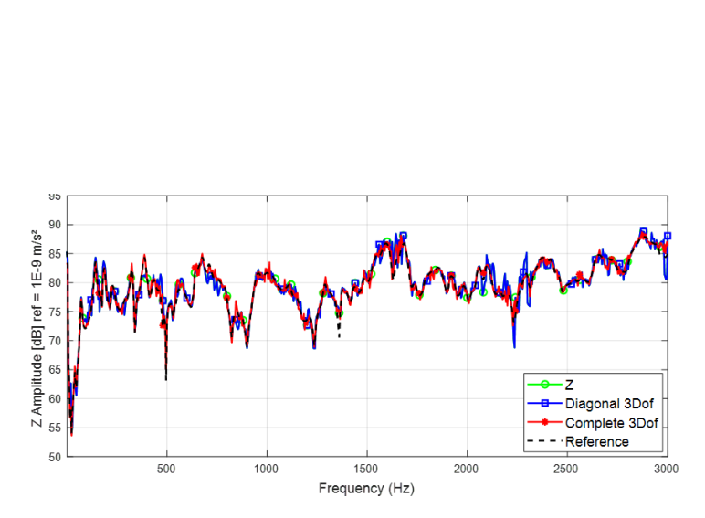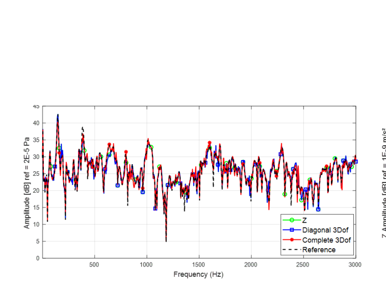A A A Numerical and experimental analysis on helicopter’s main rotor transmission for predicting structure-borne noise (SBN) using CB-TPA methods Wafaa El Khatiri 1 Mechanical Engineering, Université de Sherbrooke, Centre de recherche acoustique-signal-humain de l'Université de Sherbrooke (CRASH-UdeS) 2500 Boulevard de l'Université, Sherbrooke, QC, J1K 2R1, Canada Raef Cherif 2 Mechanical Engineering, Université du Québec à Rimouski 300 All. des Ursulines, Rimouski, QC G5L 3A1 Canada Khalid El Bikri 3 Mechanical Engineering, Ecole Nationale Supérieure des Arts et Métiers ENSAM, Centre de recherche M2SM, Université de Mohammed V Rabat, Maroc Noureddine Atalla 4 Mechanical Engineering, Université de Sherbrooke, Centre de recherche acoustique-signal-humain de l'Université de Sherbrooke (CRASH-UdeS) 2500 Boulevard de l'Université, Sherbrooke, QC, J1K 2R1, Canada ABSTRACT A large number of a vehicle’s mechanical systems are responsible for tonal vibrations, which propagate through the connected structures to radiate structure-borne noise into the cabin. In the literature, transfer path analysis (TPA) methods make it possible to solve vibro-acoustic problems using sub-structuring applications. This paper presents a case study of a heavy-active component connected to a plate backed cavity, using Component-Based transfer path analysis methods. The studied academic system is representative of a helicopter’s main transmission. Both numerical and the experimental characterization are used to discuss the effect of several parameters, such as coupling (in-situ) vs decoupling (sub-structuring), completeness of the used transfer function matrix, the accuracy of the inversion method, as well as the rigidity of the test bench used to identify the equivalent forces. It is shown both numerically and experimentally that by using part of the frequency response functions matrix, one can reconstruct the response of both vibration and acoustic target’s locations, even by decoupling the system and characterizing the equivalent forces on a test bench. Keywords : Transfer path analysis, Structure-borne noise, Component-based TPA 1 Wafaa.el.khatiri@usherbrooke.ca 2 Raef_cherif@uqar.ca 3 k.elbikri@um5r.ac.ma 4 Noureddine.atalla@usherbrooke.ca worm 2022 1. INTRODUCTION The helicopter is essential above all for its versatile qualities and its use in various fields, and the notion of comfort has become a key parameter in any design. Helicopter still concerned about cabin noise, the experimental measurements carried out on it have shown that the structure-borne noise is dominant, where the mechanical systems constituting the helicopter, produce mechanical vibrations which are propagated inside the cabin via the fuselage. In fact, it crosses the whole structure by the struts which support the main rotor transmission [1]. The main rotor transmission is considered as the main source of noise because it contains various elements which produce tonal components at meshing frequencies, this mechanism generates noise which affects the comfort of passengers in the cabin and decreases the quality of communication between them. The main rotor transmission considered in the context of this article is that of the helicopter, it is fixed to the vehicle using two pylons. Each one is fixed to the roof of the helicopter at 8 points, constituting the transfer paths responsible for the transmission of vibrations and noise into the cabin. In total, the main transmission contains two pylons therefore we have 16 transfer paths. The resulting vibrations of the main rotor transmission box generate forces applied to the entire roof and the connected structure. In this article we are interested in the characterization of these forces, using the component-based transfer path analysis CB-TPA methods. The frequency band of interest is that which corresponds to the frequencies of the tonal components of meshing (500 Hz to 3 kHz) [2]. In this article, two studies were carried out to identify the vibratory behavior of the system. First, a numerical study based on a representative model of the structure of the Bell 407 helicopter, where the effect of the incompleteness of the mobility matrix is studied. Second, an experimental study was performed on the system of interest by performing acceleration and (input, transfer) mobility measurements, on coupled and decoupled systems, to test the CB-TPA methods. The results of the two studies are documented for several configurations of the mobility matrix, which are subject to inversion to characterize the equivalent forces. These studies made it possible to see the repercussions of the numerical results on the experimental study, to verify the robustness of the used methods, as well as the precision of the obtained results. 2. BACKGROUND THEORY 2.1. Framework for the Component Transfer Path Analysis Method Transfer path analysis TPA methods are commonly used to dynamically analyze complex structures and the transmission of mechanical vibrations [3], their utility lies in understanding how the response to noise and / or vibration at the receiver appeared [4]. The idea of working with the source-transfer- path-receptor model dates to the 1980s [5], and TPA methods provide a way to detect dominant transfer paths, which negatively impact NVH behavior in the compartment of a vehicle, thus it allows engineers to focus on problem locations to provide optimal solutions. One of the TPA family methods, the CB-TPA methods who seeks to express the excitation force as a function of the components which are characteristic only of the active subsystem. When modifying the design of the passive subsystem, it is not necessary to perform the operational tests again, hence the usefulness of the component based TPA. The dynamic at the receiving side can be obtained by applying the identified equivalent forces, to the FRFs of an assembled system with the active part shut down [3][6][7]. It is an approach which 