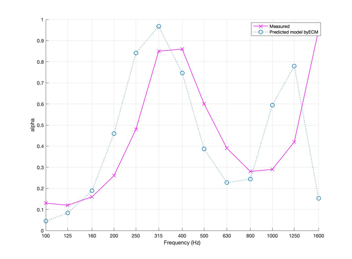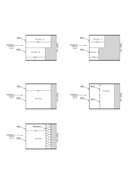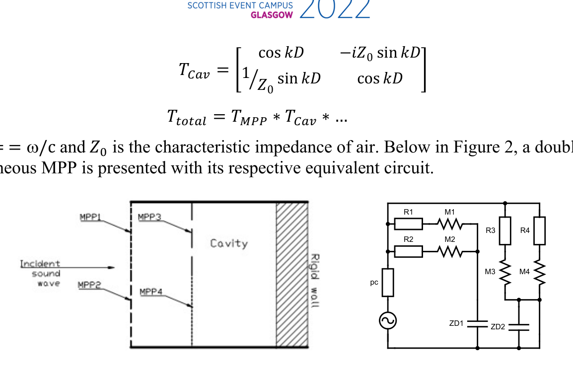 A A A Equivalent Circuit Method Based Double Layer Micro-perforated Panel (MPP) Design to Widen the Sound Absorption Bandwidth Ela Fasllija 1 Bilkent University Department of Interior Architecture and Environmental Design, Bilkent University, Ankara, Turkey Semiha Yilmazer 2 Purdue University Ray W. Herrick Laboratories, Purdue University West Lafayette, Indiana, U.S.A Cengiz Yilmazer 3 CSY R&D and Architecture Engineering, Ankara, Turkey ABSTRACT Acoustical solutions that occupy minimum space and simultaneously allow for flexibility in interior spaces are not feasible by using thick absorbers like conventional porous and fibrous materials. Micro-perforated panels(MPPs) are an excellent alternative to those classical materials due to their environmental friendliness, design flexibility on various materials, and easy installation. However, they come with the handicap of having a very narrow absorption frequency bandwidth. This study explores two inhomogeneous microperforated layers arranged in a cascade with different back cavities in order to widen the sound absorption bandwidth. This serial-parallel architected MPP structure is investigated by mathematical models using Maa's model for a single MPP and the Equivalent Circuit Method (ECM). The numerical results were validated through experiments for normal sound incidence in the impedance tube using the transfer function method. Decreasing the back cavity length between the two layers of the structure results in a higher absorption in the high-frequency range. In contrast, combinations of larger cavity lengths and smaller perforation ratios are more effective in the low-frequency spectrum. By tuning the design parameters of those structures, it is possible to achieve wideband absorption by fibreless materials for room acoustic applications. 1 e.fasllija@bilkent.edu.tr 2 syilmaze@purdue.edu 3 censem64@hotmail.com inter.noise 21-24 AUGUST SCOTTISH EVENT CAMPUS. ? O? ? GLASGOW 1. INTRODUCTION State of the art in absorbing materials shows that passive absorbers such as fibrous or porous ma- terials are indispensable for high-frequency damping noises. Still, problems are increasingly found at the low frequencies due to room modes 1 . Fibrous and porous materials (mineral wool, fiberglass, acoustic plaster and gypsum, foam, etc.) can absorb the sound energy from waves impinging on them. Their limitations lie in the required large thickness for damping low frequencies and the fra- gility of their open structure, causing severe hygiene problems 2 . Resonant systems such as Micro- Perforated Panels (MPPs) are usually used for treating low-frequency problems encountered in rooms acoustics. The latter are alternative fibreless absorbers that can cope with the highest hygiene demands, but they usually only offer narrowband absorption. Placing microperforated panel absorb- ers at a distance in front of a rigid rear wall launched the development of new acoustic elements that do not require porous/fibrous damping materials. Their acoustic effectiveness can be precisely ad- justed almost independent of the panels' material (as long as it is a non-vibrating material) but solely by choice of its geometric parameters ( d -hole diameter, p -perforation ratio, t -panel thickness, and D -back cavity). MPPs can be made of transparent or colourful plates or membranes, so they are also in demand by architects for sound quality control in auditoriums. Apart from metals, MPPs have been inte- grated into acrylic glass absorbers 3 and wood-based ones 4 . A series of structures based on MPP net- works in series and parallel have been explored to introduce multiple resonances to broaden the ab- sorption bandwidth. Maa 5 first proposed a Double-layer MPP absorber in 1987, based on which several studies have followed 6-8 . Those studies show an increase in the overall absorption fre- quency band employing multiple-layer structures when the parameters are tuned accordingly. The design of an N-layer MPP depends on 4N parameters generating design complexity. This study probes to investigate the acoustic absorptive performance of a double layer inhomogeneous trans- parent MPP structure having different back cavities and ultimately can be used for architectural ap- plications. 2. THEORETICAL MODEL This section includes the theoretical model for single-layer MPP, firstly introduced by Maa 9 in 1975. It is followed by introducing the Equivalent Circuit Method (ECM) to calculate the overall surface impedance of inhomogeneous MPPs, and lastly, it presents how to obtain the total impedance of a double layer inhomogeneous MPP having different cavities by using the Transfer Matrix Methods. 2.1. Single Layer MPP Maa 9 found that if a plate containing holes in the submillimeter range is placed at a distance from a hard reflective surface, absorption occurs because shearing forces damp the vibration of the air in the tiny holes at the neck of the holes. The system's efficiency depends on the mass, the stiffness, and the inherent friction, whereas these parameters can be adjusted following the specific acoustic requirements. The acoustic impedance of an MPP at normal incidence can be calculated as shown in Equation (1). + ! + ! () #1 + 1 $3 $ + #$%& √ $ * -& * '()* ! #$1 + & ( (1) 𝑍 !"" = #$ + #$ 𝑘 & ( + $ * + 0.85 inter.noise 21-24 AUGUST SCOTTISH EVENT CAMPUS. ? O? ? GLASGOW When 𝑘= 𝑑 2 * $ 𝜔𝜌 𝜂 * is the perforation constant, w =2 p f is the angular frequency, 𝜂 is viscosity, r = air density, d,t,p being the hole diameter, panel thickness, and perforation ratio, respectively. When the MPP is placed at a distance from the wall, the resulting surface impedance Z tot adds the impedance of the panel with the impedance of the air cavity having a depth of D as explained in Equations (2) and (3). 𝑍 &.& = 𝑍 !"" + 𝑍 /01 (2) 𝑍 /01 = −𝑗cot -∗3 ) (3) 2.2. Inhomogeneous MPP inter.noise 21-24 AUGUST SCOTTISH EVENT CAMPUS. ? O? ? GLASGOW According to the 