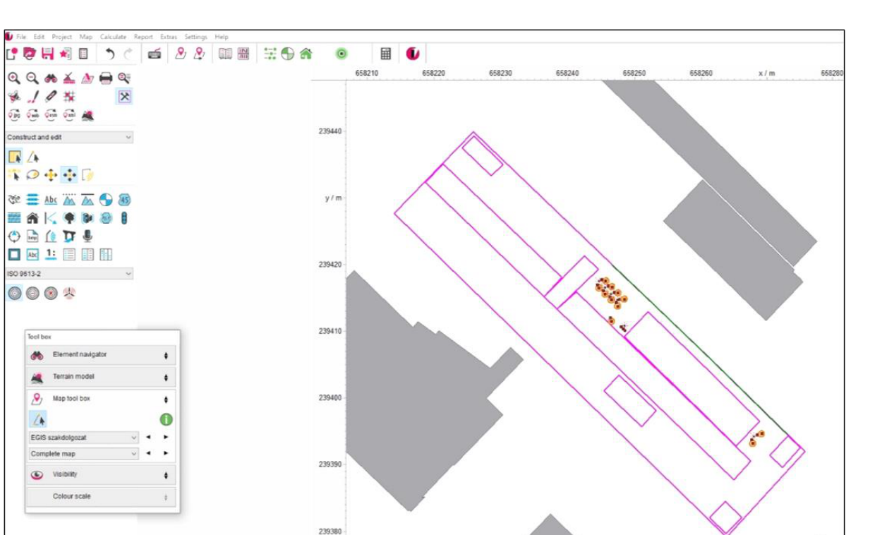A A A Noise Mapping From Above Endre Fay 1 Herman Otto Institute Nonprofit Ltd. 1223 Budapest, Park Street 2. ABSTRACT In the case of noise modelling preparation of industrial plants, if the client does not have the required quantity and quality of information and data for the proper outcome, we have to produce them for ourselves. In such instances, field survey is essential to obtain the desired data. In this paper, it is shown how to create the necessary digital terrain (DTM) and surface (DSM) models for the noise modelling in case they are not available. The implementation of the task was solved by photogram- metric survey obtained as the result of a drone (UAV) flight operation and its data processing. The aim is to produce a file that can be imported into the noise mapping software used in the project. On the generated orthographic photo of the study area the exact position of the noise sources can be marked in the horizontal plane. In vertical plane terms, the surface model will help us to determine the height of the noise sources and the relevant objects. Then, using an appropriate software, a shape file can be generated and imported into the noise mapping software and as the goal, the noise mod- elling can be performed. 1. PROBLEM STATEMENT, DESCRIPTION OF THE TASK In the vast majority of cases, noise mapping also requires field-based survey work in order to perform the task in a complex way. Of course, the noise modelling itself takes place in the office, and it is also true that the parameters and noise data of the sources can be obtained from the manufacturer and thus incorporated into the noise model, but the data of noise measurements and the field-based survey provide us more accurate and credible results. To carry out the fieldwork, we need a floor plan, a site map or a machine layout drawing provided by the client, which we are able to identify the noise sources and important objects on. It may come as a surprise in 2022, but it is often happens that some industrial facilities can only provide us incomplete or inaccurate data, so the best way to carry out the needed survey is to rely on our telemetry and sketching skills. In defining the topic of this thesis, I was guided by the question whether remote sensing methods could be suitable to assist and clarify the field survey process in everyday noise experts’ tasks. My specific aim is to find a usable method that can be applied in noise mapping to overcome possible shortcomings in the data provided by the client in order to produce a better final product. In performing this task, I used photogrammetric data processing to create a dataset that can be im- ported into a chosen noise mapping software. On the orthographic photograph of the site the contours of the plant buildings, the mechanical equipment and the data obtained from the on-site survey of noise sources can be marked, i.e. we get the exact position of noise sources and objects in the hori- zontal plane. In the vertical plane, the generated surface model (DSM) will help us to determine the height of the equipment and objects to be surveyed. The resulting shape file, which already contains 1 fay.endre@hoi.hu worm 2022 the spatial position of the objects, is imported into the noise mapping software. The final step of the task will be the construction of the noise model of the industrial building, which will be carried out after processing the noise survey data and the noise sources location, as briefly described above, using the appropriate software IMMI. 2. A FEW WORDS ON ENVIRONMENTAL NOISE MAPPING Computer modelling can be used to determine the noise exposure for a given area or entire noise source systems with a high degree of accuracy, knowing the exact input data. The noise exposure values calculated for the noise calculation points can be examined not only in two dimensions (as a function of distance), but also as a function of height, which is usually not possible with noise meas- urement methods. This way, the measurement or calculation results of industrial, service and other facilities, as well as traffic noise sources can be represented by graphical tools directly on a site plan or on a three-dimensional digital base map. Furthermore, by adjusting the input parameters, the en- vironmental noise impact of a planned future investment can be assessed as well. The noise map shows the current (or future) noise situation on a noise immission or conflict map, which represents the noise exposure caused by different noise sources in the area of interest in terms of isophonic curves over the time periods of the assessment. The colour-coded graphical representa- tion allows an overview and analysis of the noise situation in a chosen municipality, linear infrastruc- ture or industrial installation, as compliance with the exposure limits laid down in the legislation in force can be clearly determined. The noise exposure levels can be visualized over the entire area of influence of the noise source in issue with an accuracy of 1 - 2 dB depending on the type of the noise source and the investigated area, the outdoor noise propagation rules, and the topographical condi- tions. 3. IMPLEMENTATION OF THE IN FIELD-BASED TASKS 3.1. Environmental Noise Measurement The environmental noise measurement for this task was carried out in April 2019. The results reflect the conditions of that time, which may no longer exist, but perfectly suitable for demonstrating the developed methodology. The environmental noise exposure of the investigated noise sources was determined by noise calculation and noise modelling. The noise measurements carried out are in- tended to provide the input data needed for noise modelling. Noise data from noise sources considered dominant during the on-site visit were stored with near-field measurements, and these values can be used to calibrate the noise model. The following parameters need to be recorded in order to process the data effectively: Name and