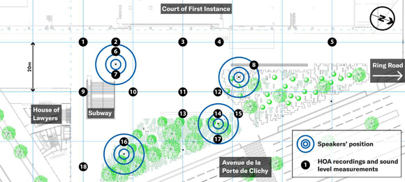 A A A Informing sound art design in public space through soundscape simulation Valerian Fraisse 1 ; Nadine Schütz 2 ; Marcelo M. Wanderley 3 ; Catherine Guastavino 4 ; Nicolas Misdariis 5 1,2,5 STMS IRCAM-CNRS-SU, Paris 1,3,4 Schulich School of Music, McGill University, Montreal 1,3,4 Centre for Interdisciplinary Research in Music Media and Technology, Montreal 2 Institute of Landscape and Urban Studies (LUS), ETH Zurich, Zurich 2 (((Echora))), Zurich 4 School of Information Studies, McGill University, Montreal ABSTRACT Urban sound management often amounts to reducing sound levels with the underlying assumption of sound/noise as a nuisance. However, a reduction in sound level does not necessarily lead to a more pleasant auditory experience, especially in urban public spaces where vibrancy can be sought after. A proactive design approach that accounts for the human experience of sound environment is needed to improve the quality of urban spaces. Recent studies in soundscape research suggest that added sounds and particularly sound art installations can have a positive influence on public space evalu- ations. Yet, the role of added sounds in urban context remains understudied and there is no existing method to date to prospectively inform soundscape interventions. We present here a research-crea- tion collaboration around the design of a permanent sound installation in an urban public space in Paris: Nadine Schütz’s Niches Acoustiques. We report on the development and validation of a Higher-Order Ambisonic soundscape simulation tool for adding sounds to recorded sound environ- ments. This tool is part of a methodology for elaborating listening tests involving the evaluation of added sounds prototypes to inform the sound artist’s composition to optimize the quality of public space experience in the presence of the sound installation. 1. INTRODUCTION Cities often consider urban sound as “noise”, an epidemiological burden that should be miti- gated [1]. Still, sounds play a critical and complex role in the way we experience urban spaces and reducing sound levels may not necessarily result in better sound environments [2]. Sound can instead be regarded as a resource in relation to other urban design considerations through the soundscape approach [3]. Specifically, recent studies show that added sounds in urban spaces can have a positive influence on the perceived quality of public space, be it in encouraging positive behaviors (e.g. [4], 1 valerian.fraisse@ircam.fr 2 nadine.schuetz@ircam.fr 3 marcelo.wanderley@mcgill.ca 4 catherine.guastavino@mcgill.ca 5 nicolas.misdariis@ircam.fr worm 2022 [5]) or in improving soundscape evaluations (e.g. [3], [6]). Most of these studies assess sound inter- ventions on site, through questionnaire deployments or behavioral observations. However, the eval- uation of soundscape interventions in laboratory settings can be beneficial to control and manipulate conditions in a rigorous and repeatable way [6]. Further, the simulation of soundscape interventions allows for prospective evaluations and could help inform the composition of added sounds at the early stages of the creation process. Nevertheless, laboratory conditions can substantially differ from real- life situations, which raises the question of ecological validity, especially in the presence of artificially added sounds [7]–[9]. While an interactive soundscape simulation tool has recently been proposed for co-design processes between urban professionals [10], we extend this line of research to provide a physically accurate simulation tool for soundscape interventions involving added sounds in labora- tory settings, as a way to inform the design of sound installations in public spaces. The research presented here was conducted in the context of a collaboration bringing together a composer and academic researchers around the permanent public space sound installation Niches Acoustiques . Carried out by the composer Nadine Schütz, this laureate project will result in the de- ployment of the sound installation in the parvis of the Court of First Instance in Paris, France. The research-creation collaboration aims at informing the composition through soundscape evaluations as well as to evaluate the installation’s impact on the auditory experience of the parvis. It involves a longitudinal collaboration between the composer and the researchers, from the creation stage to the public reception. Over the course of 2021, we deployed measurement campaigns to characterize the acoustic environment of the parvis and to take field recordings (Section 2). More recently and in order to evaluate the relationship between Niche Acoustique’s sound design parameters and their influence on soundscape evaluation through listening tests, we developed and validated a soundscape simulator tool involving Higher-Order Ambisonics (HOA) [11] diffusion of field recordings from the measure- ment campaign together with 3D modelling of monophonic added sounds. The development of the tool underwent several iterations that we will presented here. We first developed the tool from the background sound environment reproduction to the added sounds’ auralization (Section 3). We then invited four experts in spatial audio to tune-in the auralization parameters (Section 4). Finally, we validated the tool and selected one of the auralization for future listening tests in a preliminary labor- atory study (Section 5). 2. MEASUREMENT CAMPAIGN In spring 2021, we collected spatial recordings in the parvis’ for the soundscape simulation. We con- ducted punctual Higher-Order Ambisonic (HOA) recordings and sound level measurements through- out the public space across five sessions covering different activity levels (weekday morning, week- day afternoon, weekday evening, weekend morning and weekend evening). A map of the parvis of Paris’ Court of First Instance is shown Figure 1, with the position of the sound installation Niches Acoust