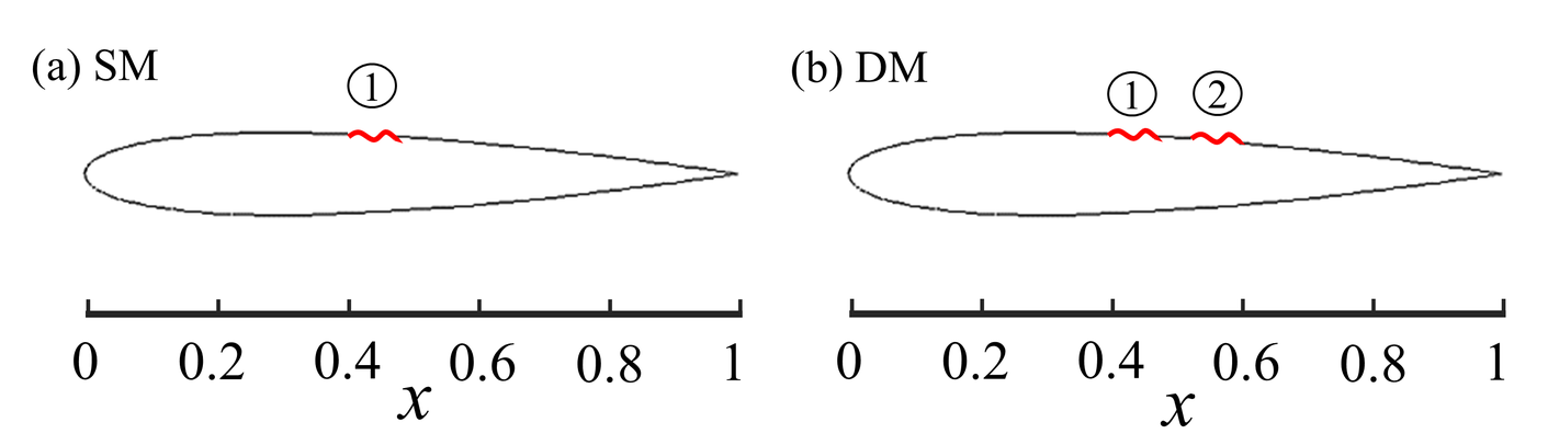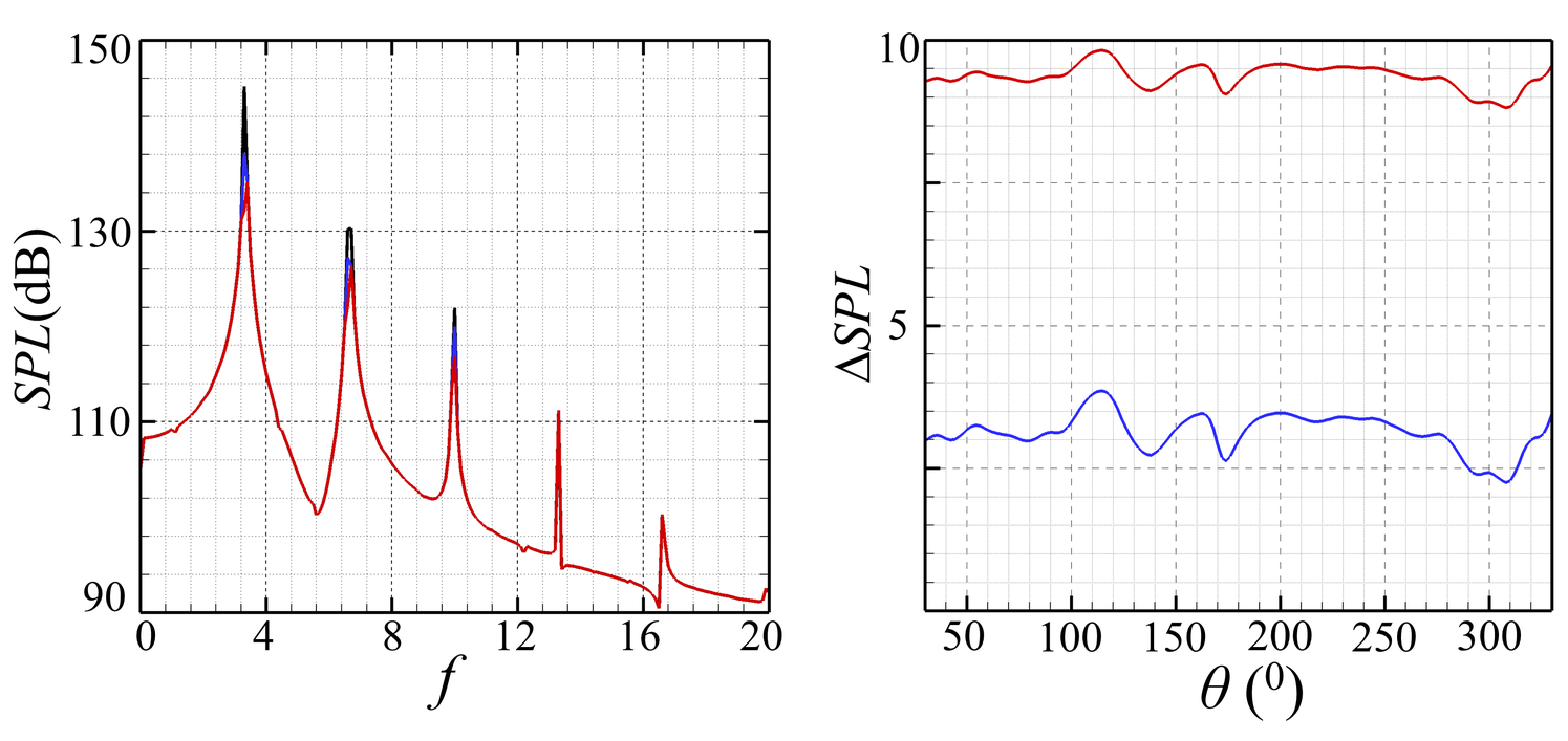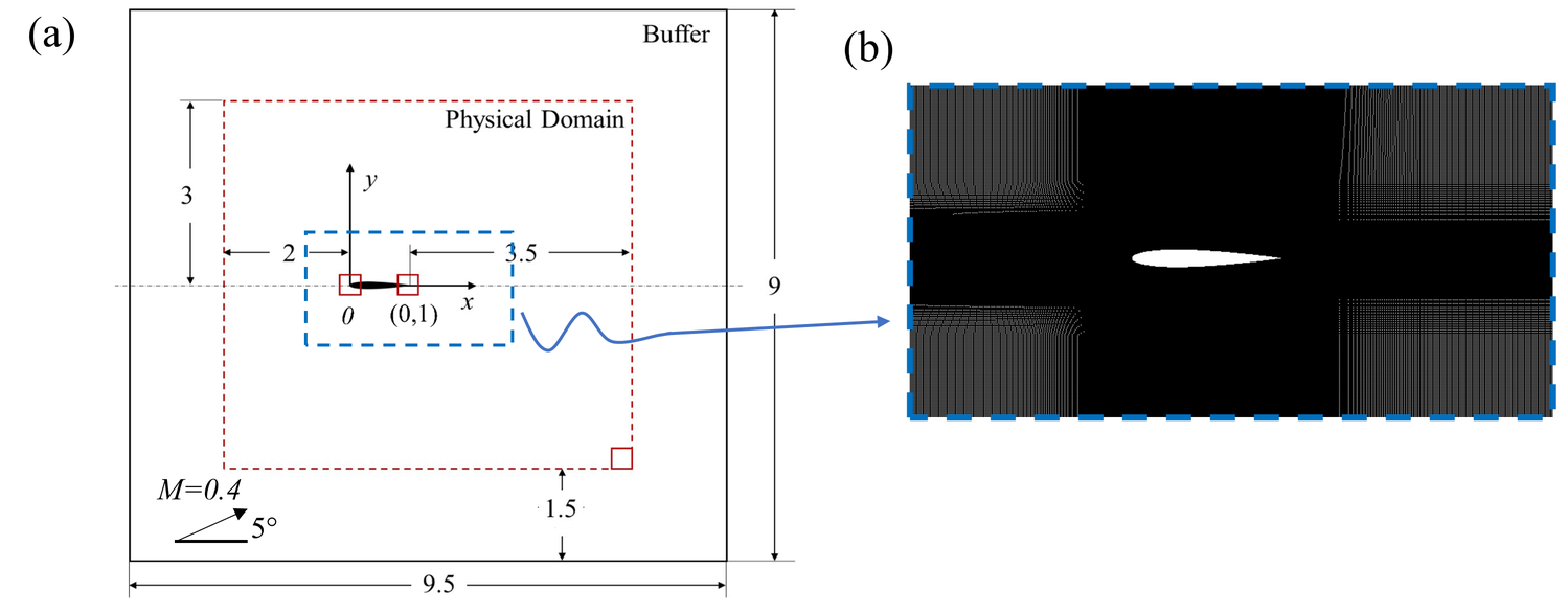 A A A Fluid-structure interactions and aeroacoustic coupling of airfoil with flexible membrane(s) Arif Irsalan 1 The Hong Kong Polytechnic University Hong Kong, P. R. China Randolph C .K. Leung 2 The Hong Kong Polytechnic University Hong Kong, P. R. China Garret C. Y. Lam 3 The Hong Kong Polytechnic University Hong Kong, P. R. China Muhammad Rehan Naseer 4 The Hong Kong Polytechnic University Hong Kong, P. R. China ABSTRACT In this paper, fluid-structure interactions of a NACA 0012 airfoil mounted with short membrane(s) and its coupling e ff ect on airfoil aeroacoustics are presented. A time-domain direct aeroacoustic simulation coupled with structural dynamics is carried out at a low Reynolds number of 50,000 to explore the aeroacoustic-structural interactions. Two di ff erent airfoil configurations based on single and dual membranes are analyzed. The membrane displacements and their impact on the flow field are characterized in wavenumber-frequency domain to analyze the structural dynamics due to flow unsteadiness within the laminar boundary layer and the resulting acoustic waves emanating from the airfoil trailing edge. A strong correlation between the membrane displacement and downstream propagating flow is observed for both configurations whereas the correlation is considerably weakened between the membrane displacement and upstream acoustic waves which ultimately results in the airfoil self-noise reduction without a ff ecting the airfoil aerodynamics. The extent of noise reduction for dual membranes airfoil configuration is observed to be considerably higher than the single membrane airfoil configuration which corresponds to a much lower correlation among the upstream propagating acoustic waves and membrane displacement resulting in the redistribution of upstream flow energy into di ff erent frequencies. 1 irsalan.arif@connect.polyu.hk 2 mmrleung@polyu.edu.hk 3 garret.lam.hk@connect.polyu.hk 4 rehan.naseer@connect.polyu.hk a slaty. inter.noise 21-24 AUGUST SCOTTISH EVENT CAMPUS O ¥, ? GLASGOW 1. INTRODUCTION Self-noise generation of an airfoil operating at low / moderate freestream Reynolds number ( Re ) is one of the most undesirable aspects associated with its operations. The mechanism of airfoil self-noise generation has been studied over the years by several researchers since the early stages of airfoil aeroacoustics and has been explored to date. Brooks et al. [1] gave a classification of the di ff erent flow physical mechanisms that can lead to noise radiation from airfoil. They categorized di ff erent airfoil self-noise mechanisms at subsonic flow conditions. The first category is turbulent boundary layer (TBL) trailing edge noise which is associated with the flow turbulence passing over the trailing edge at high Re . Secondly, at low Re , the laminar boundary layer (LBL) develops over the airfoil and the noise generation is associated with the vortex shedding. Another form of airfoil self-noise is due to vortex shedding occurring at the aft region of blunt trailing edge. Also, at high angles of attack ( AoAs ), the separated flow may cause stall which results in low-frequency noise radiation. Lastly, noise can be radiated due to the formation of tip vortices occurring at the tips of wings or blades. The airfoil tonal noise generation phenomenon involves the interaction among di ff erent physical mechanisms involving hydrodynamics, acoustics, and even structural dynamics in some cases. Hence, the study of airfoil tonal noise require in-depth understanding of all the physical processes involved and their inter-dynamics. One of the most interesting aspects on the airfoil tonal noise generation is to identify whether the events occurring on the pressure side of the airfoil or the suction side are responsible for eventual tonal noise generation. Earlier studies mostly focused on airfoil pressure side flow separation and the resulting tonal noise generation; however, some of the later studies even noticed the role of the suction surface of the airfoil in tonal noise generation at some flow conditions. Paterson et al. [2] observed no change in tonal noise behavior when the airfoil suction surface was tripped, whereas the tonal noise was almost eliminated on tripping the pressure side of the airfoil. Hence, the tonal noise generation was mostly associated with the events occurring on the pressure surface of airfoil. However, Jones et al. [3] observed that the events on the suction surface are responsible for tonal noise generation. In their experimental study, Inasawa et al. [4] observed that the suction surface of airfoil is responsible for feedback loop at low Re up to 2 . 1 × 10 5 . The involvement of both suction and pressure side of airfoil in tonal noise generation indicates their dependence based on a number of flow conditions such as Re , freestream Mach number ( M ), airfoil profile, and incidence of flow. A comprehensive study on tonal noise regime for a NACA 0012 airfoil at low to moderate Re (3 × 10 4 - 2 . 3 × 10 5 ) and e ff ective AoA from 0 ◦ to 6 . 3 ◦ was carried out by Probsting et al. [5]. Their study presents a very valuable overview of the tonal noise regime and their dependence on either suction side or pressure side or interaction of both sides of airfoil based on Re and AoA . Chong et al. [6] and Plogmann et al. [7] observed multiple tones and ladder-like structure in their experimental studies. [7] showed that the boundary layer becomes turbulent when the pressure side boundary layer was tripped and subsequently separation bubble and tonal noise was suppressed. Desquesnes et al. [8] in their numerical investigation observed the involvement of both the pressure and suction surfaces in tonal noise generation. A recent study by Sanjose et al. [10] shows a significant connection between tonal noise and T-S waves. In recent years, flow control methods based on the fluid-structure interactions have been attempted and employed on the airfoil; however, mos
