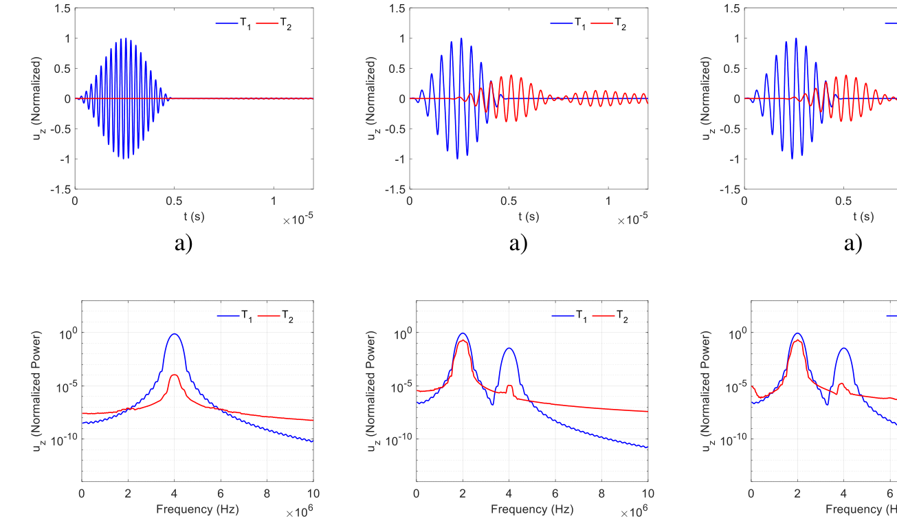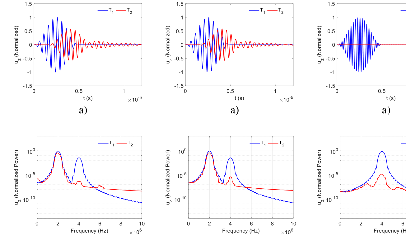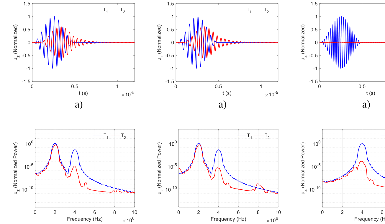 A A A Inverse Design of Linear and Nonlinear Cylindrical Metamaterial Rod Pravinkumar Ghodake Indian Institute of Technology Bombay IIT Area, Powai, Mumbai, Maharashtra, India 400076 ABSTRACT Continuum elastic metamaterials can be used to reduce system-generated 2 nd harmonics, and they should also pass the fundamental harmonics during nonlinear ultrasonic testing. Linear metamaterials are designed based on the bandgap structure of the periodic layered materials showing contrast in acoustic impedances. A parametric sweep calculates design parameters such as widths of the periodic layered elastic materials by solving eigenvalue problems and the transfer matrix method. Most design studies assume infinitely long periodic elastic layers, but in practice, the length of metamaterial is limited by the reduction in fundamental amplitude of input short pulse. Though the linear metamaterials are designed for nonlinear ultrasonic applications, considering geometric and material nonlinearity of the layered elastic materials, which contributes to harmonic scattering, the sensitivity of widths of layered materials to amplitudes of the 2 nd harmonics, along with the linear interference, is the most realistic modeling approach. In this study, linear and nonlinear metamaterials are designed using shape optimization techniques by solving transient finite element studies considering real geometric and material models. Gradient-free algorithms such as coordinate search and Nelder Mead are used during optimization. Effective design approaches are proposed and demonstrated to control longitudinal modes in a cylindrical rod. 1. INTRODUCTION The sensitivity of nonlinear ultrasonics due to its higher frequencies towards early-stage damages of micro and nanoscale demonstrates its increased importance in structural health monitoring applications. Interaction of elastic waves with early-stage damages modeled as nonlinear elastic solids in theoretical and computational studies shows the generation of higher harmonics also demonstrated by various experimental studies. In nonlinear ultrasonic experiments measuring amplitudes of the higher harmonics such as 2 nd harmonics ( 2f ) has the topmost importance as it is directly proportional to the intensity of early-stage damage present inside the material. During actual practice, system-generated harmonics due to input power to the power amplifier, during power amplification, through wires, transducers, etc., are also introduced, which tries to mask the actual response of early-stage damages present inside the solids [1]. To avoid such masking, Mostavi et al. [2] designed elastic metamaterial using a trial-and-error method. They demonstrated an enhancement in the measurement of 2 nd harmonics experimentally due to metamaterials. The nonlinear ultrasonic applications are not only limited to bulk waves; they are also extended for guided waves when a wave propagates through constrained geometries such as plates and rods. Sandeep Kumar et al. [3] proposed a new type of cylindrical metamaterial that blocks system generated 2 nd harmonics. They have designed the cylindrical metamaterial by looking into the dispersion curves obtained by solving multiple eigenvalue problems along with the frequency sweeping and manually varying the geometric parameters of the metamaterials. In this study, very compact layered cylindrical metamaterials are designed using an inverse design approach. In this proposed inverse design approach, only input layered materials and their geometry (cylindrical) are the only things needed to decide on the design. Finding optimal geometric parameters is done by proposing an appropriate optimization problem and solving them effectively. Generally, metamaterials are designed through various methods such as the transfer matrix method, solving eigenvalue problems, etc., [2-3] where passing and stopping bands of the metamaterials are tuned by doing vast parametric sweeping. In the proposed approach, the objective functions are defined to control the time response of the output wave, which is indirectly reflected in manipulations in the frequency domain. In the traditional design, approach theories are proposed and implemented based on the assumption that the unit cell of metamaterial is repeated infinite times, which is not valid in practice most of the time and is the critical thing to consider when nonlinear ultrasonic applications are regarded as high-frequency waves might get attenuate in a metamaterial itself whereas we have to pass the output wave with 1 st harmonics and without 2 nd harmonics to the actual specimen for early-stage damage quantification. The proposed inverse design approach works for designing very short metamaterials to long metamaterials. A similar application of the proposed application to control bulk waves can be seen here [4]. 2. PROBLEM DEFINITION Schematics of considered layered metamaterial are shown in Figure 1. Unit cells of glass and steel material layers are repeated periodically along the length of the cylinder. The assumption is that during the nonlinear ultrasonic testing, steel specimens are used, so the base material steel is chosen as a part of a metamaterial. An additional steel layer is added to avoid the initial impedance mismatch between the transducer and the first layer (Figure 1). In contrast, such adjustments are challenging using other methods such as the transfer matrix method, solving eigenvalue problems related to the unit cell of phononic crystal, and parametric sweeping. The inverse design approach includes defining a forward problem by conducting finite element simulations, and then the design parameters of the metamaterials are optimized by defining an appropriate objective function. In this study, design variables are the widths of glass ( W G ), steel ( W S ), and the total length ( L ) of the cylindrical metamaterial. All these variables are optimized simultaneously using gradient-free algorithms such as C
