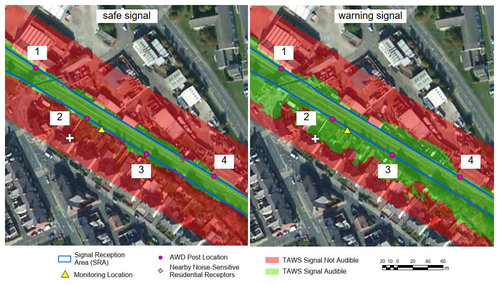 A A A An Approach to Designing and Specifying Audibility Requirements of Train Activated Warning Systems. Christabel Goode 1 AECOM Ltd 1 Tanfield, Edinburgh, EH3 5DA Seckin Basturk 2 AECOM Ltd 12 Regan Way, Chilwell, Nottingham, NG9 6RZ, UK James Block 3 AECOM Ltd 12 Regan Way, Chilwell, Nottingham, NG9 6RZ, UK Alex Southern 4 AECOM Ltd 120 Bothwell Street, Glasgow, G2 7JS, UK ABSTRACT Train Activated Warning System (TAWS) is a railway safety system which uses an audible warning to alert track workers of an oncoming train. When the system is active, a safe-tone sound is emitted to indicate the system is active. Activated by the train signalling system, the safe tone switches to a warning-tone when a train approaches, in enough time to allow rail workers to reach a position of safety. There is currently no specific methodology for designing a new TAWS to achieve the re- quired audibility over a defined area of track. This paper discusses the approach to the design and specification of the TAWS audibility over lengths of track where different prevailing acoustic envi- ronment conditions need to be considered. The challenges encountered and the limitations of the resulting approach are also discussed. 1. INTRODUCTION Situations where railway staff are working on tracks open to traffic for purposes of inspecting, maintaining, enhancing or renewing the railway, have been in practice for many years in the UK. As this is considered riskier than other methods of working (e.g. stopping the trains), it is avoided 1 christabel.goode@aecom.com 2 seckin.basturk@aecom.com 3 james.block@aecom.com 4 alex.southern@aecom.com worm 2022 where practicable. However, in recent years, owing to the increasing customer and stakeholder de- mands, working on tracks open to traffic is increasing. Therefore, managing the risks posed by working alongside lines open to traffic is one of the highest priorities of railway authorities [1]. De- spite having a number of safety methods in place, workforce casualties reported in recent years stresses the need for better safety procedures [2][3]. In the UK, as part of rail worker safety improvements, the use of human lookouts reliant on vis- ual identification of approaching trains is being phased out. Where possible, Network Rail are re- placing human lookouts with protection and warning technology to alert groups of workers to ap- proaching vehicles on the track [4]. There are a number of different technologies that are currently used and under development to help with the trackside safety objectives in the industry. One of these is the Train Activated Warning System (TAWS). The TAWS emits a warning signal when a train is approaching the works area and a safe signal when there is no train. The systems are activated by the rail workers when working or access is re- quired within the TAWS signal reception area (SRA). The SRA includes all areas that are consid- ered to be on or near the line. There is very limited guidance for designing a new TAWS to achieve the required audibility over a defined area of track however objective audibility specifications exist that can be used to de- termine if a given signal is audible. There is also a lack of specific guidance on how to balance the need for audibility in the SRA with minimising the potential environmental noise impact on nearby noise sensitive receptors (NSRs). This paper presents a complete approach to the design and specification of a TAWS that is audi- ble over lengths of track where different prevailing acoustic environment conditions need to be con- sidered and where the potential impact on noise sensitive neighbours also needs to be considered. 2. RELEVANT STANDARDS AND GUIDANCE While there is no specific TAWS guidance outlining a design methodology to balance audibility needs with environmental noise impact, there are existing relevant standards. The following can be used as a reference for TAWS installations in the UK: • Network Rail (NR) Standard “Train Activated Warning Systems” (NR/L2/SIG/30009/Z115) (the NR Standard) [5] specifies the design rules for the implemen- tation of a TAWS: This is the primary reference for designing a TAWS to be compliant for use on the NR infrastructure. In addition, NR requires any audible warning device used to be certified by them. • International Standard ISO 7731:2003 “Ergonomics – Danger signals for public and work areas– Auditory danger signals” [6]: This provides design guidelines for auditory danger sig- nals to be used for public and work areas. It defines audibility limits based on the importance of the signal, namely whether it is a “safe” signal or a “warning” signal. • British Standard EN 16704-2-1:2016 “Railway applications. Track. Safety protection on the track during work. Common solutions and technologies. Technical requirements for Track Warning Systems (TWS)” [7]: This covers different types of warning systems, including look- out operated warning systems which are human led and technology led systems, automatic track worm 2022 warning systems or signal-controlled warning systems. Annex A of this standard provides a spec- ification for acoustic warning signals. However, the NR standard takes precedence over this Brit- ish Standard and some of the differences will be highlighted in this paper. • British Standard 4142:2014+A1:2019 “Methods for rating and assessing industrial and commercial sound” [8]: Whilst not directly applicable for assessing audibility, this standard is used to assess the impact of industrial and commercial sound on people at nearby receptors by comparing the difference between the background sound level and the rating level of the sound under assessment. The rating level is an adjusted sound level which includes penalties based on the acoustic character of the sound such as tonality, intermittency, and impulsivity. In this paper this standard is used to assess the impact from the TAWS operation on nearby NSRs. Th