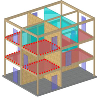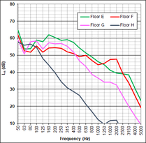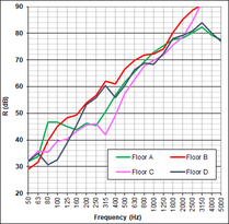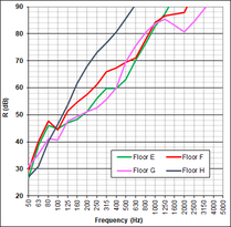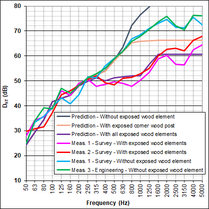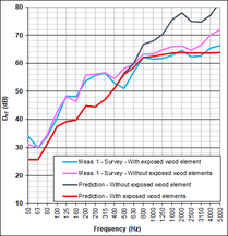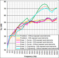 A A A Apparent wood elements and acoustic performance – Feedback from Adivbois CLT building mockup Catherine Guigou-Carter 1 Health and Comfort Department, CSTB 24 Rue Joseph Fourier, 38400 Saint Martin d’Hères, France Nicolas Balanant 2 CERQUAL Qualitel Certification 28 Rue du Rocher, 75008 Paris, France Jean-Luc Kouyoumji 3 FCBA Allée de Boutaut, 33000 Bordeaux, France ABSTRACT The acoustic performance of a CLT based building mockup was investigated within the scope of AdivBois acoustic technical commission with the objective of defining wood building constructions fulfilling requirements. The CLT based building is a three floor construction, with four rooms on each level. Acoustic measurements from junction characterization to air-borne and impact sound insulations have been performed. Apparent wood is supposed to have positive effect on health and well-being on building occupants. This paper concentrates of the effect of apparent wood on the acoustic performance : the apparent wood can be either the underside of the CLT floor (i.e., no suspended ceiling) or posts and beams possibly continuous between different rooms. The measured results are discussed with respect to prediction. A simple approach to take into account the through beams or posts is proposed. Recommendations concerning apparent wood elements in buildings are imparted. 1. INTRODUCTION Wood fixes CO2 during its growth. The new French environmental regulation RE2020, for new buildings applicable from January 1, 2022, promotes the use of renewable materials to store carbon. Used as structural element in construction, where its lifespan is around 100 years, wood is an interesting source of carbon capture. The development of wood in the construction and renovation of buildings is also recognized by the French public authorities as an effective means of contributing to the objectives of the National Low Carbon Strategy. In addition, to achieve the carbon objectives of the Paris 2024 Olympic and Paralympic Games aligned with the Paris Agreement, many projects are developed in wood. 1 catherine.guigou@cstb.fr 2 n.balanant@cerqual.fr 3 jean-luc.kouyoumji@fcba.fr If the lightweight aspect of wood is appreciated for elevations and extensions, in multi-storey buildings, the predictability of the acoustic and vibration performance of lightweight structures requires special know-how. Behavior at low frequencies and flanking transmissions must be monitored with care. Fortunately, research has made much progress in recent years, particularly in France due to the momentum generated within the framework of the ADIVBois project. The aim of the ADIVBois association is to help removing technical and regulatory obstacles and to share the expertise acquired in the field of high-rise wooden constructions, with project owners, project managers and companies. The technical working groups of ADIVBois have carried out work in recent years on the aspects of structure, envelope, fire safety and acoustics. Regarding the acoustic investigation, a laboratory test campaign on the CLT floor was carried out by CSTB in 2018. Then, the project for a life-size mockup of a multi-storey wooden construction was launched at the FCBA in 2019. This new project managed by FCBA was baptized “ADIVBois Acoustic Mockup”; it brings together CSTB, CERQUAL and FCBA. This three-level wooden mockup with four rooms per level was built on the FCBA site in Bordeaux. The mockup is intended to study the floors, the flanking transmissions, and the transmissions via the wooden supporting elements such as posts and beams. 2. Laboratory measurements Laboratory tests have been undertaken with the aim of providing designers of high-rise wooden buildings with examples of separating floors likely to comply with both French regulatory requirements in terms of construction rules, as well as comfort criteria proposed by ADIVBois for dwellings configuration. The following component performances have been retained as a first step • R w +C 58 dB for airborne sound insulation • L n,w ≤ 52 dB et L n,w + C I50-2500 ≤ 52 dB for impact sound insulation Floor solutions with exposed wood on the underside have been investigated, although this configuration is also subject to fire safety constraints and the need to treat flanking transmissions with regard to acoustics. Many floor configurations based on 140 mm thick CLT wood panels, and integrating different types of floating systems and suspended ceilings were also considered. 2.1. CLT floors with apparent underside Several flooring solutions with exposed wood on the floor underside have been tested. Table 1 presents these configurations and their corresponding acoustic performance. It should be noted that the configurations tested do not achieve the targeted performance levels, particularly with regard to impact sound insulation, without the use of a floor covering. A flexible floor covering with a performance of ∆L w 18 dB on a 140 mm thick concrete floor (with in particular ∆L 7 dB at 50 Hz) nevertheless allows the first two floors A and B of Table 1 (point supported screed configuration and gravel configuration) to meet the targeted acoustic objectives. The tests carried out were limited to floor solutions with a thickness of around 30 cm because the elevation constraint is particularly strong for the construction of high buildings. Solutions with concrete fill or honeycomb with granules, for adding mass could achieve the targeted acoustic performance, but this would require increasing the thicknesses of the floor. Figure 1 illustrates the performance of floors in terms of airborne sound insulation and impact sound insulation in one-third octave bands between 50 and 5000 Hz. Table 1: Acoustic performance of CLT floors with apparent underside. Description Composition Performance A 1 – CLT panel 140 mm 2 – Insulation material 80 mm R w +C = 59 dB L n,w = 56 dB L n,w +C I50-2500 = 54 dB 3 – Wood support 100 mm 4 – Resili