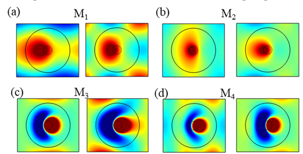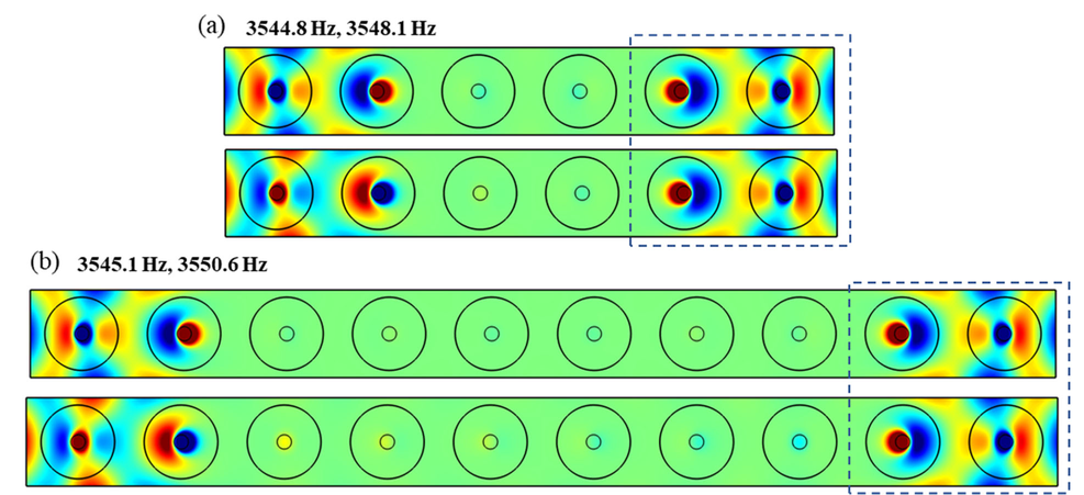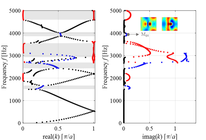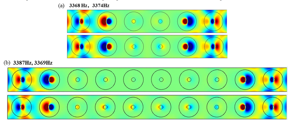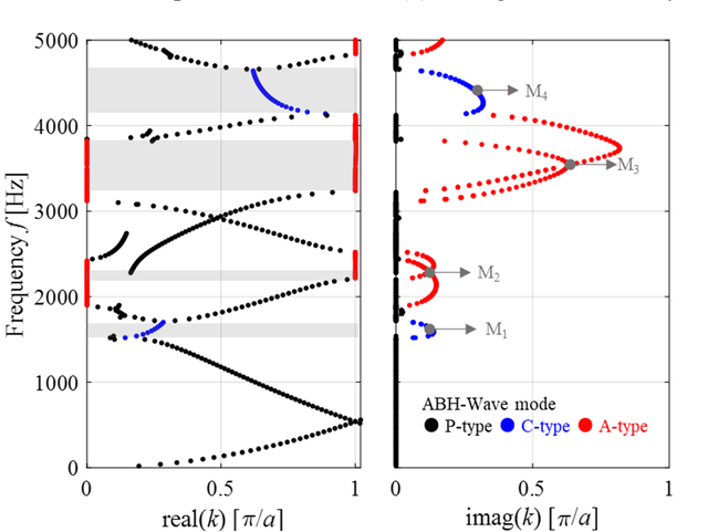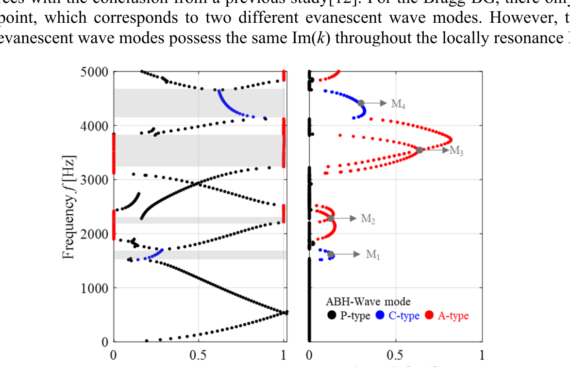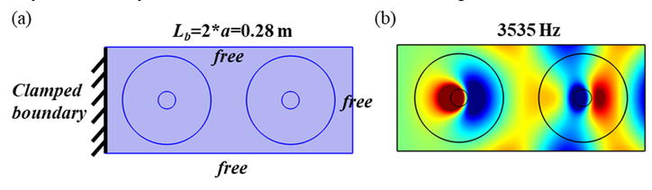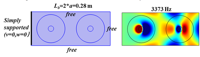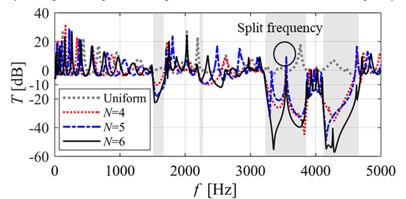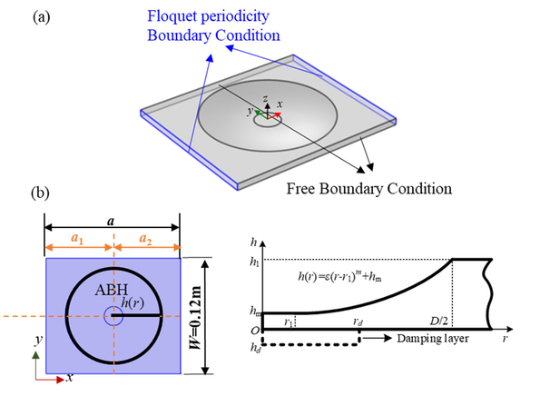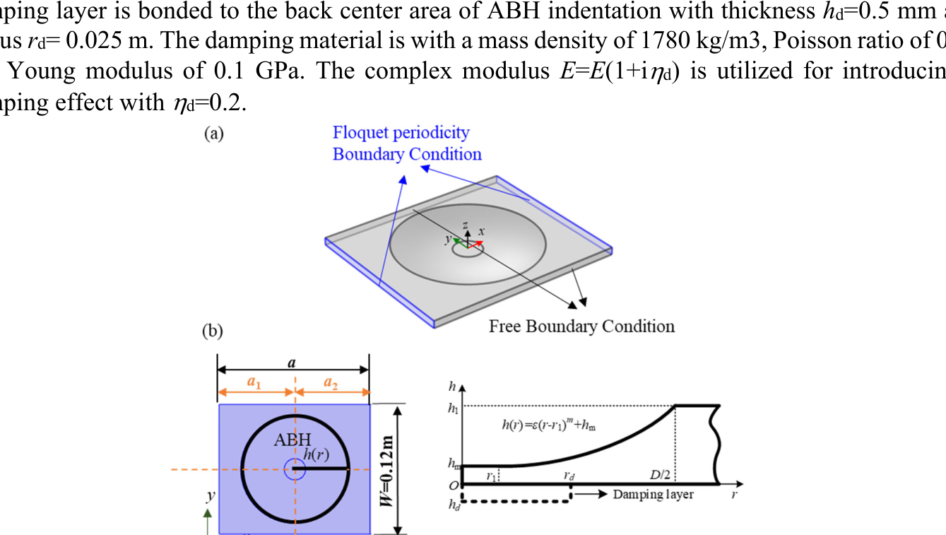 A A A Resonance mode analysis of finite plate strip with acoustic black holes: the gap between bandgap and attenuation band Bing Han, Hongli Ji 1 , Jinhao Qiu State Key Laboratory of Mechanics and Control of Mechanical Structures, Nanjing University of Aeronautics and Astronautics Yudao Street 29, Nanjing 210016 , China Li Cheng Department of Mechanical Engineering, Hong Kong Polytechnic University Hung Hom, Kowloon 999077, Hong Kong, China ABSTRACT Acoustic Black Hole (ABH) lattice structures show promise for achieving broadband bandgap in lightweight design. Existing ABH lattice research usually assumes that the bandgaps of infinite periodic structure are roughly the same as the attenuation band with strong energy attenuation in the finite counterpart. This work is concerned with comparison of the real attenuation bandwidth of finite ABH periodic structures and the bandgap of the infinite counterpart. The plate strips consisting of different numbers of periodic ABH elements are considered in the scenarios with and without additional damping layer. It is observed that the bandgap-predicted attenuation band is split into two narrow attenuation bands, so that the periodic ABHs fails to ensure a broadband and continuous attenuation in the finite scenarios. Results show that there are resonance modes of finite plate strips with ABHs falling into the bandgap due to the boundary reflection and would result in high transmission peaks within the bandgap-predicted attenuation band. This unexpected phenomenon suggests the gap between the attenuation bandwidth of finite periodic structure and the bandgap of the corresponding infinite one. Analysis suggests that the resonance mode of finite plate strips, which reduces the bandgap-predicted attenuation bandwidth, can be predicted and tuned by changing the structure details. 1. INTRODUCTION In recent years, Acoustic black hole (ABH) structures have attracted increasing attention, which, through effective wave manipulation, enable broadband vibration and noise control applications [1- 6]. By tailoring the structural thickness to a power-law variation profile, the ABH acts as a wave trapper to entail a gradual reduction of the phase velocity of flexural waves. As the effect of single ABH is limited by the so-called cut-on frequency [2, 7], efforts were made to extend the effective range of ABH to lower frequencies by proposing ABH lattice structures, just as the well-known phononic crystals (PCs) and acoustic metamaterials (AMMs)[8, 9]. ABH lattice structure was first proposed in one-dimensional (1D) beam structure for bandgap (BG) generation[7, 10]. Subsequently, various 1D ABH configurations, including folded beams [11], composite ABH beam and annular ABHs[5], have been proposed and also investigated numerically and experimentally for improving BG performance, especially for widening BG. Moreover, ABHs were embedded into two- 1 Corresponding author: jihongli@nuaa.edu.cn inter noise 21-24 AUGUST SCOTTISH EVENT CAMPUS GLASGOW dimensional (2D) plates for the same purpose with the consideration of overall structural stiffness [12]. PCs and AMMs commonly realistic structures in practice only contain a limited number of unit cells, contrary to the infinite lattice traditionally used for BG prediction. The corresponding band in the finite lattice offering strong energy attenuation is referred to as attenuation band (AB)[13]. Existing literature has always shown that the two bands, BG and AB, are roughly the same. This offers a very convenient mean for structural design based on BG analysis. In practice, however, the dynamic behavior of the finite structure is influenced by their dimension and the boundary condition. It is inevitable that there exist some resonance modes within the predicted BG range, which impairs the AB performance [14]. The previous researches also showed that these resonance modes can be altered by disturbing the structure details. However, the mechanism behind, which would help to find suitable solutions for eliminating this barrier, remains obscure. Motivated by this, the aim of this work is twofold: (i) to uncover the gap between the AB in a finite 2D ABH lattice and the BG of the infinite counterpart; (ii) to investigate the underlying mechanism. Moreover, considering the general strategy for maximizing the ABH effect by adding a damping layer in the ABH indentation, this work is carried out in both the pure ABH design and the damped one. 2. BAND SRUCTURE OF ONE-DIMENSIONAL PERIODIC ABHs The irreducible unit cell of the considered infinite periodic ABH plate strip is shown in Fig. 1. In the one-dimensional scenario, the Bloch-Floquet boundary conditions are imposed at the pair of boundaries perpendicular to the x -axis, as marked in Fig. 1(a). In this work, each periodic cell contains an ABH indentation with diameter D =0.1 m along the central line of the strip. Taking the center of the ABH as the origin of the local coordination, the thickness variation along the radial direction of the ABH is defined by h ( r ), expressed in Fig.1(b), with a minimum thickness h m of 0.5 mm and power exponent m =2. By default, the center of the ABH satisfies the parameter relationship a 1 = a 2 to construct a symmetric unit cell. The uniform part of the plate strip is 5.18mm thick. The plate is made of aluminum with a mass density of 2820 kg/m3, Poisson ratio of 0.33 and Young modulus of 71GPa. As the ideal ABH effect is unrealistic, the dissipation materials are usually combined with ABH design for practical application[15-17]. Therefore, with lattice constant a =0.14 m, the damped ABH unit cell is also investigated, apart from the pure ABH unit cell. As illustrated in Fig. 1(b), a free damping layer is bonded to the back center area of ABH indentation with thickness h d =0.5 mm and radius r d = 0.025 m. The damping material is with a mass density of 1780 kg/m3, Poisson ratio of 0.45 and Young modulus of 0.1 GPa. The complex modulus E = E (1+i d ) 