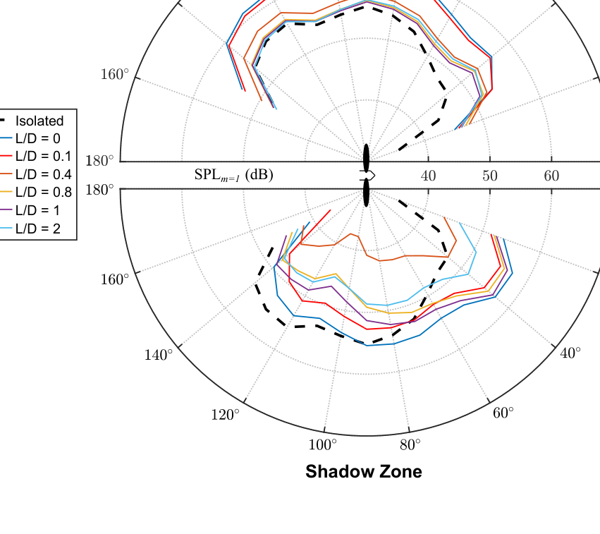 A A A Acoustic Shielding and Scattering E ff ects of a Propeller Mounted Above a Flat Plate Liam Hanson 1 PhD Candidate Department of Mechanical Engineering, University of Bristol, Queens Building, University Walk, Bristol, BS8 1TR, United Kingdom Kabilan Baskaran 2 Research Associate Department of Mechanical Engineering, University of Bristol, Queens Building, University Walk, Bristol, BS8 1TR, United Kingdom Bin Zang 3 Lecturer Department of Aerospace Engineering, University of Bristol, Queens Building, University Walk, Bristol, BS8 1TR, United Kingdom Mahdi Azarpeyvand 4 Professor of Aerodynamics and Aeroacoustics Department of Aerospace Engineering, University of Bristol, Queens Building, University Walk, Bristol, BS8 1TR, United Kingdom ABSTRACT Experiments were carried out within an aeroacoustic wind tunnel facility to investigate acoustic scattering and shielding e ff ects of a propeller being placed above a semi-infinite flat plate. The position of the flat plate trailing edge was adjusted relative to the propeller which was tested in static conditions with a constant rotational rate of 5000 RPM. Far-field noise was collected by a pair of microphone arcs in the reflection and shadow zone regions respectively. E ff ects of installation on the overall sound pressure level and first blade passing frequency tone was studied. Moreover the magnitude-squared coherence and cross spectrum phase data between selected microphone pairs were analysed. Significant amplification and attenuation can be observed with changing relative locations due to complex acoustic interactions between the propeller and flat plate surface and trailing edge. There are locations with significant potential for noise attenuation and directivity manipulation in terms of tonal and broadband noise content of the propeller. Appreciable changes in 1 liam.hanson@bristol.ac.uk 2 kabilan@iitism.ac.in 3 nick.zang@bristol.ac.uk 4 m.azarpeyvand@bristol.ac.uk a slaty. inter.noise 21-24 AUGUST SCOTTISH EVENT CAMPUS O ¥, ? GLASGOW the first blade passing frequency phase was seen when installed cases were compared to the baseline isolated propeller case. Reductions of up to 16.3 dB in the first blade passing frequency tone due to the presence of notable shielding were observed. 1. INTRODUCTION With the push towards greener aviation, electrification of aircraft is being pursued by governments, industry and academia worldwide [1]. Design choices as a result of these e ff orts are increasingly capitalising on the numerous potential benefits of propeller-based propulsion architectures. Unlike conventional jet fuel powered aircraft, where jet fuel consumption will reduce the weight during flight, electric battery powered aircraft masses will remain constant [2]. A benefit of propellers is their low thrust specific fuel consumption which when paired with current limitations on battery storage and weight is vital for increasing the range of aircraft [3]. Concepts such as Leading Edge Asynchronous Propellers Technology (LEAPTech) which consists of multiple tractor propellers mounted at the leading edge of a wing have drawn attention through increasing the maximum lift coe ffi cient of aircraft; o ff ering maximum range at cruise conditions while maintaining takeo ff and landing performance [4]. Engine failure in these concepts could have severe impacts on the stall behaviour of the aircraft [5] along with a noise penalty associated with the design [6]. As such, concepts such as a wing trailing edge mounted distributed propulsion system have been proposed [5]. Through positioning propellers on aircraft wings, complex aerodynamic and acoustic interactions of propellers with wing and airframe structures will be introduced. Noise generated by the propellers will radiate and interact with any adjacent structures leading to scattering of the sound waves produced. In addition, by incorporating structures such as wings as a physical barrier between the propeller noise source and the ground, potentially beneficial acoustic shielding e ff ects can minimise the noise generated by engines and propellers and alter the directivity and magnitude of the noise generated. Many existing studies explore the aerodynamic and aeroacoustic performance of isolated propellers in various modes of operation such as in hover, transition and forward flight [7–9]. Limited existing literature considers the noise scattering and shielding e ff ects due to interactions between propellers and wings or the more fundamental case of propeller-flat plate interactions. Agarwal and Dowling [10] utilised boundary element calculations using a point monopole source above two dimensional geometries and a three dimensional "Silent Aircraft" geometry to evaluate acoustic shielding e ff ects for low frequencies. Their results indicated a significant amount of shielding can be obtained in the shadow region where there is no direct line of sight between the noise source and observer. Müller et al. [11] also utilised boundary element method simulations to evaluate an over-the-wing propeller configuration and compared its performance to a conventional tractor setup in cruise conditions. Their simulations showed a reduction of 6 dB in the SPL on the ground when compared to a conventional configuration. Stephens and Envia [12] explored the barrier theory and half-plane di ff raction theory for shielding attenuation by conducting experiments with an open rotor positioned over a simplified wing. They found a short barrier positioned near the open rotor could provide up to an 8.5 dB reduction of noise at some directivities with tonal noise shielded in particular. Neither of the theories they compared to gave accurate results; over-predicting the attenuation levels. More recent studies by Viera et al. [13] investigated experimentally the level of shielding and directivity of the noise source and its relation to the shielding body geometry. Their experiments considered a monopole source shie