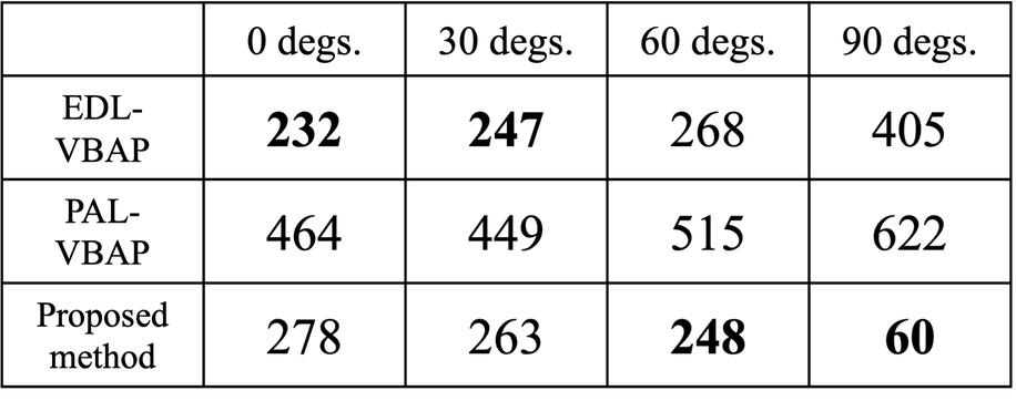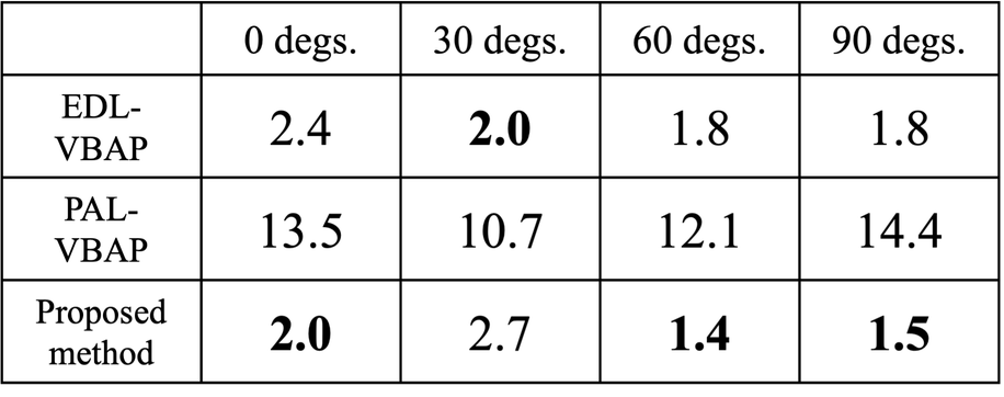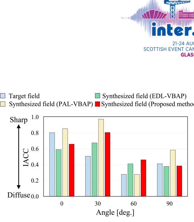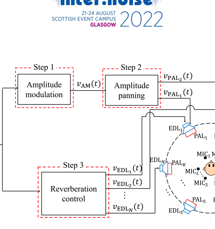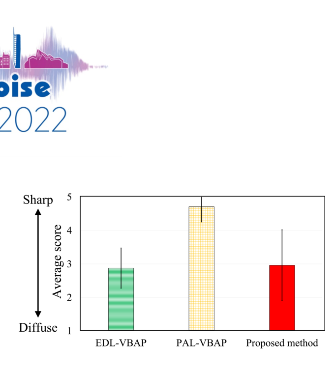 A A A Volume : 263 Part : 5 Subjective evaluation for sharp sound image construction based on reverberation control with surround sound system using parametric and electro-dynamic loudspeakers Yuna Harada 1 Graduate School of Information Science and Engineering, Ritsumeikan University 1-1-1 Nojihigashi, Kusatsu, Shiga 525-8577, Japan Yuting Geng 2 , Kenta Iwai 3 College of Information Science and Engineering, Ritsumeikan University 1-1-1 Nojihigashi, Kusatsu, Shiga 525-8577, Japan Masato Nakayama 4 Faculty of Design Technology, Osaka Sangyo University 3-1-1 Nakagaito, Daito, Osaka 574-8530, Japan Takanobu Nishiura 5 College of Information Science and Engineering, Ritsumeikan University 1-1-1 Nojihigashi, Kusatsu, Shiga 525-8577, Japan ABSTRACT Three-dimensional sound-field reproduction systems can provide a high sense of presence. These systems commonly use electro-dynamic loudspeakers. Such loudspeakers tend to construct di ff use sound images due to their wide directivity and high reverberation. In contrast, parametric array loudspeakers can construct sharp sound images due to their sharp directivity and low reverberation. However, it is di ffi cult to provide reverberation presence when using parametric array loudspeakers because of this sharp directivity. We previously proposed a sharp sound image construction method that is based on reverberation control with a surround sound system using parametric and electro- dynamic loudspeakers. With this method, a sharp sound image is rendered using parametric array loudspeakers, and reverberation presence is provided by electro-dynamic loudspeakers, emitting reverberation signals synthesized with reverberation control filters. Through objective experiments, we confirmed that this method can construct a sharp sound image with reverberation presence. In this paper, we propose a sharp sound image construction method, which is based on our previous method, to construct a sharp sound image at any desired position. We conducted subjective evaluations to confirm if listeners can perceive the reverberation presence provided with the proposed method. From the subjective evaluation, we confirmed that the reverberation presence can be perceived. 1 is0426sh@ed.ritsumei.ac.jp 2 geng@fc.ritsumei.ac.jp 3 iwai18sp@fc.ritsumei.ac.jp 4 nakayama@ise.osaka-sandai.ac.jp 5 nishiura@is.ritsumei.ac.jp Min aussi, inter.noise 21-24 AUGUST SCOTTISH EVENT CAMPUS GLASGOW 1. INTRODUCTION With the development of video technology, three-dimensional (3D) sound-field reproduction systems that can provide a high sense of presence have attracted attention. Conventional systems commonly use electro-dynamic loudspeakers (EDLs) [1], therefore, the sound image is di ff used when constructing a narrow sound image such as a point source [2]. Conventional systems with parametric array loudspeakers (PALs) [3] have been proposed, such as acoustic planetarium [4] and multichannel surround systems with PALs and EDLs [5]. PALs can produce sharper directivity than EDLs by using the straightness of ultrasound. PALs can construct a sharp sound image [5]; however, it is di ffi cult to present reverberation [2]. It is also di ffi cult to reproduce the low-frequency sounds with PALs [3]. In the acoustic planetarium [4], sound images can be rendered on walls and ceilings by the reflected sounds emitted from PALs. It is di ffi cult to present reverberation with PALs, so it is conceivable to add reverberation with EDLs. However, the acoustic planetarium requires reflective objects such as walls and ceilings, and it is di ffi cult to construct a 3D sound source at any position in the air. In surround sound systems with PALs and EDLs [5], loudspeakers are placed around the listener. PALs are used to create a sharp sound image in the air, and EDLs are used to reproduce low-frequency sounds, which are di ffi cult to reproduce with PALs. Such surround systems can achieve sharp sound images with high sound quality. However, the systems cannot reproduce reverberation because reverberation is not taken into account, and the sense of presence degrades. We previously proposed a method for 3D sound-field reproduction to achieve both sharp sound image and reverberation presence by combing PALs and EDLs in a surround sound system [6]. With this method, a sharp sound image is rendered using a single PAL, and reverberation presence is provided by EDLs. In this paper, we propose a sharp sound image construction method, which is based on previous method, for constructing a sharp sound image [2] at any desired position. Two PALs are used with the proposed method for sharp sound image rendering instead of a single PAL. The EDLs provide reverberation presence by emitting reverberation signals synthesized with reverberation control filters, which is the same as our previous method. The reverberation control filters are designed to reproduce the reverberation time [7] and direct-to-reverberation ratio (DRR) [7] of the target field in other environments. To demonstrate the e ff ectiveness of the proposed method, we carried out objective and subjective evaluations on the reverberation, sharpness, and direction of a sound image. 2. PROPOSED SURROUND SOUND SYSTEM WITH PALS AND EDLS With the proposed method, we focus on the reverberation time and DRR [7] among room acoustical parameters because they represent reverberation characteristics. The method achieves both sharp images and reverberation presence by combing PALs and EDLs in a surround sound system. Sharp sound images are rendered using PALs, and reverberation presence is provided by EDLs. We design filters to reproduce the reverberation time and DRR of the target field in other environments by generating indirect sounds. Therefore, the proposed method can reproduce the sharp sound image of the target field. Figure 1 shows an overview of the proposed method. In this figure, l ( l = 1 , 2 , . . . , L ) denotes the index of control points, k ( k = 1 , 2 , . . . , K ) den