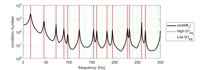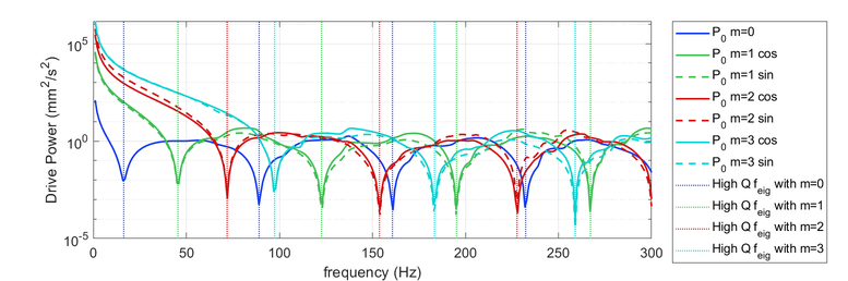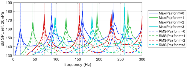 A A A Analysis and Control of Acoustic Modes in Cylindrical Cavities with application to Direct Field Acoustic Noise (DFAN) Testing Jonathan A. Hargreaves 1 Acoustics Research Group Newton Building, University of Salford, Salford, M5 4WT, United Kingdom ABSTRACT It is well known that acoustic cavities have frequencies at which certain free-response ‘modes’ of propagation respond especially strongly. In the absence of significant damping, these cause peaks of high SPL in the frequency response as well as spatial non-uniformity and temporal ringing. The spatial non-uniformity is especially problematic since it means the room cannot be ‘EQ’d’ to compensate, since the SPL is different in different positions. This phenomenon has been studied extensively in the room acoustics literature and various strategies for mitigation proposed. Many of these make use of the theoretical mode shapes for a cuboid with a rigid boundary condition, since this is a common shape of room and a reasonable approximation for a solidly constructed wall. But modes exist for other shape spaces too. Of particular interest is the cylindrical cavity that is formed when large enclosing arrays of loudspeakers are used to perform high-intensity acoustic tests on space hardware. These possess problematic modes that can cause over-testing in some positions and under-testing in others. In this work, it is investigated how a simple FEM simulation can compute Q-factors for these modes and identify which will be problematic. How this might inform control system design is discussed. 1. INTRODUCTION 1.1 Modal Control in Room Acoustics A room modifies sound, changing its frequency content and temporal structure [1]. This may cause musical notes to be emphasised or deemphasised and/or speech to become unintelligible. At low frequencies, ‘room modes’ are problematic. These can cause significant variation in SPL versus frequency and ringing artefacts, which have an audible effect on reproduced music [2]. There is an extensive body of literature covering strategies to mitigate these effects. As well as room sizing and passive absorption [1], electroacoustic solutions have been suggested. Typically, this involves considering the placement of loudspeakers relative to the mode shapes of a room, since these affect the positions from which modes are excited as well as where they are heard. Welti and Devantier compared a variety of configurations and used a metric based on standard deviation of SPL to rank their performance [3]. This is a useful metric because SPL variation versus frequency can be EQ’d for (in principle), but SPL variation versus position cannot. Celestinos and Nielsen [4] proposed symmetrical arrays of subwoofers at opposite ends of a cuboid room – each arranged to nullify lateral modes up to some given order – which are then driven with a delay designed to nullify end-to-end modes. Hargreaves and Wankling [5] implemented this scheme in a cuboid listening room, where it eliminated all modal effects below 75Hz and reduced the range of SPL variation (versus frequency and position) from around 25dB to within ±3dB post-EQ, a significant improvement. Recently, a method has been proposed based on a similar idea (nullifying the back wall reflection) but which attempts to do this adaptively for any incident sound field [6]. 1 j.a.hargreaves@salford.ac.uk 1.2 Direct Field Acoustic Noise (DFAN) Testing Similar challenges present themselves in Direct Field Acoustic Noise (DFAN) Testing 2 . This is a technology developed for high-intensity acoustic testing, typically for qualification and pre-flight testing of satellite designs [7]. This testing aims to recreate the intense acoustic field the payload will be subjected to at launch in a controlled way in the laboratory, to validate a design and show it should complete its journey to orbit without damage. It has, therefore, become a mandatory part of the pre-flight testing process and is stipulated in launcher manuals for all payloads. The most established way of conducting these tests is using a reverberation chamber. Like their counterparts in building acoustics, these aim to subject the test article to a diffuse sound-field, a chaotic field in which acoustic waves arrive from every direction with equal power. This is chosen to ensure that any possible pattern of excitation which the test article might be especially sensitive to is included in the exciting sound field, i.e., it always includes the worst case. Testing for aerospace applications adds a requirement for Sound Pressure Levels (SPLs) that are enormously higher, usually requiring gas-powered electro-pneumatic noise sources mounted on giant horns. This, combined with the large size of the chambers, is a significant infrastructure investment. It also requires large delicate payloads to be transported to these facilities. An alternative approach is to use loudspeakers to generate the sound field. This approach is called DFAN, since the intention is that the ‘Direct’ sound field from the loudspeakers dominates over the reverberant sound from the enclosing room. A major advantage of this approach is portability – the test system can be brought to the test article. Established best practice is to use a cylindrical array of loudspeakers encircling the test article. This subjects it to acoustic excitation from all angles – horizontally at least – while avoiding the risks associated with suspending heavy loudspeakers above a multi-million-dollar payload. The aim is to produce the same diffuse field that a reverberation chamber would, since this is the condition that standards, launcher manuals and customers require. Arguably, DFAN is capable of much more than this – if every loudspeaker were controlled individually then it would implement Wave Field Synthesis [8] – and the launch environment inside a fairing has been shown to not be truly diffuse [9], but presently the demand is for diffuse fields and 