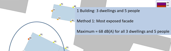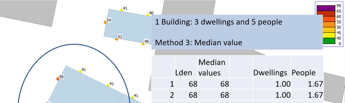 A A A The three methods of calculating population exposure according to CNOSSOS-EU Erwin Hartog van Banda 1 DGMR Software / Softnoise Casuariestraat 5, Den Haag – The Netherlands ABSTRACT In December 2020, the EU commission published amendments on CNOSSOS-EU in report ‘C(2020) 9101 final’. In this report an additional method for the calculation of population exposure is described, based on a Median value. In the original CNOSSOS document, 2 methods are described, Method 1 – Most exposed façade and Method 2 – Length of representative façade. Method 1 is used for buildings that represent a single dwelling or 1 dwelling per floor. Method 2 is used for apartment buildings that have dwellings with a single façade exposed to noise. The new Method 3 can be used for apartment buildings that have more than 1 façade exposed to noise, or for apartment buildings where no information on how many facades are exposed to noise is available. It will be difficult for authorities to create a dataset that distinguishes between a single façade and multiple façades exposed to noise. Therefore, it seems likely that Method 3 will be more frequently used. When comparing Methods 2 and 3, it is found that Method 3 leads to a higher number of exposed people and dwellings. In this paper the 3 methods are explained and compared using noise and population data for a city in Europe. 1. INTRODUCTION In 2022 all EU member states are obliged to use CNOSSOS-EU [1] for their strategic noise mapping projects. A strategic noise mapping project starts with getting GIS data of the area involved. This includes data for buildings, roads, railways, industry etc. This data is then imported into a noise mapping software. The next step is to create and calculate receiver points around the facades of residential buildings and assign these noise levels to the people and dwellings of these residential buildings. In this way the population exposure in number of people and dwellings in 5 dB noise classes can be determined. These numbers will then be reported to the EU commission. This paper starts with a general overview of the project flow of a CNOSSOS-EU noise mapping project, then shortly describes the 2 methods for creating the receiver points and then explains the 3 methods on determination of the population exposure. Finally the 3 methods on determination of the population exposure are compared using noise and population data for a city in Europe. 1 ha@dgmr.nl Wr 3) sax al a. inter noise 21-24 AUGUST SCOTTISH EVENT CAMPUS ? O ? ? GLASGOW 2. PROJECT FLOW CNOSSOS-EU NOISE MAPPING PROJECT In Figure 1 a possible project flow for a strategic noise mapping project is presented. Figure 1: Project flow CNOSSOS-EU noise mapping project In the following chapters step 2 (Create Receivers at Façades) and step 6 (EU population exposure) are further explained 3. CREATE RECEIVERS AT FACADES The first step on determination of the noise exposure is to calculate the noise levels for receivers that are located at 0.1 m in front of the facades of residential buildings. CNOSSOS presents 2 cases, Case 1 and Case 2, on how to create these receivers points. In Case 1 façades are split up in regular intervals on each façade with a maximum distance of 5 meter. Receiver points are placed in the middle of each interval. In Case 2 façades are split up at set distance of 5 meter from start of polygon, with a receiver point placed at the halfway distance of the 5 meter distance and halfway the remaining distance. In Figure 2 examples of each case are presented. Figure 2: Examples of location of receiver points around a building following Case 1 (left) and Case 2 (right) procedures CNOSSOS does not provide further information on when to apply Case 1 or Case 2. For this paper we have used Case 1. GIs Noise maping software HP files Buildings + Roads + Ground cover Address points + Height lines SI Main model Calculate tiles Main model 1. Import is 5. Import tiles in main model 2. Create Receivers at 6. EU population facades exposure 3. Tile main 4. Local Calculation | |7. Export to model or Cloud Calculation Excel/GIS Excel / GIS NOISE EXPOSURE Cloud Calculation 4. THE THREE METHODS OF CALCULATING POPULATION EXPOSURE After calculating the noise levels at the receivers these noise levels must be assigned to dwellings and people. The CNOSSOS method describes 3 methods for assigning dwellings and people to receiver points. Method 1: Most exposed facade “ Where information on the location of dwellings within building footprints is available, that dwelling and the people living in that dwelling are assigned to the receiver point at the most exposed façade of that dwelling. For example, for detached houses, for semi-detached and terrace houses, or apartment buildings, where the internal division of the building is known, or for buildings with a floor size that indicates a single dwelling per floor level, or for buildings with a floor size and height that indicates a single dwelling per building ”. Method 2: Length of represented facade “ Where no information on the location of dwellings within building footprints as explained above is available, one of the two following methods shall be used, as appropriate, on a building by building basis to estimate the exposure to noise of the dwellings and people in dwellings within the buildings. (a) Available information shows that dwellings are arranged within an apartment building such that they have a single façade exposed to noise In this case, the allocation of the number of dwellings, and people living in dwellings, to receiver points, shall be weighted by the length of the represented façade according to the procedure under either Case 1 or Case 2, so that the sum of all receiver points represents the total number of dwellings and people living in dwellings assigned to the building .” Method 3: Median value “(b) Available information shows that dwellings are arranged within an apartment buildin