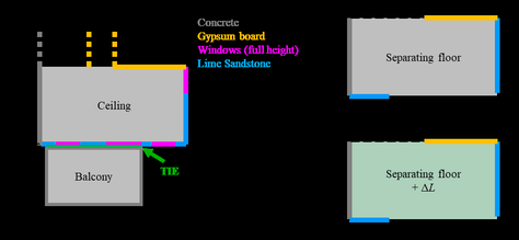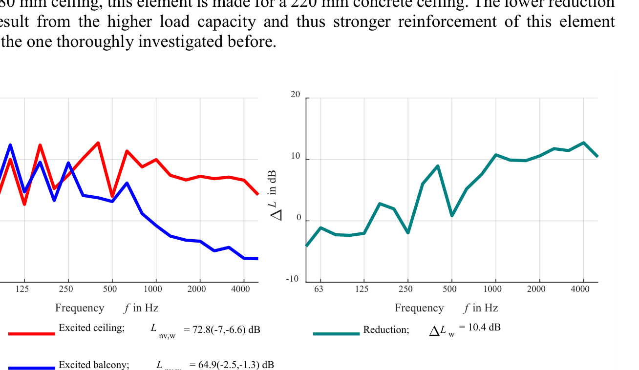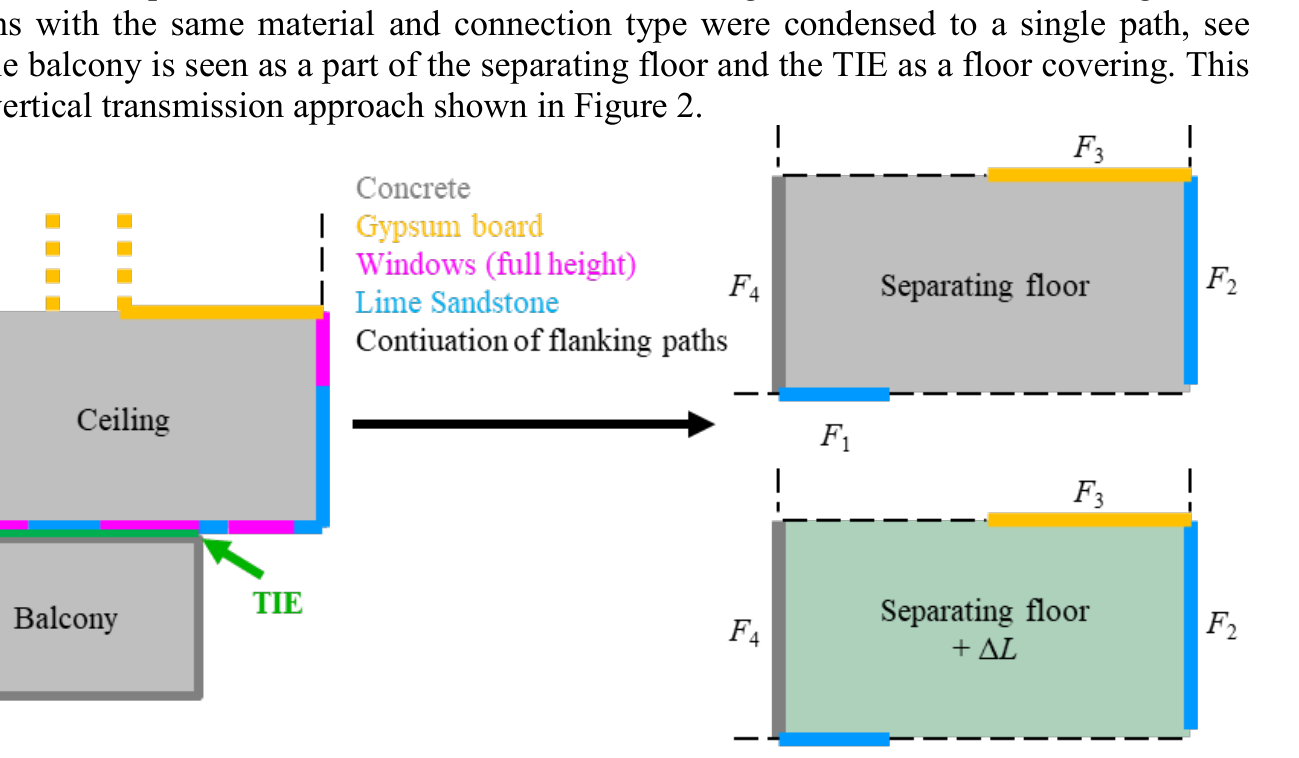 A A A Impact Sound Insulation of thermally insulated Balconies Lucas Heidemann 1 University of Applied Sciences Stuttgart Schellingstrasse 24 70174 Stuttgart, Germany Jochen Scheck 2 University of Applied Sciences Stuttgart Schellingstrasse 24 70174 Stuttgart, Germany STEP GmbH Brückenstrasse 9, 71364 Winnenden, Germany Berndt Zeitler 3 University of Applied Sciences Stuttgart Schellingstrasse 24. 70174 Stuttgart, Germany ABSTRACT With the increasing urban densification, balconies are gaining in popularity as they improve the living quality in homes. Thermal insulation between balconies and the building’s façade is state of the art. In Germany the most popular balcony construction is a reinforced concrete balcony, separated from the building by a thermal insulation element (TIE), which is meant to reduce the thermal energy loss and thus ensure the sustainability of buildings. The impact sound transmission from balconies, however, is a problem that has not been addressed enough to date. The main goal of the project is to provide acoustic quantities, e.g., an impact sound reduction, for a TIE that can be used to compare the acoustical quality of products and to predict the impact sound pressure levels within the building using the standard EN ISO 12354-2. Experimental and numerical studies have been carried out on various ceiling-balcony mock-ups without and with TIEs e.g., by means of experimental modal analysis and finite element models. This paper will show the effect that various parameters have on the impact sound insulation. Additionally, the measurements on the test set-up will be compared to measurements on building sites. 1. INTRODUCTION The increase in airborne sound insulation against outdoor noise, achieved by the development of higher quality walls and windows, leads to an increased sensitivity of the inhabitants towards noise that is generated by neighbours. Furthermore, outside areas of flats, such as balconies, are becoming more popular, which leads to higher impact sound immission that can cause disturbances. These two points were considered in 2018, when the German standard of requirements on sound insulation in buildings DIN 4109 [1] was revised. This standard now contains requirements for balconies on the 1 lucas.heidemann@hft-stuttgart.de 2 jochen.scheck@hft-stuttgart.de 3 berndt.zeitler@hft-stuttgart.de a Shea mar ce 21-24 AUGUST SCOTTISH BENT caso normalized impact sound pressure level as L ’ n,w ≤ 58 dB. However, for loggias, which are often difficult to differentiate from balconies in modern buildings, the requirement is L ’ n,w ≤ 50 dB. In Germany the most popular balcony construction is a reinforced concrete balcony, separated from the building by a thermal insulation element (TIE) meant to reduce the thermal energy loss. The design of the TIE is primarily based on static requirements. The elements consist of reinforced bars and thrust bearings, sheeted by thermally insulating material such as extruded polystyrene. The main goal of this research project is to provide characteristic acoustical values for a TIE that can be used to compare products and to predict the sound transmission in buildings. A first step to achieve this is to, through measurement and numerical investigations, understand the structure-borne sound transmission through these TIEs. DIN 4109 contains a method using single number values and vibration reduction indices to predict the impact sound transmission in buildings. Material parameters of the building elements are thereby used as “input parameters”. This method can be applied to balconies in the same way as currently done for floors, namely according to Part 2 of the German standard [2], however currently no standardized laboratory test procedure exists to determine the “input value” for the balconies, although the draft for a European Assessment Document, which includes one of the later presented methods is already published [3]. This testing procedure shall also provide values for a frequency dependent prediction following the international standard for building acoustics EN 12354-2 [4]. This paper describes the development of the testing procedure and an approach to predict the impact sound transmission of balconies. 2. STRUCTURE BORNE SOUND TRANSMISSION FROM BALCONIES IN BUILDINGS The most relevant requirements of impact or structure borne sound transmission from balconies are along the diagonal path into an adjacent room of a second unit as shown in Figure 1. If the balcony is not separated from the building using a TIE, it can be treated as a ceiling. Own unit (outer area) Own unit (inside) Thermal insulating element Adjacent unit (inside) Figure 1: Diagonal impact sound transmission of a thermally insulated balcony into a receiving room of an adjacent unit. The prediction can then be done according to ISO 12354-2 [4], considering the sound transmission of each direct and first-degree flanking path. This method allows a prediction both with single number values and frequency dependent values. For the diagonal transmission two approaches can be chosen. In this paper the model for vertical impact sound transmission is used (Figure 1, Figure 2). The resulting normalized impact sound pressure level is calculated considering the ceiling and all flanking transmission paths according to Equation (1). The separating building element is the ceiling and the number of flanking paths is determined by the number of radiating walls. The TIE is then considered as a reduction of the direct path and all paths that contain the ceiling, in analogy to a floating floor. Another way to predict the diagonal transmission from the balcony is to use the EN 12354-2 model for horizontal transmission where only two flanking paths are considered. The effect of the TIE is then described by an insertion loss on the flanking path that contains the ceiling (Figure 3). 𝐿𝐿 n ′ = 10 lg ൭10 𝐿 𝐿 n,d 10 + 10 𝑛𝑛 ൱ in dB (1) 𝐿 