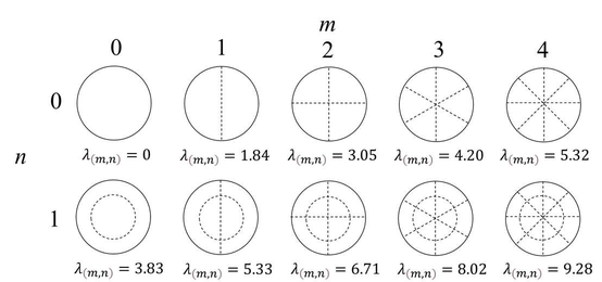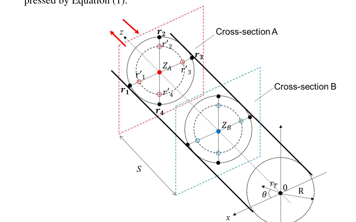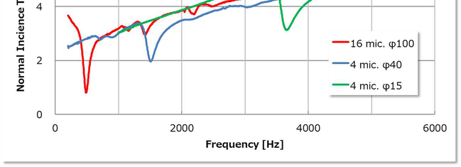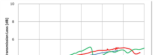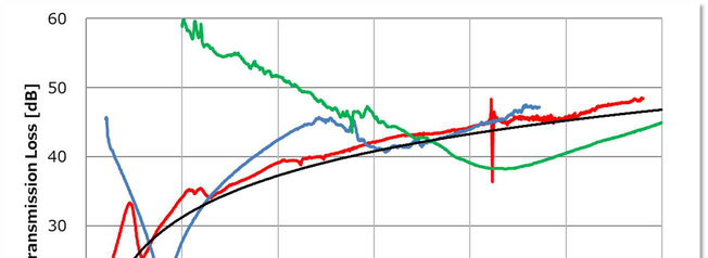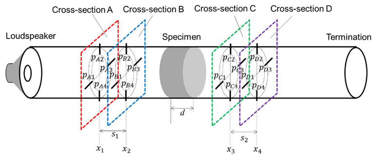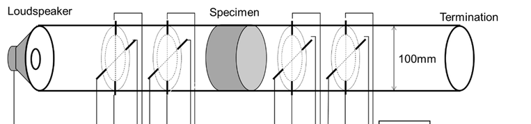 A A A Extension of frequency range of the sixteen-microphone method in normal-incidence sound transmission loss measurement Hiroshi Nakagawa 1 Nihon Onkyo Engineering Co., Ltd. 1–21–10 Midori, Sumida-ku, Tokyo, 130–0021 Japan Akira Sanada 2 Industrial Technology Center of Okayama Prefecture 5301 Haga, Kita-ku, Okayama, 701–1296 Japan ABSTRACT This study deals with development of a high-frequency measurement method of normal incidence sound transmission loss using acoustic impedance tube. On ordinary transfer-function method, meas- urable frequency of the method is limited by the diameter of the tube. Authors have developed eight microphone method to measure normal incidence absorption coefficient. This technique lays 4 mi- crophones on the same cross section and cancels rotational acoustic modes. This makes it possible to measure normal incidence absorption coefficient up to three times the upper frequency of the or- dinary two microphone method. In this study, authors apply the same technique to normal incidence transmission loss measurement using 16 microphones. 1. INTRODUCTION • Normal-incidence sound absorption coefficient [1] and normal-incidence transmission loss [2] measurements using acoustic impedance tubes are widely used to evaluate the sound absorption and insulation properties of porous materials and to validate analytical models, because these measurements can be made with a smaller sample size and in a shorter time with simpler opera- tions than measurements using reverberation rooms. However, conventional measurements using acoustic impedance tubes assume a plane wave sound field, so the upper frequency limit depends on the inner diameter of the tube. Therefore, to measure higher frequencies, measurements must be made with smaller tubes, which requires smaller samples. This causes variations due to cutout areas caused by material inhomogeneity, variations in measurement results due to cutout accu- racy, and the effects of constraint conditions when setting the material in the tube. To make meas- urements at higher frequencies, Schultz et al. [3] have tried to use modal decomposition, but this is a complicated procedure. Therefore, Sanada [4-6] proposed an eight-microphone measurement method that can easily extract only the normal component, enabling measurement of normal in- cidence sound absorption coefficients up to frequencies almost three times higher than those of conventional methods. In this paper, the eight-microphone method applied by Sanada for sound 1 hiroshi_nakagawa@hibino.co.jp 2 akira_sanada@pref.okayama.lg.jp inter.noise. 21-24 AUGUST SCOTTISH EVENT CAMPUS ? O? ? GLASGOW absorption coefficient measurements is extended and applied to transmission loss measurements with sixteen microphones. 2. THEORY 2.1. Sound Field in cylindrical Tube In this paper, we consider a cylindrical tube with radius R [m] (Figure 1). The sound field is ex- pressed by Equation (1): Figure 1: Sound field in the tube. sectionA _ Cross -section B Cross: , , , Ψ , , , (1) # , , ! Ψ # # , !$ %& , , is the distance from the center of the cylindrical cross section, θ is the angle from x-axis and Ψ , , Ψ # , are the functions representing acoustic modes in the cross section of the tube and are expressed by Equations (2) and (3): , , ' , ( ) *, ! + (2) Ψ , , ' , ( ) *, ! + (3) Ψ # inter.noise. 21-24 AUGUST SCOTTISH EVENT CAMPUS ? O? ? GLASGOW m and n are the orders of the acoustic modes in the cross section in the circumferential and radial directions, respectively; ( is the Bessel function of the first kind, and ' , is the normalization constant that satisfies the orthogonality of equations (4) and (5) among the acoustic modes: ⬚ Ψ #∗ 2 3 4, 5 , 6 7 (4) , Ψ ./ 1 ⬚ Ψ #∗ 0 3 9 4 : 5 9 : 6 9 7 (5) , Ψ ./ 1 where S is the cross-sectional area of the cylindrical tube; , , # , and # are the amplitudes of the waves of the (m, n) mode; ) , is the wave number of the (m,n) mode in the z-direction, expressed as ) , ) ; < ) *, ; ! = ; > , where ) = ω @ > ( @ : sound speed), and ) *, is the wave number in the cross-section of the cylindrical tube, which satisfies the bound- ary condition at the inner surface of the tube. ) *, A that satisfying the boundary condition is denoted as B , . The value of B , as shown in Figure 2. The (0,0) mode represents a plane wave propagating along the z-axis, and the other higher-order modes represent sound waves prop- agating obliquely to the z-axis. The obliquely propagating waves for which ) C ) *, cannot propagate in the tube because the wave number becomes purely imaginary and the wave becomes evanescent. Therefore, the minimum frequency at which the 5, 6 mode can propagate is: " OCS8®e@ Aonn) =O — ann) = 1:84 Ramm) = 3.05 Amn) = 4.20 Amn) = 5:32 enn) = 3:83 Aomn) =5:33 Aum) = 6.71 ann) 8.02 Amn) = 9.28 F , G D E, ;HI (6) which is the so-called cut-on frequency of the mode. In the conventional standard transfer func- tion method, measurement is conducted under conditions where only the 0,0 mode can propagate in the tube. Thus, the upper frequency limit is less than the frequency below the (1, 0) mode. For example, for a 100 mm diameter tube, the theoretical upper measurement frequency is D E=, = 2013 [Hz] at temperature 20 °C. Figure 2: Acoustic mode in the cross-section of the tube. 2.2. 8 Microphone Method for Absorption Coefficient Measurement Sanada [4-5] showed that three circumferential modes of a cylindrical tube, (1,0), (2,0), and (3,0), can be canceled by placing microphones at four locations at 90-degree intervals on the same cross section and obtaining the sum of their sound pressure, as in Equation (7): inter.noise. 21-24 AUGUST SCOTTISH EVENT CAMPUS ? O? ? GLASGOW J K L M N L M O L M P L M Q 4 S S ! %& (7) • Furthermore, it was shown that by placing the microphone not on the wall of the acoustic tube but at the node of the (0,1) mode in the radial direction, the (0,1) mode is no longer detected, so that only sound wa