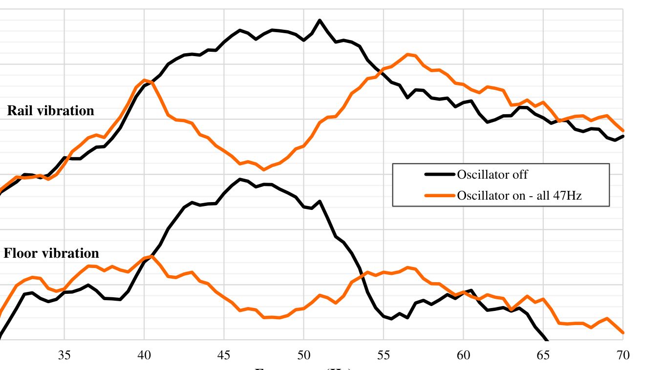 A A A Railway ground borne noise (GBN) reduction by rail dampers Wilson HO 1 , Max YIU 2 , Ron WONG 3 Jabez Innovation Limited Unit 601, Block A, Shatin Industrial Centre, Sha Tin, N.T., Hong Kong Ghazaleh SOLTANIEH 4 , Yi-Qing NI 5 The Hong Kong Polytechnic University Hong Kong Branch of National Rail Transit Electrification and Automation Engineering Technology Research Center, Hong Kong SAR, China ABSTRACT Railway GBN impact has raised increasing concerns due to underground metro expansion. Reducing train speed or replacing standard baseplates with high resilient baseplates are sometimes adopted for GBN control. Both mitigations are not satisfactory considering the installation difficulty and lim- ited performance, e.g. only ~3dB noise reduction for 30% train speed reduction. On the other hand, FST (Floating Slab Track) are commonly used. In many cases, to accommodate the FST, tunnel di- ameter is enlarged for the TBM (Tunnel Boring Machine) tunnel section. Also, rail dampers are used for air-borne noise control, but never used for GBN control due to its relatively small mass. P2 resonance is a main cause of railway GBN. It is a simple harmonic motion of a lump mass (wheel and rail combined) oscillating on top of resilient baseplates. Laboratory test with a 6m fastened rail and a ~450kg weight to simulate train wheel and track system. A retrofit rail damper with TMD (Tuned Mass Damping) oscillators is tested. The mass TMD oscillators along the rail with ~2m ef- fective length of P2 resonance is more than 10% of the wheel mass. Around 7dB vibration reduction is recorded at the rail and floor when allowing the TMD oscillation. 1. INTRODUCTION When a train runs in tunnels, broadband vibration is generated at wheel/rail interface. While high- frequency vibration is mostly retained in the rail generating airborne noise inside the tunnel, signifi- cant vibration energy at low-frequency transmits into tunnel structure, ground earth and adjacent buildings [1]. Subject to distance and building dynamic property, Groundborne Noise (GBN) may be generated inside the buildings and creating nuisance. 1.1 P2 resonance and Fastener passing frequency One of sources of GBN from a running track is P2 resonance. Transmission of rail vibration is seriously affected by track system resonant modes, where P2 resonance amplifies certain spectrum of rail vibration below 100Hz. For P2 resonance, rail and wheel are connected together to perform in-phase bouncing oscillation, which is a simple harmonic motion on the resilient rail support (e.g. resilient fastener). It is also called unsprung-mass resonance or wheel-set/track resonance. P2 reso- nance is the major vibration source of GBN when floor vibration peak at P2 resonance frequency. 1 who@jabez.hk 2 max.yiu@jabez.hk 3 ron.wong@jabez.hk 4 ghazaleh.soltanieh@polyu.edu.hk 5 yiqing.ni@polyu.edu.hk worm 2022 Besides, when train runs at speed of 70 to 220kph, the fastener passing frequency (~35 to 100Hz) may be coincident with P2 resonance, which makes GBN more serious. 1.2 Floating Slab Tracks and High Resilient Fasteners Replacing the rail fasteners with high resilient fasteners is sometime considered but it creates loud airborne noise and prompts rail corrugation at curves. Replacing the trackform with Floating Slab Track [2] (FST) is generally impracticable due to limited working hours in operation railway. FST implementation requires shutting down the train operation. Also, FST requires more space and larger tunnel, which leads to significant higher construction cost [3]. 1.3 Slowing Train Speed to Reduce GBN Being Forced GBN complaints on the newly operation railway lines are not uncommon. Because of no retrofit GBN mitigation is available, administrative measure to reduce GBN by slowing down train speed [4] is sometime being forced, especially when complaints received during nighttime sensitive period. Although the slowing down train speed only need to be conducted at the complaint track sections, the overall journey time increases in the range of 10 to 60 seconds. There is a need to develop a GBN mitigation by retrofit measures on the track system. 1.4 GBN Mitigation Design in Planning Stage In the planning stage, railway GBN is predicted with worst-case assumptions whenever uncertain issues are encountered due to uncertain track resonance, complex geology conditions and unpredicted structure connections. Due to no retrofit solution, additional 5-10dB(A) safety factor is commonly added into the already conservative GBN predictions [5]. In many cases, those additional safety factor would lead to a long sections GBN mitigation design of high resilient fasteners or FST for some individual marginal locations. 1.5 New Shearing Tuned Mass Rail Damper for Groundboune Noise Reduction Rail dampers have been commonly used as a retrofit solution primarily for airborne noise control, but not for GBN control [6-13]. A study shows that ground vibration at frequencies 160 Hz or above can be reduced up to 9dB. However, for ground vibration at frequencies below 125 Hz, rail dampers did not have a noticeable effect [9]. In short, existing rail dampers are not able to reduce GBN where railway induced ground vibration at frequency below 100Hz practically. A new type of rail damper, Shearing Tuned Mass Damper (STMD), was developed and successfully tuned into the range of 35- 100Hz. Laboratory tests were conducted to investigate its potential performance to reduce GBN. 2. THEORY OF DAMPING IN THE SYSTEMS WITH TMD 2.1 Using TMD to Suppress the P2 Resonance The vibration energy of the P2 resonance could be significantly dissipated by attachment of a tuned mass damper (TMD) at the rail tuned at same frequency of the P2 resonance ( Figure 1 ). A TMD includes the mass-spring-damper system which counter-act the rail vibration and dissipate the energy at a resilient layer via amplified hysteresis motion of oscillator. In the Figure 1 , m r , m ws , md are the mass of the rail, wheelse