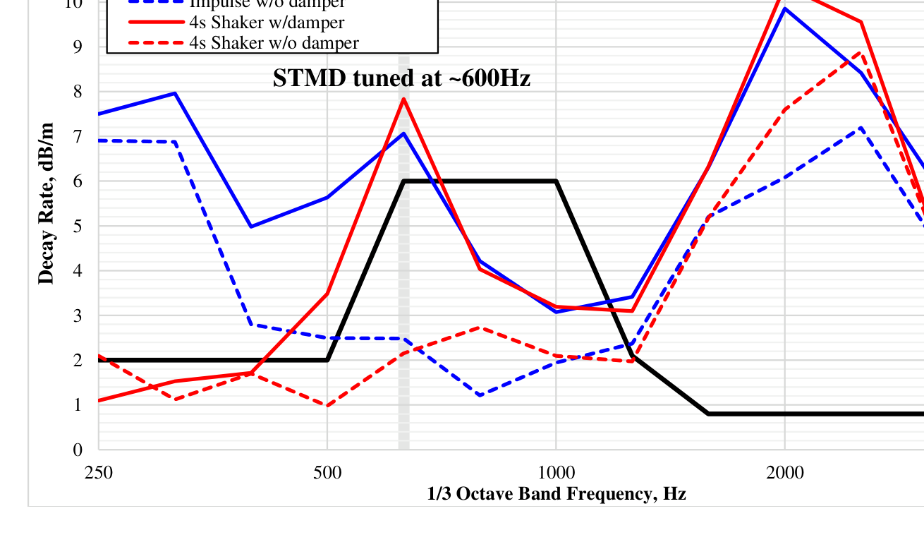 A A A Track Decay Rate (TDR) Measurement Method for Reactive Damping by Tuned Mass Damper (TMD) Wilson HO 1 Jabez Innovation Limited Unit 601, 6/F, Block A, Shatin Industrial Centre, 5-7 Yuen Shun Circuit, Shatin, N.T., Hong Kong Marco IP 2 , Yi-Qing NI 3 The Hong Kong Polytechnic University, Hong Kong Branch of National Rail Transit Electrification and Automation Engineering Technol- ogy Research Center, Hong Kong ABSTRACT TDR measures the rate of vibration decay along rail in dB/m. Higher TDR leads to lower noise radi- ation. However, new railways are often having low TDR due to the use of resilient fasteners (to pro- vide vibration isolation between rail and supporting structure for ground borne noise concerns), which leads to high noise radiation. Rail damper is used to increase TDR (thus reduces railway noise), where TMD is an efficient damping mechanism dissipating the vibration energy of the rail. TMD provides reactive damping force, maximised after a few cycles of oscillations. TMD force is stronger with continuous excitation than impulse excitation. For convenient purposes in the industry, TDR measurements are primarily conducted by impulse method, which do not allow sufficient time to include reactive TMD force. Therefore, impulse excitation TDR is smaller than continuous excita- tion TDR. Continuous excitation TDR is considered to reflect more of the real case of wheel/rail interaction excitation during train running. Besides, TDR in terms of time decay in dB/s is an alter- native approach for evaluating noise performance of the rail. This paper presents TDR measurement results of short rail (~6m) with resilient fastener support in a laboratory setting. 1. INTRODUCTION Track decay rate (TDR), in dB per m (dB/m), is widely adopted by the railway industry to indicates how far the vibration of certain frequency could travel along a rail [1]. Low TDR allows accumulation of vibration energy and leads to high rail vibration and excessive rail noise. It is affected mainly by the trackform design. Rail dampers could be installed on the rail to improve TDR. TDR improvement is one of the parameters during rail damper selection. Shearing Tuned Mass Damper (STMD) reported 2-3dB/m TDR improvement at its tuned fre- quency in both vertical and lateral direction and its noise reduction could achieve as high as 6dB(A) in-saloon [2]. Due to reactive mechanism of tuned mass damper with ~90 degree phase lag before responding to vibration, STMD damping effect may not be fully accounted for in the current TDR measurement method with single impulse excitation source [1]. In the real situation with multiple wheel excitation on a rail, the rail vibration gradually increases before reaching the maximum, and this allows sufficient time for the TMD reactive response. 1 who@jabez.hk 2 kkmip@polyu.edu.hk 3 yiqing.ni@polyu.edu.hk worm 2022 In this paper, TDR improvement due to STMD was measured in a laboratory and compared with typical impulse vibration excitation and prolong vibration excitation to allow STMD damping power to fully developed. worm 2022 2. STMD DESCRIPTION Shearing tuned mass damper (STMD) is a type of rail damper to mitigate noise emitted from rail by dissipating its vibration energy. Latest STMD have the effective range of 40Hz to 1000Hz [3] and could be tuned into specific resonance frequency for extra noise reduction. STMD has reported to able to suppress corrugation growth [4-6]. Through the reactive operation of the oscillator at ~90 degree phase lag, the TMD damping effect is equivalent to many times of the original damping in the track system. In this measurement, the STMD were tuned at ~600Hz resonance frequency. Figure 1: Rail Damper Design 3. METHODOLOGY TDR measurements are conducted based on BS EN 15461:2008 [1]. The standard specified the rail to be excited by single impulse and widely adopted by the railway industry. Additional measure- ments were repeated with 4 second prolong vibration excitation and compare the TDR improvement after STMD installation between different vibration excitations at vertical direction. 3.1. Laboratory Setup The TDR measurements were conducted in a laboratory setup with a 6m long UIC60 rail section fastened on resilient baseplates with a stiffness of ~22MN/m. Vibration excitation, either with shaker or impact hammer, were applied at the mid-span of second rail mounting spacing, as shown in Figure 2 below. Assigning the spacing where vibration excitation was applied as “0”, accelerometers were attached at the mid-span under rail of 0, 1, 2, 4 and 6 th spacing. Each spacing is 0.6m apart. (vertical) 0.6m Figure 2: Schematic of Laboratory Setup 3.2. Measurement Parameters TDR measurements were conducted with 4 types of vibration excitation, 1) single impulse by hammer impact, prolong white noise excitation by shaker for 4s. TDR of Each type of vibration ex- citation were compared between before and after STMD installation. worm 2022 Vibration level time history were recorded at each accelerometer from before the vibration exci- tation until reaching background for further analysis. 3.3. Data Analysis TDR of each scenario is determined at each 1/3 octave band frequency from 250 to 4000Hz. For prolong excitation, data were extracted at the end of the excitation for STMD to fully response to the excitation ( Figure 3 ). TDR improvement due to STMD installation is determined by comparing the TDR of corresponding scenario with and without STMD. TDR in terms of dB/m was determined by the average vibration level decayed between adjacent accelerometer along the rail from the vibration source. Analysing period Analysing period Vibration Level, 250-4000Hz Vibration Level, 250-4000Hz Prolong excitation Impulse excitation by shaker, 2-4s by hammer Time Time Figure 3: Schematic of Data Analysis Range 4. MEASUREMENT RESULTS The measurement results are shown in Figure 4 . Both impact and prolong vibration excitation shows a significant improvement around the tu