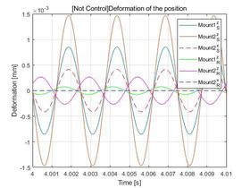 A A A Multi-directional active vibration control of 1D smart structure inspired by automotive engine mounting system Hojoon Moon 1 Yeungnam University 280 Daehak-Ro, Gyeongsan, Gyeongbuk 38541, Republic of Korea Yang Qiu 2 Yeungnam University 280 Daehak-Ro, Gyeongsan, Gyeongbuk 38541, Republic of Korea Byeongil Kim 3 Yeungnam University 280 Daehak-Ro, Gyeongsan, Gyeongbuk 38541, Republic of Korea ABSTRACT Recently, active mounting system is being gradually applied to automotive engine mounts for mitigating structure-borne vibration effectively throughout the whole vehicle chassis. This paper presents modeling, analysis, and control of a source structure with an active mounting system in multi-directions, considering position and direction of actual automotive engine mounts. The active mount consists of a piezoelectric stack actuator in series with an elastomeric(rubber) mount. When harmonic excitation forces are employed, secondary force required for each active mount is calculated mathematically and the control signal can reduce the vibration through the destructive interference with input signal. In addition, the horizontal vibration can also be mitigated by setting a variable parameter through the dynamic relation of source structure. A series of simulation results demonstrate that the excitation vibration could be reduced along with this multi- directional(vertical and horizontal) active mounts. Based on this result, it can be expected that noise vibration harshness(NVH) performance can be improved by controlling the vibration of the actual automotive engine structure with rubber mount and secondary force of actuators in both vertical and horizontal directions. 1. INTRODUCTION Nowadays, automobile development places importance on lightweight structure, high engine efficiency, and ride comfort. Therefore, research on an engine mounting system that supports the powertrain and insulates the excitation force transmitted to the vehicle chassis is becoming important. Most vehicles are fitted with passive mounts (rubber or hydraulic). However, the rubber 1 answns5@naver.com 2 positive0919@ynu.ac.kr 3 bikim@yu.ac.kr mounts cannot mitigate vibration due to increased dynamic stiffness in the high frequency domain, and hydraulic mounts cannot mitigate vibration in the high frequency domain, although vibration is exceptionally mitigated at the notch frequency. To solve this problem, research on semi-active and active mounts is being conducted. Li Sui et al. [1] showed that the use of a PZT actuator as a vehicle engine mount reduces vibration due to engine excitation (low frequency-low amplitude) at engine idle and vibration due to engine excitation (high frequency-low amplitude) during driving by 80%.Liette et al. [2] conducted a study to reduce vibration using two active paths composed of a piezo stack actuator and a rubber mount, and to quantify the interaction between the dynamic characteristics of the passive system and the active path. Based on the 6DOF model of the beam structure, vibration isolation was verified through simulations and experiments. Hong et al. [3] designed a 9-DOF model of the plate structure to consider the effect of rotational displacement in addition to previous studies, and performed realistic simulations as a result. Although research on such an engine mount continues, unlike an actual engine mount, only an actuator that connects the engine and the chassis vertically is in progress. Therefore, in this study, the effect of vibration mitigation in the vertical and horizontal directions using vertical and horizontal actuators for the engine and chassis was investigated. To connect the source and receiver in the horizontal direction, the source structure is designed as a beam structure bent in an 'L' shape. Therefore, this article does the following: 1) A lumped parameter model is proposed for the given structure and equations of motion are established. And 2) Performing simulations and analyze the results to propose how to improve the vehicle’s NVH performance 2. Modeling and Control force 2.1. Lumped parameter model The model of source-path-receiver system considering actual automotive engine mounts was established based on the lumped parameter model, as shown in Figure.1 Figure 1: Source-paths-receiver modeling In Figure 1, source means vehicle engine, path means active mounts that consists of a piezoelectric actuator and a rubber mount, and receiver means the sub-frame. 𝑚 𝑖 means mass of beam, 𝑚 𝑎𝑐𝑖 means mass of piezoelectric stack actuator, 𝐼 𝑖 𝑦 means moment of inertia in y axis. 𝑙 𝑠𝑖 means length from center of gravity at source, 𝑙 𝑟𝑖 means length from center of gravity at receiver. 𝑑 means the length from center of gravity of source to the external force. 𝜀 𝑖 𝑧 , 𝜀 𝑎𝑐𝑖 𝑧 mean the vertical motion of the beam and actuator. 𝜀 𝑎𝑐2 𝑦 means the rotational motions of beam. 𝑘 𝑚𝑖 , 𝑐 𝑚𝑖 means stiffness and damping values between beam and actuator. 𝑘 𝑏𝑖 , 𝑐 𝑏𝑖 means stiffness and damping values between beam and ground. 𝑓 𝑎𝑐1 𝑥 means the horizontal motion of actuator2. 𝜃 𝑖 𝑥 means control force from each actuators. 𝑊 𝑧 means external force. All of the above parameters are determined based on the data measured by the experiment. This model can be expressed motion equation using Newton’s 2 nd law. 𝑧 , 𝑓 𝑎𝑐2 𝑀𝑞̈(𝑡) + 𝐶𝑞̇(𝑡) + 𝐾𝑞(𝑡) = 𝑊(𝑡) + 𝐹(𝑡) , (1) In equation (1), M, K, C are mass, damping, stiffness matrix and 𝑞(𝑡), 𝑊(𝑡), 𝐹(𝑡) are displacement, external force, control force vector. It is assumed that displacement exists in the x-direction and z- direction, and rotational motion exists in the y-direction. Thus, overall model has five translational motions and two rotational motions, indicating that it is a 7 DOF system. 𝑦 𝐼 2 𝑦 ]) (2) 𝑀= 𝑑