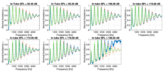 A A A A key physical mechanism that controls the sound absorption of aerogel powders Hasina Begum 1 Department of Mechanical Engineering, The University of Sheffield, S1 3JD, United Kingdom Yutong Xue 2 Midea Corporate Research Center, Foshan, Guangdong, China, 52831 J. Stuart Bolton 3 Ray W. Herrick Laboratories, School of Mechanical Engineering, Purdue University, 177 S. Russell St., West Lafayette, Indiana 47907-2099, USA Kirill V. Horoshenkov 4 Department of Mechanical Engineering, The University of Sheffield, S1 3JD, United Kingdom ABSTRACT A key physical mechanism that controls the acoustic absorption and attenuation in a loose, air-satu- rated aerogel granular mix with the grain diameter being in the order of a few microns is not well understood. A particular challenge here is to understand sound propagation in an aerogel powder composed of highly porous, low-density particles with sub-micron pores. Experimental evidence sug- gest that a relatively thin layer of an aerogel powder can provide a very high narrow band acoustic absorption at relatively low frequencies. This study presents an attempt to explain this physical phe- nomenon with two well-known analytical models for the acoustical properties of porous media. The results of this study suggest that an aerogel powder behaves like a viscoelastic layer and its absorp- tion coefficient depends strongly on the sound pressure level in the incident wave, i.e., this acoustic behaviour is non-linear. The loss factor seems to be a key parameter which predicts the observed acoustical behaviour. The loss factor is found to be higher than physically reasonable at low frequen- cies and decreases with the frequency exponentially. This behaviour is likely to relate to the frictional interaction between the particles in the powder and acoustic fluidisation effect. 1. INTRODUCTION A majority of previous research has focused on the acoustical properties of millimetric (e.g. [1]) grain mixes with sub-millimeter pore sizes (e.g. [2]). As a result, there is a clear gap in the understanding of the acoustical behaviour of light powders such as aerogels with particle sizes close to a micron and 1 hasina.begum@nuron.tech 2 xyt@alumni.purdue.edu 3 bolton@ecn.purdue.edu 4 k.horoshenkov@sheffield.ac.uk a 2022 particle density being close to that of air, i.e. 𝜌𝜌 0 = 1.2 kg/m 3 . There is evidence that relatively thin (30-50 mm) layers of these powders are able to absorb well at low frequencies (e.g. 100 – 500 Hz) noise. There is also evidence that their acoustical behaviour is non-linear, i.e. it depends on the am- plitude of the incident sound pressure. Modelling the acoustical properties of these powders is a chal- lenge because the key physical mechanisms that control their ability to absorb sound are not fully understood. The aim of this work is to illustrate a connection between the non-acoustical properties of aerogel powder and its normal incidence absorption coefficient through modelling and experiment. It is shown that a key mechanism of absorption in this class of materials relates to the particle oscil- lation and associated material damping. This behaviour is non-linear. 2. METHODOLOGY The material studied in this work was Enova IC3100 produced by Cabot Corporation, Alpharetta Georgia, USA. Figure 1 is a scanning electron microscope image (SEM) of this material. The bulk density of this aerogel powder determined using calibrated scales was 𝜌𝜌 𝑏𝑏 = 38.71 kg/m 3 . a 2022 Figure 1: A SEM photograph of Enova IC3100 aerogel powder. The acoustical absorption coefficient of aerogel powder was measured in a specially made 10 mm diameter standing wave tube in accordance with the ISO 10534-2 standard. The aerogel powder layer thickness was set to 50 mm. This 2-microphone setup enables measurement of hard-backed porous layers in the frequency range from 100 to 4999 Hz. Two models were used to predict the complex effective density and bulk modulus of aerogel powder: (i) the 5-parameter Johnson-Cham- poux-Allard (JCA) model [1]; and (ii) the 3-parameter Páde approximation (3P) model [3]. The Biot theory (also see Chapter 11 in reference [1]) was then applied to account for the frame elasticity in the presence of air. These predictions were then used to estimate the frequency-dependent absorption coefficient and to fit it to the data measured in the 2-microphone impedance tube. This fitting process was based on the MATLAB built-in numerical optimization subroutines. 3. RESULTS Figure 2 presents the measured and modelled absorption coefficient spectra for the 50 mm hard-backed layer of aerogel powder for a range of excitation levels. Tables 1 and 2 list the parameters of these two models used to predict the absorption coefficient spectra shown in Figure 2. The meaning of the parameters shown in Tables 1 and 2: 𝜎𝜎 is the flow resistivity; 𝜙𝜙 is the porosity; 𝛼𝛼 ∞ is the tortuosity; Λ is the viscous characteristic length; Λ′ is the thermal characteristic length; 𝐸𝐸 1 is the Young’s modulus; 𝜈 𝜈 is the Poisson’s ratio; 𝜂 𝜂 𝑚𝑚 is the frequency-dependent loss factor; 𝑠 𝑠 𝑏𝑏 is the median pore size; 𝜎 𝜎 𝑠 𝑠 is the standard deviation in pore size. Table 1: The values of non-acoustical parameters in the JCA model [1] used to predict sound absorp- ti on coefficient spectra shown in Figure 1. Λ Λ ' σ ρ b E 1 ϕ α ∞ ν η m [Pa s m -2 ] [kg/m 3 ] [Pa] [ µ m] [ µ m] 10.5×10 6 0.999 3.0 36.1 36.1 35.5 775 0.396 Eq. (1) Table 2: The values of non-acoustical parameters in the 3-parameter model [2] used to predict sound absorption coefficient spectra shown in Figure 1. Material ϕ s b [ µ m] σ s [ 𝜙 𝜙 -units] ρ b [kg/m 3 ] E 1 [Pa] ν η m Type 1 0.999 14.7 0.756 35.5 775 0.396 Eq. (1) a 2022 Figure 2: The normal incidence absorption coefficient spectra of aerogel powder at different incident sound pressure levels. Experiment (blue-solid lines), JCA model pre
