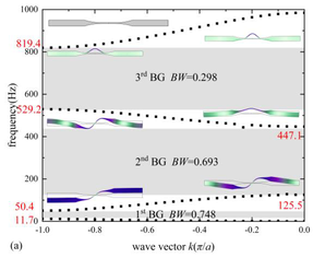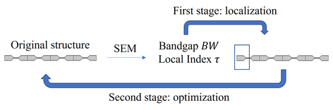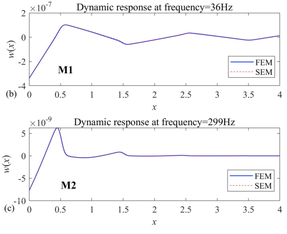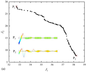 A A A Two-step optimization design of periodic beam with acoustic black holes Hui Sheng 1 Department of mechanics, Tianjin University Tianjin 300350, PR China Qian Ding 2 Department of mechanics, Tianjin University Tianjin 300350, PR China ABSTRACT This paper presents a two-step optimization method to design the acoustic black holes (ABH) profiles according to local property in the target frequency region. In the first step, the concept of ‘local index’ is used to identify the position of local vibration. Then, as the second step, the ABH parameters are multi-objective optimized. The numerical examples indicate that the two-step optimization provide a set of Pareto solutions for lightweight ABH design with board bandgaps. To reveal the mechanism of the attenuation band, the vibration modes of the structure are analyzed and the local property of the ABH is shown. Using dynamic and static characteristics as objective functions, the proposed method provides a way to merge physical meaning in the process of data- based optimization. 1. INTRODUCTION The acoustic black hole (ABH) has been attracting growing attention due to its capacity for wave focalization in local inhomogeneity structures [1]. The ABH structure has broadband manipulation performance for elastic waves and this focalization property is conducive to various applications prospects such as vibration control [2], sound isolation [3, 4], and energy harvesting [5, 6]. Based on the conception of the phononic crystal (PC), the periodic structures with ABHs, for both 1D beam[7-10] and 2D plate [11-16], have been investigated to expand the effective low-frequency range below the cut-on frequency of ABH effect. The broadband gaps are generated by the photonic crystal effects and the wave retarding of ABH with local resonance [7, 17] , which means it is capable of attenuating elastic waves in a specific wide frequency range. Compared with bandgaps formed through Bragg scattering or local resonances, the ABH periodic structure can break through the high-frequency limitations of the former and solve the problem of the narrow bandwidth of the latter, with its excellent energy concentration ability. Existing studies on multiple ABHs structures include the dynamic characteristics [7, 11, 17, 18] and wave propagation characteristics [19] based on semi-analytical methods and experiments. Besides, many efforts have been devoted to improving the performance of the ABH periodic structure in vibration and noise reduction. To lower the bandgap frequencies and attenuate both flexural and 1 hsheng@tju.edu.com 2 qding@tju.edu.com longitudinal waves simultaneously, double-leaf ABH indentations are folded in a V-like structure [20]. A periodic nested ABH beam was proposed [10] and a complex band structure was adopted to reveal its attenuation characteristics of wave propagation. However, most studies of metamaterials based on local resonances focus on wave characteristics and generally consider infinite periodic structures [21, 22]. The actual structure is finite and the reflected waves at the boundaries will cause the local vibration of the structure. Dramatic local vibration induces damage, making the evaluation and localization of local vibration important in the process of structural design. Therefore, it is necessary to establish an analysis and optimization method to design these metamaterial structures based on the local dynamic characteristics. This paper aims at evaluating and optimizing the local property of the ABH periodic beam. A two- step optimization method is proposed, in which the position of local vibration is evaluated in the single frequency and the band frequency region first, then the ABH parameters are multi-objective optimized by NSGA-II. The proposed method is expected to be applied in multiform locally resonant metamaterials. 2. THEORETICAL MODEL In section 2.1, the model of the ABH periodic beam is established by the spectral element method (SEM). In section 2.2 and 2.3, we present detailed procedures of the first and the second optimization step, respectively. The overall optimization design process for the ABH is depicted in 错误 ! 未找到引用源。 . The material of the structure is steel. Figure 1 The overall optimization design process 2.1. Modeling The periodic beam is comprised of multiple ABH units as shown in Figure 2. The thickness of the ABH region is ℎ(𝑥) = (ℎ 𝑚𝑎𝑥 −ℎ 𝑚𝑖𝑛 )(𝑥𝑙 𝐴𝐵𝐻 ⁄ ) 𝑚 + ℎ 𝑚𝑖𝑛 , (1) where ℎ 𝑚𝑎𝑥 , ℎ 𝑚𝑖𝑛 𝑙 𝐴𝐵𝐻 and 𝑚 are the beam height, residual thickness, ABH length and exponent constant. Based on the Euler-Bernoulli theory, the SEM [23] is used to calculate dynamic properties. The displacement-force relation is given by 𝑔(𝑥, 𝜔) = 𝐒(𝑥, 𝜔)𝑤(𝑥, 𝜔) , (2) where 𝐒 is the global dynamic stiffness matrix of the beam. The detailed formulation of S can be found in [23]. With a predefined S , the spatial distribution of the displacement 𝑤(𝑥, 𝜔) and the velocity 𝑣(𝑥, 𝜔) along the ABH beam under the force 𝑔(𝜔) can be obtained. First stage: localization | Original structure gpg Bandgap BW ooo * Local Index t I oo a | Second stage: optimization Figure 2 Sketch of the periodic beam with ABHs. 2.2. The first optimization step: vibration localization To describe the ABH local effect in finite structure, the local index τ is defined by the ratio as 〈𝑣 2 〉 𝑙 〈𝑣 2 〉 𝑔 . (3) 𝜏(𝜔) = where 𝐿 ∫𝑣𝑣 ∗ 𝐿 0 𝑑𝑥, 〈𝑣 2 〉 𝑙 = 𝑙 ∫ 𝑣𝑣 ∗ 𝑥 0 +𝑙 𝑥 0 𝑑𝑥 . (4) 1 1 〈𝑣 2 〉 𝑔 = The ratio represents the spatial mean square velocity of the entire beam and that over the region of ( x 0 , x 0 + l ). With a single frequency 200Hz considered, one obtains the contour of the local index τ as x 0 and l sweeping in the effective domain A :[ x 0 ≥0, x 0 + l ≤ L ], as shown in Figure 3(a). The l