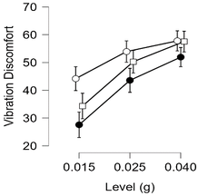 A A A Study of the comfort aircraft norms Sarah Jibodh-Jiaouan 1 Laboratoire Vibrations Acoustique (LVA), INSA-Lyon, 25 Av. Jean Capelle – 69621 Airbus, 26 Chemin de l'Espeissière, 31300 Toulouse, France Etienne Parizet 2 Laboratoire Vibrations Acoustique (LVA), INSA-Lyon, 25 Av. Jean Capelle - 69621 Villeurbanne, France Guillaume Osmond 3 Airbus Operation SAS, 26 Chemin de l'Espeissière, 31300 Toulouse, France ABSTRACT In long range aircrafts, one of the main reasons of discomfort to the passengers is the vibrations and the noise induced by the rotation of the engine. This induces a significant level of single-frequency excitations (both for noise and vibration). The frequency (located between 25 and 55 Hz) and the amplitude of these excitations vary depending on the flight parameters. This study investigates the influence of the frequency and the level of vibration and noise stimuli to discomfort. The aim is to build a global discomfort model for acoustics and vibration. Subjective experiments were carried out in the laboratory, on a test bench allowing to control the vibration and noise stimuli. Volunteers separately assessed the vibration, noise and global discomfort. Foot, seat, backrest and armrest accelerations were measured for each participant and each stimulus. The relation between noise or vibration discomfort and excitation level and frequency was determined. 1. INTRODUCTION Aircraft customers are very demanding on cabin noise and vibration comfort improvement. The aviation industry need to have a full understanding of the noise and vibration discomfort of the passengers in order to make their aircrafts more comfortable and to demonstrate the comfort of their planes to their customers. Acoustic and vibration comfort become an important marketing argument. The engine rotation is a significant source of noise and vibration in the cabin aircraft. At the moment noise discomfort and vibration discomfort are evaluated independently. Vibration ride comfort is estimated with the ISO 2631-1 standard [1] developed for any transportation and should be slightly adapted for each application. Studies at Airbus shows that this norm is sometimes not consistent with the crew or passenger complaints. 1 sarah.jibodh-jiaouan@airbus.com 2 etienne.parizet@insa-lyon.fr 3 guillaume.osmond@airbus.com The aim of the present experiment is to study the influence of frequencies and amplitude on the passengers’ discomfort in order to improve the passengers’ experience in the cabin, especially close to the engines. In addition, the goal is to build a global discomfort model. 2. METHODS 2.1. Participants Thirty-two people participated in this experiment including ten female and twenty-two males (mean age: 36.5 ± 9.8 year; mean height: 172 ± 8.0 cm; mean weight: 70.1 ± 12.0 kg). They were recruited inside Airbus and they come from different trades and areas of expertise. Participants and their labor doctors had to sign a certificate attesting their good health (no recent fractures or surgery, no retinal problem…) beforehand. 2.2. Stimuli Stimuli construction was extrapolated from analysis using existing vibration and acoustic flight measurements performed in several cabin aircrafts of the Airbus fleet. The stimuli represented only the cabin vibrations and noise generated by engine rotation. The nine vibration stimuli were composed of a mono-frequency vertical excitation. Three frequencies (25, 35 and 55 Hz) and three amplitudes (0.015, 0.025, and 0.040 g) were selected in order to address several aircraft types. The vibration stimuli duration was thirty seconds with around 4 s of fade-in. The nine acoustics stimuli were composed of cabin background noise (88 dB SPL - 73dB (A)) and a pure tone. Three frequencies (25, 35, and 55 Hz) and three amplitudes (75, 85, and 95 dB SPL) were selected for the pure tone covering the current and future fleet. The acoustic stimuli duration was twenty-five seconds with 10 ms of fade-in and fade-out. In total, there were twenty-seven combinations of vibration and acoustic stimuli because a vibration stimulus could only be generated with an acoustic stimulus of same frequency. 2.3. Apparatus The vibration was generated by a six degrees-of-freedom vibration shaker (Airbus Cube in Toulouse), but only the vertical translational vibrations were used in this study. The top of the platform is approximately 150 cm x 150 cm, two rows of two economic class seats were fixed. The volunteers were placed on the right seat of the back row one by one. For each participant, each vibration stimuli was recorded by five triaxial accelerometers: two pads attached to the seat and the backrest, one accelerometer fixed at the ground of the platform and one on each armrest. All vibration parameters were sampled synchronously at 800Hz using a Siemens Scadas Mobile front-end. The noise was generated using Matlab with an RME Fireface UFX II soundcard, two subwoofers (Genelec 7380 AP) and two loudspeakers (DAS Audio - Artec 508). The acoustic setup was calibrated once before the experiment. A microphone was placed between the theoretical positions of the passengers’ ears just as the in-flight procedural measurements used in the company. 2.4. Procedure The experiment was divided in three blocks: Global Discomfort (GD), Acoustics Discomfort (AD), and Vibration Discomfort & Body Map (VD&BM). The participants were submitted to the twenty-seven combinations of vibration and acoustics stimuli for the GD block, to the nine acoustic stimuli for the AD block and to the nine vibration stimuli for the VD&BM block. The participants analyzed the global discomfort for the GD block, the acoustic discomfort for the AD block and the vibration discomfort for the VD&BM block. Based on ISO 2631-4, a continuous discomfort scale between 0 and 100 with a semantic reference was presented to the participants for the three blocks. They had to give a numerical value corresponding to their discomfort. In addition, fo