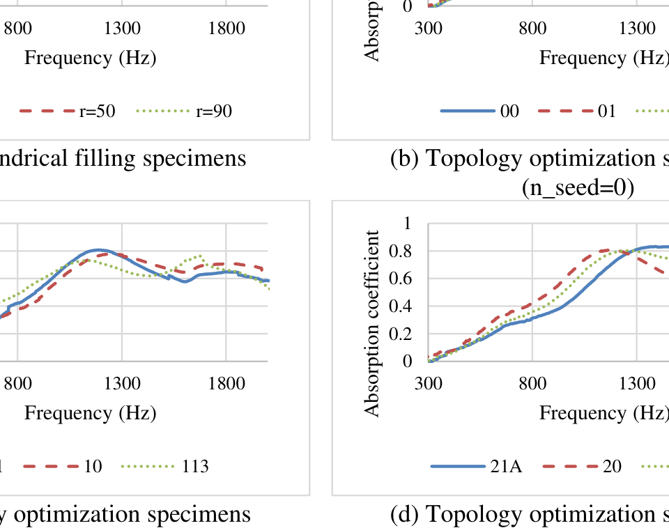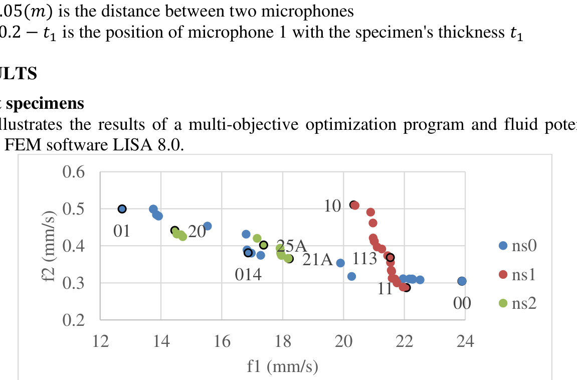 A A A Development of ventilation and sound-absorbing materials using specimens generated by the multi-objective optimization method Bach Lien Trieu 1 , Keigo Kajitani 2 , Kiichiro Sawada 3 , Thu Lan Nguyen 4 Shimane University 1060 Nishikawatsu-cho, Matsue City, Shimane Prefecture 690-0823, JAPAN ABSTRACT In hot and humid tropical countries, the houses are designed to be naturally ventilated with vent louvers. However, these louvers play as direct paths for noise entering the house. It is necessary to create geometries that can maximize the noise transmission loss and the ventilation performance of the housing structure. This study aims to develop ventilation and sound-absorbing material that can be 3D printed and installed on the upper part of the buildings' windows. The multi-objective optimization method was applied to generate 3D model specimens based on fluid potential flow analysis. To examine the absorption coefficient of the cylindrical specimens made of ABS filament with different filling rates manufactured by the 3D printer, the experiments were conducted in an anechoic chamber using an impedance tube that can measure the absorption coefficient in a frequency range of 300 to 2000 Hz. It was found that the sound absorption coefficient was little affected by the filling rate of ABS filament and improved effectively at a high-frequency range when adopting the optimized spiral structure. The improvement of sound absorption coefficient at frequency of about 800 Hz and the performance of multiple-structural material will be further considered in the next study phase. 1. INTRODUCTION Noise has been considered one of the most severe environmental pollutions that affect the quality of life and human health. Architectural solutions to minimize this impact by designing soundproof structures for houses have been targeted in many studies in the architectural field. Recently, many excellent sound-absorbing materials have been researched and proposed. However, performances other than sound absorption, especially ventilation performance, have not been studied much. Moreover, when the design is too focused on one specific function, it may not satisfy another aspect. For example, live houses have been equipped with thick iron doors and sound-absorbing materials but very few ventilation facilities. In this case, the soundproof function takes precedence over the ventilation function. As a result, many live houses were found not sufficiently ventilated, and indoor air was polluted by cigarette dust [1]. Ventilation and sound absorption performances are in a trade-off relationship [2]. Specifically, to improve ventilation performance, it is necessary to make innumerable holes through which air can pass. On the other hand, it is required to fill the gap to improve the sound absorption performance. 1 trieulien0903@gmail.com 2 kajikei.rto@gmail.com 3 kich@riko.shimane-u.ac.jp 4 lan@riko.shimane-u.ac.jp This conflict makes it challenging to achieve both aspects simultaneously. This study aims to develop new materials that allow air ventilation but prevent sound from passing through. These design can help control the sound propagation through the ventilation equipment and increase the overall ventilation capacity. In this study, multi-objective optimization was performed to generate a model that satisfies both sound absorption and ventilation requirements in a cylindrical shape. Then, the impedance tube experiment was conducted in an anechoic chamber to investigate the sound absorption performance of all the specimens. 2. METHODS 2.1. The multi-objective optimization and formulations The multi-objective optimization method to generate a cylindrical 3D model based on fluid potential flow analysis was applied to manufacture the test specimens by using a Python program. The program is written using the external libraries Platypus and NSGAⅡ. The model comprises 47x23x11 elements with 13536 nodes (Figure 1). It has a diameter of 105 mm, and a thickness of 20 mm. The red nodes in this model are "tangent points," and the area surrounded by the 8 points is called an "element." The objective function was set for clarifying whether the element pattern exists or not to satisfy the condition for all the elements. Figure 1: The cylindrical 3D model In this study, the following f1 and f2 were used as objective functions: 𝑁𝑚 𝑓1 = ∑𝑣 𝑀𝑖 𝑖=1 Here, Nm is the number of all the air elements and v Mi is the velocity magnitude in i-th air element. 𝑁𝑏 𝑓2 = ∑𝑣 𝐵𝑖 𝑖=1 Here, Nb is the number of all the bottom air elements and v Bi is velocity magnitude in i-th bottom air element. The velocity magnitude in the above equations can be obtained from fluid potential flow analysis by finite element method (FEM) software LISA 8.0. In terms of Laplace's equation, a potential flow is an idealized fluid flow. Irrotational, incompressible, inviscid flow is required. The velocity potential, used in this analysis type, has one degree of freedom. Velocity is equivalent to a gradient in the velocity potential field that occurs when heat or electricity is flowing [6]. Function f1 was set based on the hypothesis that the larger magnitude of the overall flow velocity will allow a better sound absorption function. In other words, the more complicated the propagation path is created inside the specimens, the higher the sound absorption coefficient can be achieved. Function f2 is the flow velocity that exits from the bottom, indicating the ventilation performance magnitude. The topology pattern was represented with the following function: 𝑍(𝑡 𝑒 , 𝑟 𝑒 , ℎ 𝑒 ) = 𝑓 ℎ −1 𝑓 𝑡 −1 𝑓 𝑟 −1 𝑖𝜋(𝑢 ∙ 𝑡 𝑒 𝑚 𝑡 +𝑣 ∙ 𝑟 𝑒 𝑚 𝑟 +𝑤∙ ℎ 𝑒 𝑚 ℎ ) ∑∑∑(𝑎 𝑢,𝑣,𝑤 + 𝑏 𝑢,𝑣,𝑤 𝑖) ∙𝑒 (1) 𝑤=0 𝑣=0 𝑢=0 ( t e =0,1,2,…, m t -1, r e =0,1,2,…, m r -1, h e =0,1,2,…, m h -1) t e , r e , h e : Eleme