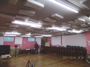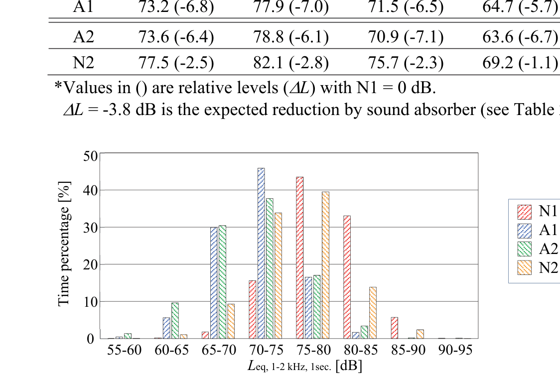 A A A A field experiment on the effect of sound absorption installed to a highly reverberant kindergarten classroom Keiji Kawai 1 Midori Ishizawa Yuuki Matsufuji Kumamoto University 2-39-1 Kurokami Kumamoto-city Japan ABSTRACT Japanese national or local governments have not published any standard for acoustic performance of classrooms and this is reflected by the rare consideration of sound absorption in classrooms. A kindergarten classroom, targeted in this study, was found to be highly reverberant (V = 200 m 3 , RT = 1.0 s at 1 kHz) because the room was originally an outdoor space of ground floor pilotis and converted into a classroom by constructing concrete walls between the columns with the fire-resistant hard ceiling panels remained. The author proposed a temporary installation of sound absorbing ma- terial and to conduct a field experiment to examine and experience the effect of sound absorption. Sound absorbers were attached on the ceiling and the walls to reduce the RT to 0.5 s. By this, the slope of doubled distance attenuation increased from 1.5 dB to 2.3 dB, which should mitigate the confusion of speeches by children in the room. The result of sound level monitoring indicated 6-7 dB decrease at 1-2 kHz in the absorbed condition, which is greater than the 3.8 dB decrease measured in the unoccupied condition using a loudspeaker source. Also, the children’s utterances of lunch prayer were more synchronized in the absorbed condition. 1. INTRODUCTION Reverberation is a factor that can greatly hinder the vocal communication of young children, as stated in [1] as an example: For Early Childhood Facilities (children from birth- age 5) the reverberant acoustic conditions should be optimal, as children are involved in listening and language skill devel- opment during this stage of their life and need the best acoustic conditions possible . However, at present in Japan, national or local governments have not published any standard for reverberation time of classrooms and this is reflected by the rare consideration of sound absorption in classrooms of school and pre-school facilities. During our site inspection survey on the acoustics of kindergarten buildings in Kumamoto city, a highly reverberant classroom happened to be found. Among classrooms in the kindergarten, only this room is a refurbished room from the original outdoor piloti, with highly reflective surfaces such as the original fireproof cement board ceiling remained and concrete walls additionally constructed be- tween columns. The teachers recognized that the room tend to be noisier than others but did not recognized that the bustling was due to the excessive reverberation. At the time of visit, 3-year-old children were freely playing in the classroom and everyone seemed to be screaming. Thus, the authors 1 kkawai@kumamoto-u.ac.jp 21-24 AUGUST SCOTTISH EVENT CAMPUS ? 02 ? GLASGOW 21-24 AUGUST SCOTTISH EVENT CAMPUS ? 02 ? GLASGOW proposed a temporary installation of sound absorbing material and to conduct a field experiment to examine and experience the effect of sound absorption. 2. OVERVIEW OF EXPERIMENT The room for the experiment is for one of the two 3-year-old classes with 25-30 children for each. The dimensions of the room are 6.2 m x 10.8 m x 2.5 m (S = 250m 2 , V = 200m 3 ) (Figure 1). The interior materials of the room are concrete for the walls, glass windows, cement boards for the ceiling, and timber floor, which are totally highly reflective. The furniture is plastic chairs and tables and a piano. A curtain attached to a glass window is only sound absorbing material in the room. The rever- beration time measured in this room and the average sound absorption coefficient obtained by Eyring’s equation are shown in Table 1. The absorption coefficient, 0.12, can be regarded as highly reverberant as a classroom with furniture. 10800 h= 2.5 m V= 200 m³ S= 250 m² S1(h=1.2m) 6200 S2(h=0.4m) R1(h=2.2m) R2(h=2.2m) absorber Figure 1: Room dimensions and source/receiving positions Figure 2: Sound absorber installation Table 1: Reverberation time and average absorption coefficient Reverberation time [s] Absorption coefficient Oct. band [Hz] Original Absorbed Original Absorbed 250 1.0 0.9 0.12 0.14 500 1.0 0.6 0.12 0.18 1 k 1.0 0.5 0.12 0.23 2 k 1.0 0.5 0.12 0.23 4 k 0.9 0.5 0.13 0.24 Table 2: Outline of experimental period Period Date Absorption Recording day N of children N1 Dec.6-Dec.10 no 5 27-30 A1 Dec.13-Jan.21 yes 6 26-30 Jan.24-Feb.14 no - 16-19 A2 Feb.15-Mar.4 yes 6 23-26 N2 Mar.7-Mar.22 no 7 24-28 21-24 AUGUST SCOTTISH EVENT CAMPUS ? 02 ? GLASGOW Sound absorbers were temporarily installed in this room with an average sound absorption coeffi- cient of 0.25 as a target, that is, 163 polyester fiber boards with a size of 170 x 400 mm and a thickness of 50 mm were attached to the ceiling with magnets, and 12 m 2 of polypropylene non-woven fabric with a thickness of 4 mm was hung on two adjacent walls (Figure 2). The experiment was carried out from December 2021 to March 2022, during which the sound absorbers were attached and detached twice. Table 2 shows the outline of the experimental periods. Due to the spread of infection of COVID-19, a request to refrain from going to the kindergarten was issued after A1 period. The re- quest continued until March, but gradually the number of children coming to kindergarten increased and the recording restarted in the middle of February. Acoustic measurements were performed in the condition with and without the absorbers, and room sounds were recorded for a total of 24 days. 3. IMPROVEMENT IN ROOM ACOUSTICS The improvement of room acoustic conditions due to the sound absorption was examined by acoustic measurement. In the actual measurement, using an omnidirectional speaker as the sound source, the reverberation time and STI (S/N ratio set at 15 dB in every octave band) were measured by impulse response method, and the distance attenuation from the sound source was measured usi