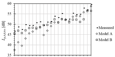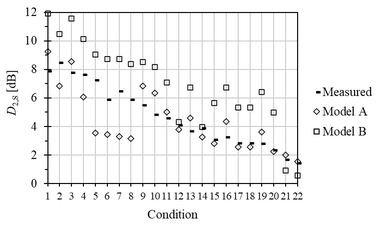A A A Precision of room acoustic modelling in open-plan offices Jukka Keränen, Pekka Saarinen, Valtteri Hongisto Turku University of Applied Acoustics, Acoustics Laboratory Joukahaisenkatu 7, FI-20520 Turku, Finland ABSTRACT Room acoustic models can predict parameters that describe acoustic conditions in open-plan offices. An open-plan office of 81 m 2 was experimentally studied. Twenty-two room acoustic conditions were built using different combinations of absorption materials, and office screens. The conditions were measured according to ISO 3382-3. The conditions were modelled using Model A, a software based on raytracing, and Model B, a simple empirical model. The precision was assessed by the difference of predicted and measured single-number values (SNVs) of ISO 3382-3. The mean prediction accu- racy of L p ,A,S,4m was 3.2 dB and 2.0 dB for Models A and B, respectively. The mean prediction accu- racy of D 2,S was 1.2 dB and 2.4 dB for Models A and B, respectively. For Model A, the predicted and measured SNVs were similar in conditions with low sound absorption and low screen height. The agreement was worse in conditions with high sound absorption on the ceiling and walls, and over 1.6-m-high sound-absorbing screens. For Model B, the agreement of D 2,S was a little less precise in most conditions. L p ,A,S,4m with Model B was more precise than with Model A in conditions with high screens and high sound absorption, but less precise in other conditions. 1. INTRODUCTION Speech is dominant sound source in open-plan and activity-based offices [1]. Distraction of speech can be controlled, e.g., using sound absorption materials, screens, and active masking sound systems. The effect of room acoustic improvements on the acoustic performance of the office can be measured according to ISO 3382-3 [2]. It defines five single-number-quantities: spatial decay rate of A- weighted sound pressure level (SPL) of speech, D 2,S [dB], A-weighted SPL of speech at 4-meter- distance from the speaker, L p,A,S,4m [dB], A-weighted SPL of background noise, L p,A,B [dB], distrac- tion distance r D [m], and comfort distance, r C [m]. The single-number values (SNVs) have also been predicted in case studies. The prediction methods were based on raytracing method [3-6] or empirical models [7,8]. Our study investigates the predic- tion accuracy of SNVs using the raytracing method [9] and the empirical model [7] in 22 room acous- tic conditions built in an open-plan office. The predicted values are compared to measured values, which have been already published [10]. 2. MATERIALS AND METHODS 2.1. Open-plan office and 22 studied conditions The studied open-plan office (81 m 2 ) involved 12 workstations (Figure 1). Twenty-two room acoustic conditions were built in the office. The conditions (Table 1) varied four parameters: ceiling absorption (high or low), wall absorption (high or low), screen absorption (`-´, high or low), and screen height (`-´, 1.3, 1.7, or 2.1 m). The high ceiling absorption was implemented using 20 mm mineral wool tiles in the suspended ceiling (90% coverage) and low ceiling absorption using unperforated gypsum tiles. The high wall absorption was implemented by mounting 40 mm mineral wool panels on the wall surface (20% coverage). The low wall absorption was when the panels were not mounted. Two types of screens were used around the workstations: sound-absorbing office screens (high) and textile coated office screens (low). The screens were built to three different heights. The screen absorption and height are `-´ when the screens were removed. Table 1: The investigated conditions. Description of sound absorption, screen height, and absorption coefficients for Mo del B. Screen Condition height h [m] α c α f 1 high high high 2.1 0.85 0.8 2 high high high 1.7 0.85 0.7 3 high low high 2.1 0.85 0.6 4 high low high 1.7 0.85 0.5 5 high high high 1.3 0.85 0.6 6 high high low 1.3 0.85 0.4 7 high low high 1.3 0.85 0.4 8 high low low 1.3 0.85 0.2 9 low high high 2.1 0 0.8 10 low low high 2.1 0 0.6 11 low high high 1.7 0 0.7 12 high high - - 0.85 0.2 13 low low high 1.7 0 0.5 14 high low - - 0.85 0 15 low high high 1.3 0 0.6 16 low high low 1.7 0 0.5 17 low high low 1.3 0 0.4 18 low low high 1.3 0 0.4 19 low low low 1.7 0 0.3 20 low low low 1.3 0 0.2 21 low high - - 0 0.2 22 low low - - 0 0 Sound absorption Abs. coefficients ceiling / walls / screens ceiling / furniture 2.2. Measurements The room acoustic measurements are described in detail in [10]. Spatial decay of speech was deter- mined according to ISO 3382-3 [11] using a calibrated omnidirectional loudspeaker that produced loud pink noise. The SPL of the pink noise was measured in six workstations that were on two meas- urement paths (Figure 1). The SNVs were determined individually for both paths in all the 22 condi- tions. The mean SNVs were determined for all the 22 conditions. Figure 1: The open-plan office with 12 workstations. The sound source was in the corner (O). The measurement positions ( ) were in six workstations. Two measurement paths were used. 2.3. Model A A simulation software [9] based on raytracing method was used to predict the spatial decay of speech in the workstations (Figure 1). The SNVs were determined on both paths in the same way as in the measurements (Sec. 2.2). The first model was created for condition 22 (low ceiling absorption, low wall absorption, no screens). The dimensions and locations of furniture and other midsize objects in the room were precisely measured and replicated in the model. The sound absorption coefficients were defined for the boundary surfaces and furniture that were the same in all the predicted conditions. This model was used to “calibrate” the predictions by comparison to measured results of SPL of speech and reverberation time in condition 22. The other conditions were modeled by creating variations of the first model. The variations involved the additional absorption materials, and the s
