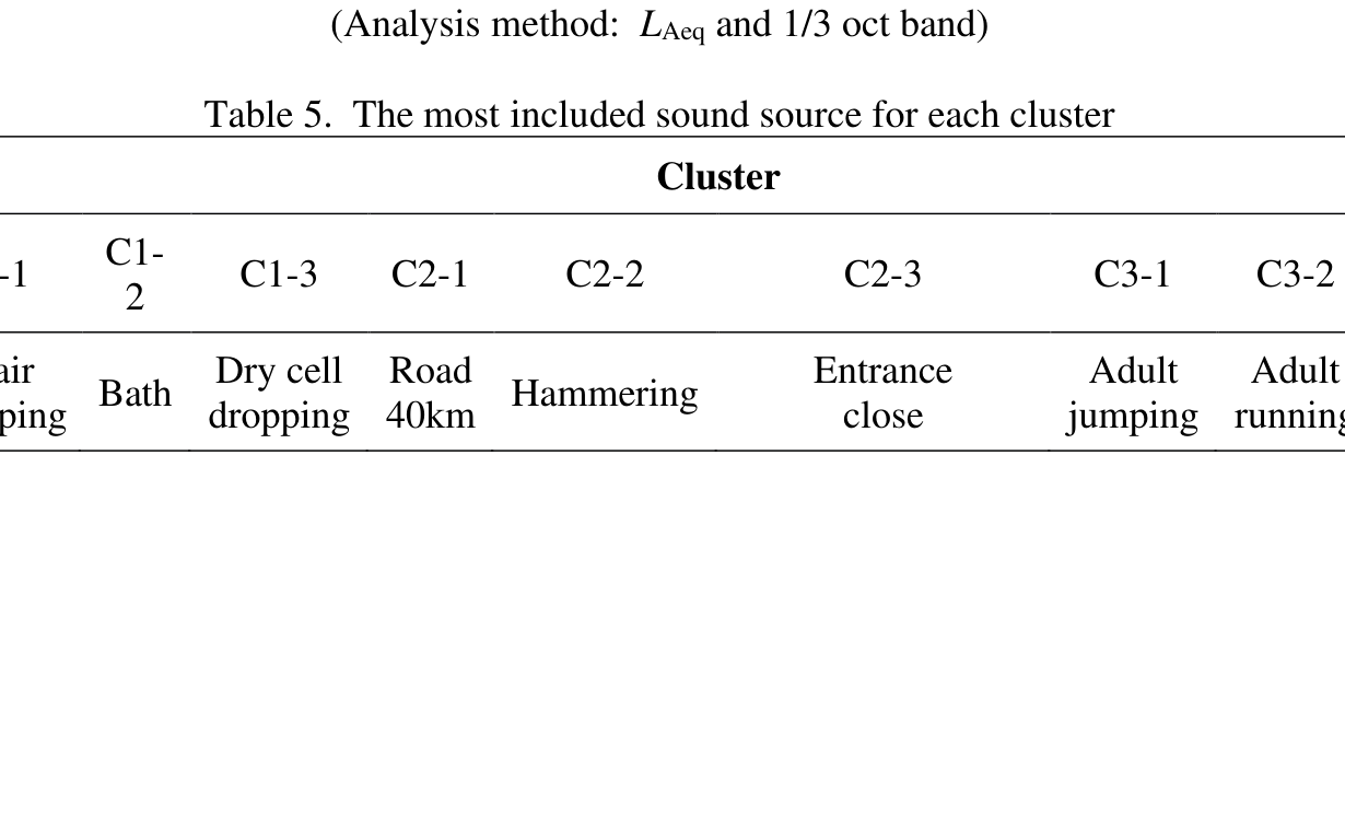 A A A Clustering and classification of the residential noise in apartment buildings based on machine learning using spectral and temporal characteristics Jeonghun Kim 1 , Chunwon Eom 2 , Jongkwan Ryu 3 Chonnam National University 77, Yongbong-ro Buk-gu, Gwangju, Rebublic of Korea ABSTRACT In this study, clustering and classification of the residential noise in apartment buildings based on machine learning were conducted using data of spectral and temporal characteristics. The sound sources were recorded in residential spaces and the length of each sound source was edited to 5 seconds. As a result of the first spectral characteristic clustering, three spectral characteristic clusters (C1, C2, and C3) were derived for all evaluation methods (L Aeq and L Amax ) and octave bands (1/1 and 1/3 octave band) analysis. As a result of the secondary temporal characteristic clustering, when the L Aeq using 1/1, 1/3 oct bands were used, each cluster consists of 3 time-varying clusters, resulting in a total of 9 residential noise clusters (C1-1, C1-2, ··, C3-2, and C3-3). In the clustering using L Amax for1/1 and 1/3 oct bands, a total of 11 residential noise clusters were generated according to C1 (k=3), C2 (k=3), and C3 (k=5) time-varying clusters. By labeling with the residential noise cluster for each analysis method, sound source classification was performed through machine learning (SVM, k-NN, ANN), and differences between analysis methods were investigated. In all analysis methods, it was found that the ANN model (accuracy avg: 84%) classified residential noise clusters better than the SVM and k-NN models. A total of 9 residential noise clusters composed of analysis methods (L Aeq and 1/3 oct band) for labeling, and the ANN showed the highest accuracy value of 85%. 1. INTRODUCTION The number of people affected by exposure to noise is increasing with the development of cities. An individual’s response to noise is different according to spectral and temporal characteristics even though the noise source is at the equal sound pressure level [1-2]. In Korea, complaints about floor impact sound are the most common in apartments [3], and since floor impact noise is a sound source dominated by low frequencies, it is necessary to categorize floor impact noise. To manage the noise between upper and lower units, the regulation on sound insulation performance of floor in building and sound level of actual floor impact noise in living space are used [4]. At governmental management center for floor impact noise, investigators judge the sound source type and to exceed the criteria of sound level of floor impact noise by hearing sound recorded for 24-hours. This involves a lot of time and individual subjective judgment. To solve such a problem, a simple model that uses 1 wjdgns9752@naver.com 2 ucw1472@naver.com 3 jkryu@jnu.ac.kr machine learning to make an objective judgement with less time is needed. Many existing sound classification studies using machine learning utilize deep learning (CNN, RNN, CRNN, etc.) algorithm. However, sound classification using deep learning takes a lot of time because it converts and analyzes images or time series data. Therefore, a simple and real-time analysis of sound sources using machine learning is needed. In this study, residential noise clustering and classification were conducted and compared through an analysis method based on spectral and temporal characteristics, which is relatively easy to analyze for residential noise sources generated in apartments. 2. DATASET OF SOUND SOURCES 2.1. Residential noises Residential noise sources were selected by referring to the status of each noise complaints surveyed by the governmental management center for floor impact noise [3]. For floor impact sound and air transmission sound, sound sources were recorded in a mock-up apartment unit with area of 84 and 59 m 2 and a slab thickness of 210 m. The traffic, environmental, and construction noise sound source were recorded from the outside and the filter of sound insulation of the façade was applied [5]. Table 1. Types of residential noise sources Noise Concrete pumping Adult jumping Bath Adult running Shower Concrete vibrator Adult walking Washbowl Earth auger Drainage and facility noise Children`s running Toilet Excavator loading Children`s Floor impact Outdoor unit noise Forklift walking noise Chair scrapping Road 40km/h Loader Remote dropping Road 60km/h Payloader Entrance close Road 80km/h Piledriver Golf ball dropping Environmental Traffic noise Construction noise Airplane noise Road roller Hammering Railway noise Stone crush Indoor close noise Air-compressor Spoon dropping Asphalt finisher Truck unloading Dog bark Batch plant Metal sound Breaker Tunnel ventilation Piano sound Bulldozer Construction noise Airborne noise TV sound Concrete mixer Vibrating roller 2.2. Preprocessing and analysis The length of each sound source was edited to be 5 seconds, and the sound pressure level of all sound sources was adjusted from 45 dBA, which is a indoor noise criteria for road traffic noise, to -5 to +5 dBA, 40 to 50 dBA in Leq (1 dBA interval). To extract the spectral characteristics, L Aeq and L Amax values for each 1/1 (31.5 to 2,000 Hz) and 1/3 (25 to 2,500 Hz) octave bands were derived. For temporal characteristics, L Aeq values for each 0.1s to 4.993s were derived through sound pressure level analysis for 5 seconds (time weighting: fast with 6 ms step). 3. CLUSTERING 3.1 Method Clustering is a representative unsupervised learning algorithm that divides a given data set into groups of similar data. In this study, residential noise sources were grouped by spectral and temporal characteristics through K-means clustering [6]. The number of k in k-means clustering was selected through the silhouette coefficient. First, in order to group by spectral characteristics of residential noise sources, L Aeq and L Amax values for each octave band were derived as shown in Table 2, and primary cl