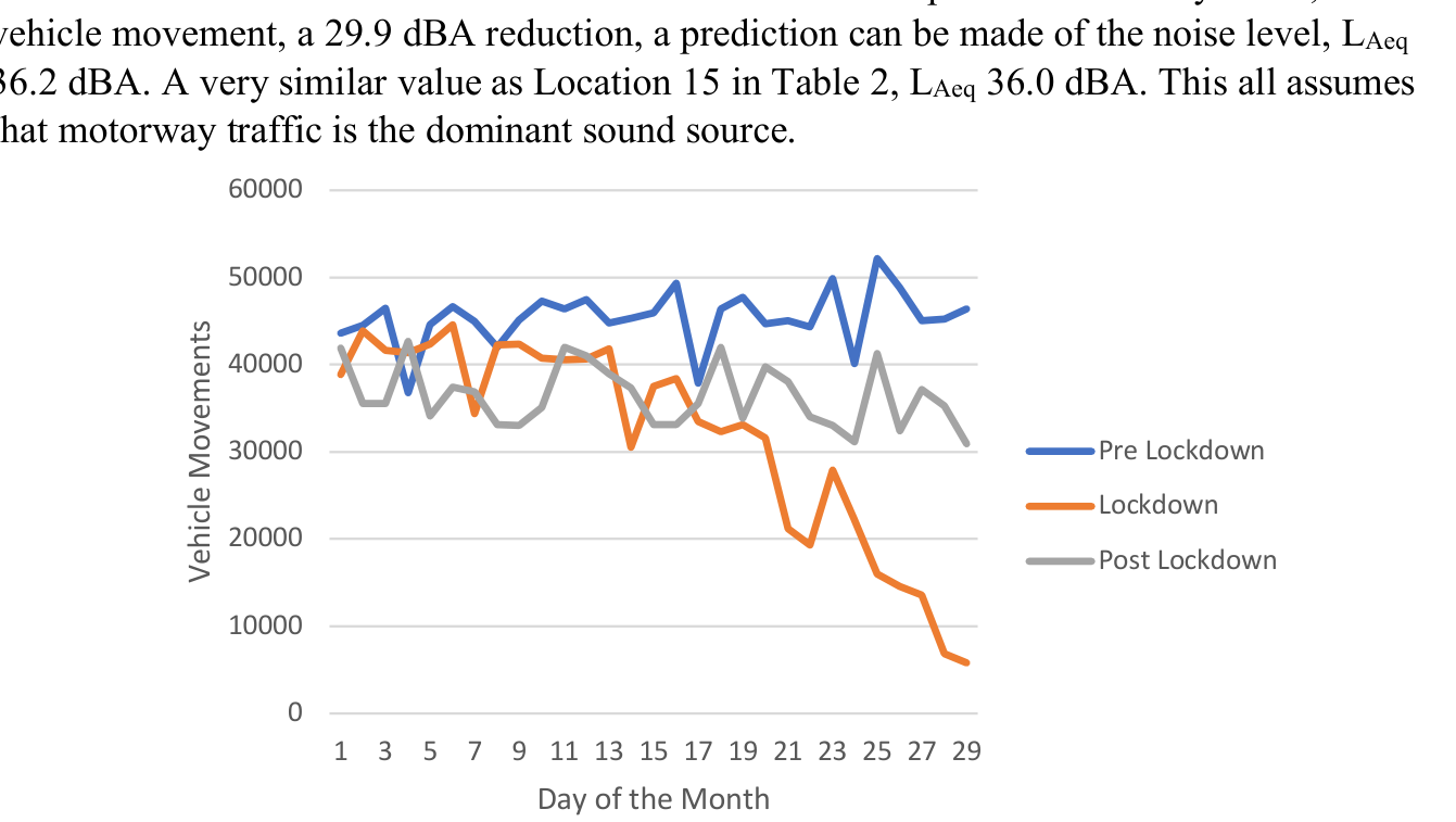 A A A Results from The Quiet Project- UK Acoustic Community’s response to COVID19 S. Dance 1 , H. Kowalik 1 , L. McIntyre 2 1 School of the Built Environment and Architecture London South Bank University London, UK SE1 0AA 2 KSG Acoustics Glasgow Scotland ABSTRACT The COVID-19 Lockdown created a new kind of environment both in the UK and globally, never experienced before or likely to occur again. A vital and time-critical working group was formed with the aim of gathering crowd-source high quality baseline noise levels and other supporting information. The acoustic community were mobilised through existing networks engaging private companies, public organisations, and academics to gather data in accessible places. A website was designed to advertise the project, provide instructions and to formalise the uploading of noise data, observations, and Soundscape feedback. The data was collected at 99 locations by 80 acousticians (64 male, 16 female) using professional grade calibrated instrumentation with 83% of measurements including spectral data. The locations covered 19 urban, 61 suburban, and 19 rural sites. The Lockdown 1 dataset consisted of a total of 1.6 GB of measurements and material (video, photos) covering 834 days between 1 st April and 14 th July 2020. This makes the award winning Quiet Project the largest ever noise and soundscape database ever recorded. The paper presents the quietest places in the UK and Ireland. As a government funded research project the databank will be made publicly available to assist future research. 1. INTRODUCTION The COVID-19 lockdown created a new kind of environment both in the UK and globally never experienced before or likely to occur again. The Quiet Project was conceived by the realisation that environmental noise levels had changed dramatically as communities across the country followed the UK Government’s advice to “Stay home”. The first COVID-19 outbreak occurred on 17 th November 2019 and arrived in the UK on 29 th January 2020. The UK Lockdown occurred on 23 rd March 2020. Hence, the Quiet Project was setup on 6 th April 2020 as a time-critical data gathering respond to collect and collate baseline noise data across the nation; table 1 shows the timeline of the UK outbreak. The UK currently has no permanent city-based high-quality monitoring installation and therefore was acoustically under-prepared for the outbreak. If such a system was available, then the noise evolution during Lockdown could have easily been monitored on a city scale. However, the situation provided the impetus and the opportunity to create a project to survey inter.noise 21-24 AUGUST SCOTTISH EVENT CAMPUS. ? O? ? GLASGOW the entire country. Development of the survey required a rapid response which was only possible due to the acoustic community’s willingness to participate to deliver what would be called the Quiet Project [1]. A working party was immediately formed comprising of consultants, government agencies, and academics. This working group defined the scope of the data to be gathered and, with the endorsement of the Institute of Acoustics, Association of Noise Consultants, Noise Abatement Society, and UK Acoustics Network (UKAN), a network of acoustic professionals was mobilised in record time. 17 Nov 2019 29 Jan 2020 23 Mar 2020 11 May 2020 1 June 2020 15 June 2020 Event 1st Case in the World 1 st UK Case Lockdown Starts Easing Schools reopen for Year 5 and 10 Non-essential shops open Status Level 1 Normal Life Level 1 Normal Life Level 4 Stay at Home Level 4 Stay Alert Level 4 Stay Alert Level 4 Stay Alert Table 1: Lockdown 1 status of the UK 2. METHODLOGY The full methodology is given in [2] but has been summarised as follows. Quality measurements were prioritised and hence smartphone collected was dismissed. Instead, the strategy of utilising a large number of furloughed acousticians was pursued. This provided the opportunity to utilise their expertise and spare time to undertake measurements and observations. The impact of COVID19 on the acoustics industry has been recently documented by a survey of over 200 UK acoustics companies by Lincoln [3]. The immediate issue was that as Lockdown happened overnight instrumentation was not readily available. This was solved by utilising UKAN to cover the shipping costs and leaning on the good will of leading acoustic instrumentation companies to organise the equipment, which was very kindly provided free of charge. Again, a key proviso was that only those on the contact list of the hire companies would be shipped the instrumentation. A pamphlet was produced which outlined how the measurements were to be taken, of course it was critical that all equipment was handled in line with government safety guidance. Hence only locations where explicit permission had been granted were used. Promotion of the project was from the Institute of Acoustics through their weekly Zoom meetings. A website, theQuietProject.co.uk [1], was designed which supplied the templates for data formatting and observations as well as hosting the databank. Measurements were to be taken using a calibrated and certified Class 1 or Class 2 noise monitoring equipment [4] for a period of at least one week and preferably longer in accordance with BS7445 [5]. A longer survey with good quality supporting information would minimise sources of potential uncertainty. Finally, acoustic related UK news items were gathered to provide further evidence of the environmental impact of COVID-19. 3. DATA COLLECTION Noise measurements were made at 15-minute intervals, starting on the hour, as this matched how transportation data, Transport Research Information Service (TRIS), is collected in the UK by Highways England [6]. As to the acoustic parameters: LAeq, LAMax, LA10 and inter.noise 21-24 AUGUST SCOTTISH EVENT CAMPUS. ? O? ? GLASGOW LA90 were to be recorded. In addition, optional spectral data would be collected. Addition information was added to the Excel te
