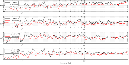 A A A Prediction of Far Field Sound Radiation Using Blocked Pressures and Reciprocally Measured Vibro-Acoustic Frequency Response Functions Lucy Barton 1 University of Salford The Crescent, Salford M5 4WT, UK Andrew Elliott 2 University of Salford The Crescent, Salford M5 4WT, UK John Smith 3 DSTL Porton Down, Salisbury, Wiltshire, SP4 0JQ, UK ABSTRACT In industry, the use of blocked forces for the characterisation of structure borne sound sources is now common practice, whereas the sound power is typically used for airborne sound sources. It should also be possible to use blocked forces (or blocked pressures) to predict airborne sound radi- ation using a similar approach and measurement methodology as the in-situ blocked force method. This is achieved by discretising the surface of the source into small unit cells, and measuring the vibration velocity whilst operational. To convert these velocities to blocked forces, the mobility of the source for each of the positions must also be known: and to predict the radiated sound, a meas- ured vibro-acoustic frequency response function is also required. Typically, vibro-acoustic FRFs are measured by exciting the structure with an instrumented hammer or shaker, but they may also be measured reciprocally using a volume velocity source. Described in the paper is an experiment conducted in a fully anechoic chamber to investigate the feasibility of the above approach, i.e. us- ing blocked pressures and reciprocally measured vibro-acoustic FRFs to characterise and predict airborne sound. The method is validated by comparing the directly measured radiated sound pres- sure to the predicted pressures, according to the above. 1 L.S.Barton@edu.salford.ac.uk 2 A.S.Elliott@salford.ac.uk 3 Not Supplied worm 2022 1. INTRODUCTION Structure-borne radiated noise is an important factor to consider in a multitude of settings. This in- cludes domestic appliances such as a washing machines, industrial equipment in factories, and vehi- cles such as cars and trains. Noise issues can present a range of problems, from causing annoyance, to structural damage. In order to predict the radiated noise, the structure which is radiating the noise must be characterised [1]. A now common method is to use the blocked forces of the system in the In-Situ Transfer Path Analysis approach [2]. Whereas the vibroacoustic FRFs are usually measured using an impact hammer, another option could be to measure the FRFs reciprocally, using a volume velocity source. Contained in this paper is a description of the Blocked Force iTPA method, and an experiment con- ducted in an anechoic chamber for the purpose of predicting radiated sound from a simple baffled plate test rig. In addition to a prediction using an impact hammer for the measured vibro-acoustic frequency response function, a volume velocity source is also used to reciprocally measure the FRF. The two predictions are compared to the measured sound radiated by the test rig when excited by a shaker mounted to the rear of the plate, producing white noise. 2. THEORY The in-situ blocked force method allows the source to remain in position, coupled to the receiver, throughout the analysis procedure entirely. This is in contrast to the classical Transfer Path Analysis matrix inversion approach [3], which requires the source to be uncoupled from the receiver at certain measurement stages. worm 2022 Figure 1: Schematic of source receiver structure, consisting of an arbitrary vibration source ‘A’, which is coupled to a receiver structure ‘B’. When operational, the source creates multiple forces at ‘(a)’, which are then transmitted through the interface ‘(c)’ to the receiver structure ‘B’. The receiver ‘(d)’ is the point at which a combination of the radiated sound from the receiver ‘B’ and airborne radiated sound from the source ‘A’ are measured as sound pressures. ‘C’ denotes the assembly as a coupled structure, and ‘(b)’ the vibration velocities on the plate. The blocked forces of the system can be found by: −1 𝑣ሶ 𝐶,𝑐 (1) 𝑓 ҧሶ 𝐴,𝑐 = 𝑌 𝐶,𝑐𝑐 + 𝑣ሶ 𝐶,𝑏 (2) 𝑓 ҧሶ 𝐴,𝑐 = 𝑌 𝐶,𝑏𝑐 + 𝑣 ሶ 𝐶,𝑐 𝑣ሶ 𝐶,𝑏 ൠ (3) 𝑌 𝐶,𝑐𝑐 𝑌 𝐶,𝑏𝑐 𝑓 ҧሶ 𝐴,𝑐 = 𝑇 ൨ ൜ Where: 𝑓 ҧሶ 𝐴,𝑐 = −𝑓ሶ 𝐴,𝑐 ห 𝑣ሶ 𝐴,𝑐 =0 (4) Upper-case subscripts are the structure elements A- source, B- receiver, C – coupled elements; lower case are measurement locations (a), (b), (c), (d); dot denotes that the source is operational, and bar denotes the blocked force. 𝑣ሶ 𝐶,𝑐 and 𝑣ሶ 𝐶,𝑏 are the vectors of complex velocities at measure- ment locations (c) and (b), on assembly C, whilst the source A is operational. Subscripts are ar- ranged as row (response) then column (excitation): 𝑌 𝐶,𝑐𝑐 and 𝑌 𝐶,𝑏𝑐 are matrices of frequency re- sponse functions of velocities due to force/ mobility [4], [5] . Assuming the direct sound pressure at (d) radiated from source A during measurement is negligible, the sound pressure due to the structure-borne noise radiated by the coupled assembly is defined as: 𝑃 ሶ 𝐶,𝑑 = 𝐻 𝐶,𝑑𝑐 𝐹 തሶ 𝐴,𝑐 (5) Where 𝐻 𝐶,𝑑𝑐 is the measured transfer function for the coupled assembly C. This transfer function can be measured in multiple ways. In this paper, the transfer function for 𝐻 𝐶,𝑑𝑐 will be measured in two ways: using a force hammer, which will be referred to as 𝐻 𝑝𝑓 - sound pressure due to force; and reciprocally with a volume velocity source, which will be referred to as 𝐻 𝑣𝑞 - surface velocities due to volume velocity. 𝑃 ሶ 𝐶,𝑑 = 𝐻 𝑝𝑓 𝐹 തሶ 𝐴,𝑐 (6) The reciprocal volume velocity transfer function is obtained by utilizing a reference microphone lo- cated a distance away from the assembly, and is calculated using: worm 2022 𝑗𝜌 0 𝑒 