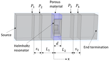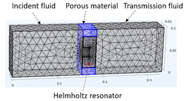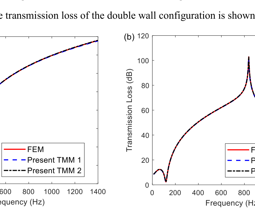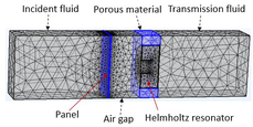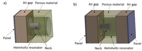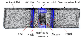 A A A Modelling of acoustic metamaterial sound insulator using a transfer matrix method for aircraft cabin applications Zacharie Laly 1 CRASH, Centre de Recherche Acoustique-Signal-Humain, Université de Sherbrooke, 2500 Boul. de l’Université, Sherbrooke, Québec, J1K 2R1, Canada. Department of Mechanical and Materials Engineering, Queen's University, 99 University Ave, Kingston , ON, K7L 3N6, Canada. Christopher Mechefske 2 Department of Mechanical and Materials Engineering, Queen's University, 99 University Ave, Kingston , ON, K7L 3N6, Canada. Sebastian Ghinet 3 National Research Council Canada, Aerospace, 1200 Montreal Road, Ottawa ON, K1A 0R6, Canada Charly T. Kone 4 National Research Council Canada, Aerospace, 1200 Montreal Road, Ottawa ON, K1A 0R6, Canada Noureddine Atalla 5 CRASH, Centre de Recherche Acoustique-Signal-Humain, Université de Sherbrooke, 2500 Boul. de l’université, Sherbrooke, Québec, J1K 2R1, Canada. ABSTRACT The incorporation of acoustic metamaterials in the design of aircraft fuselage panels in order to reduce the cabin low frequency noise is nowadays a major research subject aiming at offering passengers a comfortable cabin environment. In this study, acoustic metamaterial made of Helmholtz resonators periodically embedded into a porous material is investigated using transfer 1 zacharie.laly@usherbrooke.ca 2 chris.mechefske@queensu.ca 3 sebastian.ghinet@nrc-cnrc.gc.ca 4 tenoncharly.kone@nrc-cnrc.gc.ca 5 noureddine.atalla@usherbrooke.ca matrix approaches combined with finite element calculations. These transfer matrix methods are based on the two-load methods where the two loads in the numerical simulations are two different termination conditions (plane wave radiation and rigid wall) in order to retrieve the equivalent transfer matrix of the porous layer with embedded periodic Helmholtz resonators. The equivalent matrix is then coupled analytically in series with others analytical matrices to model complex multilayer metamaterials. The results of the transmission loss obtained exclusively using finite element method for single and double wall configurations are compared with the results of the proposed transfer matrix methods and good agreements are obtained. It is observed that the frequency band of the transmission loss of the double wall configuration is larger than the single wall configuration with higher transmission loss peak value. The investigated metamaterial can potentially be used in the design of aircraft cabin panels for low frequency noise reduction. 1. INTRODUCTION Low-frequency noise inside aircraft cabins is harmful to the health and well-being of passengers. Aircraft manufacturers need to improve the acoustic comfort in the cabin in order to provide passengers and aircrew the quietest and most comfortable environment. Acoustic metamaterials based on periodic Helmholtz resonators are a potential solution that can be used in the design of new vehicle cabins to attenuate low frequency noise. Prydz et al. [1] studied a multilayer panel, which contains internal Helmholtz resonators. They showed that the transmission loss of a double wall structure was improved by adding tuned acoustic resonators. Sugie et al. [2] investigated the acoustic performance of heterogeneous material consisting of a Helmholtz resonator embedded within a cavity of a double-leaf partition. They illustrated high sound insulation of the double-leaf partition at the resonance frequency of the resonator. Doutres et al. [3] investigated the acoustic properties of porous material with embedded periodic Helmholtz resonators and showed the transmission loss improvement at the resonance of the Helmholtz resonator. Abbad et al. [4] used numerical and experimental approaches to evaluate the acoustic performance of a front membrane-cavity Helmholtz resonator embedded in a porous matrix. They observed sound transmission loss enhancement at medium and high frequencies. Glass wool layer with embedded periodic Helmholtz resonators in single and double wall configurations was studied by Ghinet et al. [5]. They performed experimental measurements under diffuse field excitation to show the acoustic performance of the metamaterial design. A transfer matrix method (TMM) that combined with finite element calculations was proposed by Laly et al. [6,7] to model complex multilayer acoustic metamaterial. The proposed method was used to predict the transmission loss of porous material with embedded periodic Helmholtz resonator and the results showed good agreement with finite element method (FEM). Kone et al. [8,9] presented a hybrid numerical-analytical method to predict the sound absorption coefficient of complex metamaterials and the results were in good agreement with measurements. Porous layer with embedded periodic air-filled Helmholtz resonators was found to exhibit improved sound absorption coefficient in the viscous and inertial regimes [10]. Boutin and Becot [11,12] used the homogenization method to evaluate analytically the equivalent bulk modulus of a metamaterial made of rigid porous media with periodic inner resonators. They observed effective acoustic properties that depart from conventional poro-acoustic. Ding et al. [13,14] presented the effective properties of acoustic metamaterial containing different sized split hollow spheres and observed negative bulk modulus. Porous material with arranged periodic resonant inclusions (slotted cylinders) was studied by Lagarrigue et al. [15]. They showed good sound absorption of the metamaterial at low frequency. Soon- Hong Park [16] presented the low frequency sound absorption characteristics of an acoustic absorber made of micro-perforated panels backed by Helmholtz resonators. Selamet et al. [17] characterized analytically, numerically and experimentally Helmholtz resonators with the cavity lined with fibrous material and they presented parametric analysis to show the influences of the thickness and the resistivity of fibrous material o