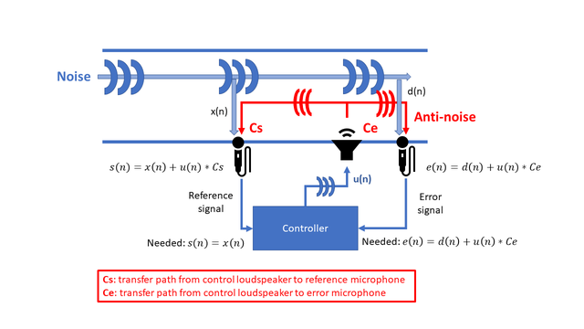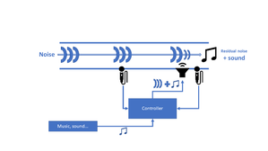 A A A Public address and sound reproduction by an active noise control sys- tem in ducted ventilation system Stéphane Lesoinne 1 Belgian Building Research Institute Rue du Lombard 42, B-1000 Bruxelles, Belgium ABSTRACT In a ventilation duct, two types of silencers are used: passive (medium and high frequencies) and active (low frequencies). Active silencers have a loudspeaker (control loudspeaker) that generates anti-noise. Usually, this system is placed near the source and far from the vent. But, in short ducts, the system is placed close to a vent and the control speaker can be used as a background speaker to play music, information, alerts (the target signal) ... The active noise control (ANC) system is based on the adaptive feedforward normalized FxLMS which uses a reference and an error microphone to pick up respectively the noise to attenuate and the residual noise after control. The algorithm is mod- ified so that the target signal does not contaminate the reference nor the error signals. The new algorithm is tested in real time in a short duct with different types of noise and different types of sound. 1. INTRODUCTION Modern buildings and housing requires efficient ventilation systems to maintain an indoor air quality within standard expectations. But noises passing through or emitted by the ventilation system have a major impact on the comfort, well-being, sleep quality, work-related task focus... An objective of the TowardsSmartVentilation research project is to reduce the noise emitted by centralized system as well as its perceived annoyance in mid-size building using passive as well as active techniques. On one hand, some mid-size buildings use public-address system (PA systems) for information and/or music diffusion through loudspeakers. Others use masking system to reduce noise annoyance by emitting pleasant sound that will mask/hide the unpleasant noise. For example, the annoyance caused by road traffic noise can be reduced by speakers that play bird songs [1, 2]. On the other hand, active silencers generate secondary sound waves (“anti-noise”) interfering negatively with the pri- mary noise in order to reduce its amplitude in a given region of space [3]. After the silencer, residual noise remains and depending on its sound level, can still be a source of annoyances. This paper study the feasibility of using the active silencer loudspeaker as a combined source of “anti-noise”, information, music and masking sounds. This will require to set the control loudspeaker close to an air outlet which is seldomly the case for centralized ventilation. But it also can be seen as moving the PA or masking system to the ventilation duct with the extra benefit of ventilation noise reduction by active noise cancelation, with an extra controller, Figure 1. 1 Stephane.lesoinne@bbri.be Figure 1 Scheme of sound broadcasting through a feedforward active noise control system The algorithm must be adapted and the modified version will be referred to as PA-ANC (Public Address - Active Noise Control) in the remainder of this document. These modifications will be pre- sented in the next section while the results of the tests in a rectangular-section duct will be presented in section 3. The tests will be performed on the basis of the Leaky Normalized FxLMS feedforward algorithm but the principle developed here can be used with any other algorithms. 2. FEEDFORWARD PA-ANC In this section, the principle of the feedforward ANC will be presented followed by the modifications needed to turn it into a PA-ANC system. Figure 2 Feedforward ANC Noise din) ad Anti-noise Cs = ce (0) = x(n) + u(n) + Cs Wl 7 | e(n) = dfn) + u(n) + Ce Reference Error signal signal Needed: s(n) = x(n) Needed: e(n) = d(n) + u(n) + Ce ansfer path from control loudspeaker to reference microphone Ce: transfer path from controlloudspeaker to error microphone As illustrated at Figure 2, the noise is measured by a reference microphone and this measurement is used by the controller to generate the anti-noise. The controller continuously adapts the anti-noise generation by changing internal coefficients in order to minimize the residual noise at the error mi- crophone. To efficiently reduce the noise, the controller needs to know both 𝐶𝑒 and 𝐶𝑠 , which are, respectively: - the transfer path between the towards-loudspeaker output and the error signal input and - the transfer path between the towards-loudspeaker output and the reference signal input. In the controller, 𝐶𝑒 is required at the adaptation stage and 𝐶𝑠 is needed to reconstruct the reference signal. Indeed, when the control loudspeaker emits the anti-noise 𝑢(𝑛) , the signal measured at the reference microphone becomes 𝑠(𝑛) = 𝑥(𝑛) + 𝑢(𝑛) ∗𝐶𝑠 , ( 1 ) which contains the noise and the anti-noise. In practice, as 𝐶𝑒 and 𝐶𝑠 are not known, the approxima- tions 𝐶𝑒 and 𝐶𝑠 (𝑛) will be used instead. The reconstructed reference signal is thus: 𝑥(𝑛) = 𝑠(𝑛) −𝑢(𝑛) ∗𝐶𝑠 , ( 2 ) The quality of these approximations is of higher importance as it has a major impact on the stability and the noise attenuation performance. Figure 3 PA feedforward ANC Now, as illustrated at Figure 3, in the PA-ANC system, the signal send to the loudspeaker is made of the anti-noise 𝑢(𝑛) and the information signal 𝑦(𝑛) . Thus, the signal measured at the reference microphone becomes: Noise d(n) alo) Anti-noise Cs(z) s(n) = x(n) + (ae(n) + y(n) # Cs ul en) = a(n) + (u(n) + y(n) # Ce ula) + vio) Reference wea Ercor signal Needed: s(n) = x(n) Needed: e(n) = d(n) + un) Ce 𝑠′(𝑛) = 𝑥(𝑛) + (𝑢(𝑛) + 𝑦(𝑛)) ∗𝐶𝑠 , ( 3 ) and the signal measured at the error microphone becomes: 𝑒′(𝑛) = 𝑑(𝑛) + (𝑢(𝑛) + 𝑦(𝑛)) ∗𝐶𝑒 , ( 4 ) The reference signal can be estimated by: 𝑥(𝑛) = 𝑠 ′ (𝑛) −(𝑢(𝑛) + 𝑦(𝑛)) ∗𝐶𝑠 , ( 5 ) And so i