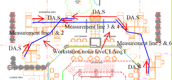 A A A Acoustic assessment of an open-plan office environment against the newly published ISO 22955 acoustic parameters Michel Batista Subsonic Designs 1383 Winged Foot Place, Centurion, Gauteng, South Africa, 0157 ABSTRACT This paper aims to assess the acoustic performance of an existing open-plan office environment with suspended sound absorbers below a hard reflective ceiling and low workstation dividers against the newly published ISO 22955 acoustic parameters. Room acoustic variables, such as sound absorption, screens between workstations, speech masking sounds and room dimensions all interact in a complex way affecting the values of single-number quantities presented in the ISO 22955 standard. In order to determine the in-situ performance, acoustic measurements were carried out on site. Odeon room acoustic prediction software was utilized to assess the efficiency of various acoustical remedies such as free hanging sound absorbers, wall to wall sound absorbing ceilings, dividers between work areas and increased height of dividers between workstations. The results from the in-situ room acoustic measurements demonstrate that the required value as described in the ISO 22955 standard is not easily achievable in the open-plan office environment without dividers with sufficient height between workstations and modest room acoustic features. The acoustic modeling results confirmed that the required level for the open-plan office, in terms of the ISO 22955 standard, is only attainable with a combination of room acoustic variables that go against modern interior designs. 1. INTRODUCTION There is an increasing trend worldwide to change from enclosed offices to open-plan office environments. Reasons include reduced cost associated with smaller building footprints and the belief that they promote better collaborative working spaces, social relations, communication and knowledge-sharing between employees. Architects and landowners prefer open-plan offices because of the spaciousness and the space planning flexibility [1]. The conventional open-plan office design, incorporating stand-alone screens and furniture, is usually replaced by either modular workstations, cubicles or linear workstations. The modern trend with which to experiment with the apparent innovative designs such as ‘activity-based workplaces’ and other variations where partial height screens between office workstations are absent or much reduced in size, is in conflict with acoustic solutions used to control speech propagation between workstations [2] and employee preference for screens between workstations for privacy [3]. Since the publication of the ISO 3382-3 [4] standard, a few countries have developed guidelines to describe classes of performance for various office settings due to the interpretation of the ISO 3382- 3 single number quantities which does not provide a clear description of the target values for different office settings such as individual or collaborative work settings. The newly published ISO 22955 [5] standard, provides more comprehensive, technical details and recommendations for what constitutes good acoustic quality in various open-plan office settings and defining the most important principles of room acoustic design compared to ISO 3382-3 standard. However, room acoustic variables, such as sound absorption, screens between workstations, speech a 2022 masking sounds and room dimensions all interact in a complex way, affecting the values of single- number quantities presented in the ISO 22955 standard. Good open-plan office acoustics is only attainable with the use of screens between workstations or work areas and highly sound-absorbing ceilings for individual or collaborative settings. This is in direct conflict with the modern trend where open-plan offices have no screens or very low screens between workstations to provide easy communication between employees. 2. ISO 22955: ACOUSTIC QUALITY OF OPEN OFFICES The ISO 22955 details some general recommendations for room layout and room acoustics features along with a methodology on workflow and analysis of spaces. The standard also provides guidelines for a number of typical office work activities. It describes their acoustic characteristics, challenges, and specifies acoustic indicators and values to accommodate them individually. The activity types described are: • Space type 1: Vacant floor – activity still unknown • Space type 2: Tele- and video communication – mainly focusing on external communication • Space type 3: Primarily collaborative work – verbal communication with nearby colleagues • Space type 4: Sporadic collaborative work – verbal communication with nearby colleagues • Space type 5: Welcoming areas – receiving the public • Space type 6: Mixed spaces – combining two or more activities in the same space This paper only focuses on two work type settings namely, primarily collaborative work and sporadic collaborative work. The acoustic indicators and values are presented in Tables 1 and 2. Table 1: Space type 3- Acoustic indicators and values — Activity mainly based on collaboration between people at the nearest workstation Interaction Acoustic challenges Description, criterion Target values Required values At workstation Ability to communicate without raising voice L Aeq, T ≤ 52 dB a Good to excellent intelligibility at workstation when speaking normally Attenuation Between workstations Communicating between team members Moderate attenuation between same team workstations D A,S ≤ 4 dB Satisfactory intelligibility within team when speaking normally On floor plate Reducing disturbance between teams T r ≤ 0,5 s b Attenuating amplification inherent to room as much as possible by reducing reverberation T r ≤ 0,8 s at 125 Hz D 2,S ≥ 8 dB L p ,A,S,4 m ≤ 48 dB Reducing noise in room by doubling distance a 2022 a During activity b Arithmetic mean of times for octave bands centred on 250 Hz to 4 000 Hz. Table 2: Sp
