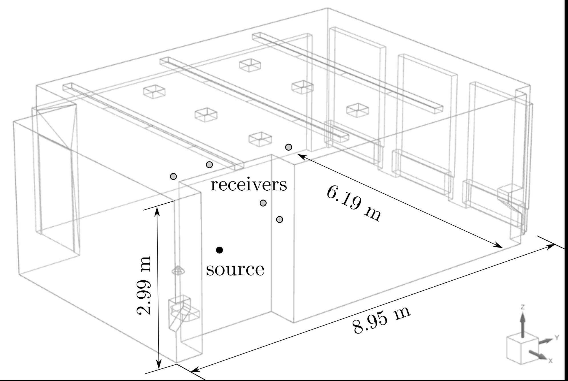 A A A A benchmark study on room acoustic simulations with various material inputs Yue Li 1 Siemens Digital Industries Software Interleuvenlaan 68, B-3001 Leuven, Belgium Julie Meyer 2 Department of Computer Science, Aalto University Konemiehentie 29, FI-02150 Espoo, Finland Tapio Lokki Department of Signal Processing and Acoustics, Aalto University Maarintie 8, FI-02150 Espoo, Finland Jacques Cuenca Siemens Digital Industries Software Interleuvenlaan 68, B-3001 Leuven, Belgium Onur Atak Siemens Digital Industries Software Interleuvenlaan 68, B-3001 Leuven, Belgium Wim Desmet Department of Mechanical Engineering, KU Leuven Celestijnenlaan 300, B-3001 Leuven, Belgium ABSTRACT This work investigates and evaluates the capabilities of an explicit finite-di ff erence time-domain (FDTD), a fast multipole indirect boundary element method (FMBEM), and a ray acoustic solver in the context of room acoustic modeling and simulations. In room acoustic simulations, the wave-based FDTD and FMBEM methods are known for generating accurate results at low frequencies, while the ray acoustic technique is in principle more valid at higher frequencies. The numerical aspects of setting up the solution for each solver are discussed. Special attention is given to the influence of material input data of various degrees of detail. Single / multiple frequency-independent / dependent materials are considered in the model setup. The modeling capabilities of the three solvers in handling material input with various complexities are analyzed. Numerical results are evaluated in 1 li.yue@siemens.com 2 julie.meyer@aalto.fi a slaty. inter.noise 21-24 AUGUST SCOTTISH EVENT CAMPUS O ¥, ? GLASGOW both frequency and time domains. Room acoustic parameters, including the reverberation time, early decay time, clarity, and definition, are compared. These results are also compared with available measurement data. Last but not least, the computational e ffi ciencies of the three solvers are briefly discussed. 1. INTRODUCTION In the era of digitization, acoustic simulations are useful to design, analyze and predict complex real-world acoustic scenarios. They can, for example, serve as an alternative to acoustical measurements. As such, acoustic solvers are useful tools in many application areas such as room acoustic and architectural design. Depending on the applications, various numerical techniques could be considered, ranging from wave-based simulations, ray-like approximations, to energy-based estimations. The selection of an appropriate solver normally relies on the physical size of the problem, frequency range of interest, precision requirement and available computational resources. For low / mid frequency acoustic phenomena such as the seat-dip e ff ect [1] or room modes [2], wave-based methods are normally preferred compared to others considering their high accuracy. A major limitation of wave-based methods, such as finite-di ff erence time-domain (FDTD) and fast multipole boundary element method (FMBEM), comes from their high computational demand in terms of memory and time. Ray-like acoustic solvers simplify the acoustic waves as rays which could significantly improve the computation e ffi ciency. However, such an assumption is in principle only valid at relatively high frequencies where the wave phenomena are less significant [3]. Besides, the recreation of real-world room acoustics plays an important role especially in the development of virtual reality and Metaverse. Such cases pose challenges and requirements on the numerical solvers in handling complex scenarios including complex material properties. This work presents a study on room acoustic simulation in mid-low frequency range with particular focus on complex material inputs. Two wave-based numerical solvers i.e. FDTD and FMBEM are the main focus of the study. A ray acoustic solver is also presented as a supplement in the comparison. The material input covers single / multiple frequency-independent / dependent properties. 2. NUMERICAL METHODS 2.1. Finite-di ff erence time-domain method The FDTD method can be used to solve the homogeneous scalar wave equation which can be expressed in the 3D Cartesian coordinate system as follows ∂ 2 p ∂ t 2 = c 2 ∂ 2 p ∂ x 2 + ∂ 2 p ∂ y 2 + ∂ 2 p ! , (1) ∂ z 2 where p ( x , y , z , t ) is the acoustic pressure, and c is the speed of sound in the fluid. Considering the widely-used explicit standard rectilinear (SRL) scheme, the discretization of Eq. (1) in space and time leads to δ 2 t p n l , m , i = λ 2 ( δ 2 x + δ 2 y + δ 2 z ) p n l , m , i , (2) where λ = cT / X is the Courant number (set to the stability limit of the SRL scheme, i.e. λ = 1 / √ 3) with time step T = 1 / f s , where f s denotes the temporal sampling frequency, and spatial grid spacing X . p n l , m , i ≡ p ( x , y , z , t ) | x = lX , y = mX , z = iX , t = nT is the update variable, n denotes the time index and l , m , and i are the spatial indices in the x -, y -, and z -direction, respectively. δ 2 t , δ 2 x , δ 2 y , δ 2 z are the second-order derivative centered finite-di ff erence operators. A key input simulation parameter controlling the accuracy of the FDTD simulation results is the temporal sampling frequency f s (inversely proportional to the spatial grid spacing X ) of the simulation. Interestingly, there is no general consensus on how to choose this parameter such that “accurate- enough” simulation results can be obtained. This is mostly due to the facts that the accuracy criterion is strongly context- or application-dependent, and that the computational resources are limited in practice. In room acoustics and related fields, dispersion analysis is the most commonly employed method for error analysis [4]. Several di ff erent accuracy criteria were used in previous studies using the dispersion analysis method. For example, in Ref. [5], the phase velocity error was limited to 2% whereas in Ref. [6], the error was limi