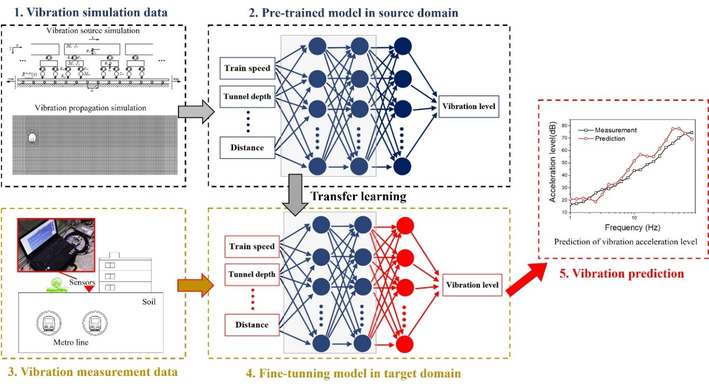 A A A Study on the Scoping prediction of Railway-induced environmental vi- bration based on Transfer learning Ruihua Liang 1 , Weifeng Liu 2 Key Laboratory of Urban Underground Engineering of Ministry of Education, Beijing Jiaotong Uni- versity Beijing 100044, China ABSTRACT While the urban rail transit infrastructures provide convenience to people, environmental vibrations and radiated noise generated by its operation can also affect the residents in the surrounding build- ings. Therefore, during the preliminary design stage of railway lines, extensive vibration scoping prediction needs to be carried out, which can promote reasonable vibration mitigation design, thus minimizing the impact of the railway induced environmental vibration. Considering the limitations in the accuracy of existing methods, a deep learning-based vibration scoping prediction model is proposed in this paper. Moreover, the transfer learning strategies are used to enable the model to be trained with the railway induced vibration data obtained from both numerical simulations and field measurements, which allows the model to be trained more sufficiently and thus achieve higher pre- diction accuracy while keeping high efficiency. To validate the performance of the proposed method, a case study is presented. Specifically, vibration data under different conditions obtained from nu- merical simulations and measurements are used to train and test the deep learning-based models using transfer learning strategies. Then, by comparing the performance of the trained model with the existing scoping methods, the feasibility and advancement of the proposed method are demonstrated. 1. INTRODUCTION In recent years, urban rail transit infrastructure has been widely developed in major cities around the world. However, while rail transit provides convenience for the travel of urban residents, it also brings severe environmental vibration impacts. Excessive vibration and the structure-radiated noise it causes could affect the normal life of residents around the railway line [1, 2]. Therefore, scoping prediction of environmental vibration is necessary during the design phase of a new railway line, which could ensure that the environmental vibration impact on the buildings surrounding the line is acceptable after construction is completed. In recent decades, various models have been developed to predict the environmental vibration caused by trains, which can be broadly classified into numerical [3], empirical [4], and hybrid meth- ods [5]. Due to the different demands on the efficiency of vibration prediction, different methods are often used to carry out vibration prediction at different stages of railway construction. In particular, the empirical models, as fitting models based on existing vibration data, are able to achieve very efficient environmental vibration prediction and therefore are usually used for scoping prediction during the design phase of a new railway line. Currently, this vibration prediction method has been widely adopted by the standards of countries all over the world. 1 18115029@bjtu.edu.cn 2 wfliu@bjtu.edu.cn worm 2022 Recently, data-driven machine learning (ML) techniques have been rapidly developed, which are able to create adaptive fitting relationships between conditions and responses, thus reducing the prediction errors caused by fixed fitting relationships in empirical methods [6]. These techniques have been widely used in studies related to prediction and classification in various engineering fields. Spe- cifically, Connolly [7] and G. Paneiro [8] have conducted studies on the scoping prediction of train- induced vibrations based on the artificial neural network (ANN) models, and both achieved good prediction performance. However, one significant drawback of ML-based train-induced vibration prediction is that it is very dependent on the quantity and quality of actual vibration measurement data. In engineering, it is very expensive to perform vibration measurements and even more difficult to collect vibration data under complex condition variables, this situation leads to the inability to train ML-based models with sufficient vibration samples, which limits the accuracy of the method for scoping prediction of rail- way-induced vibration. To deal with the over-reliance of ML methods on data from a particular domain, transfer learning (TL) techniques have been introduced in recent years and are widely used in many tasks in various engineering fields [9]. The concept of TL is to transfer the prior knowledge obtained in a source domain with sufficient data to a target domain with fewer data, thus improving the prediction accu- racy of ML-based models in the target domain [10]. In the field of train-induced environmental vibration, measured vibration data are accurate but also costly, while simulated vibration data generated using numerical models are low cost but with discounted accuracy. Therefore, the application of TL techniques to enable ML-based models to con- sider simulated vibration data when optimizing with measured vibration data is a promising concept, which can reduce the overdependence of the method on costly measurement data and improve the accuracy of the method. In this paper, a TL-based method for predicting train-induced environmental vibration is presented, and a case study is presented to demonstrate the performance of the proposed method. 2. METHODOLOGY 2.1. Related Background Knowledge In these developed ANN-based train-induced environmental vibration prediction models, the inputs of the model are various condition variables related to the vibration magnitude, such as train speed, tunnel burial depth, and soil parameters. The output of the model is the magnitude of the en- vironmental vibration induced by trains, e.g., vibration decibels VdBmax. The mathematical relation- ship between model inputs and outputs is modelled by a large number of weight parameters in the ANN model, the values of
