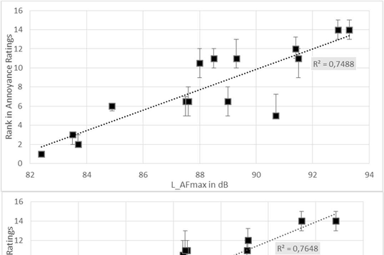 A A A Quantifying the annoyance caused by flats on the wheels of railway vehicles Manfred Liepert 1 Moehler + Partner Ingenieure AG Prinzstraße 49, 86153 Augsburg, Germany Christine Huth 2 Moehler + Partner Ingenieure AG Prinzstraße 49, 86153 Augsburg, Germany ABSTRACT As part of a research project by the Federal Environment Agency, measurements of the pass-by noise of railway vehicles with and without flats on the wheels were conducted. The aim of the project was to define an acoustic maintenance criterion for the wheels. To do so, listening tests were carried out to quantify the annoyance of the noise caused by a flat. In order to determine the level adjustment equivalent to the increased annoyance, the following method of adjustment was used. The test sub- jects were each presented a pair of sounds consisting of a vehicle passing with and a vehicle passing without a flat. By raising or lowering the level of the signal without a flat, the test subjects were able to adjust the two signals individually to “equal annoyance”. Furthermore, different noise levels and psychoacoustic indices were tested in order to describe the impact of the flat on the caused annoy- ance. 1. INTRODUCTION As part of a research project by the German Federal Environment Agency (Umweltbundesamt) on the subject of "measuring wheel flats and defining an acoustic maintenance criterion", listening tests were carried out to quantify the annoyance of passing trains with a so-called flat spot (wheel out-of- roundness). The aim of the tests was to quantify the annoyance of audible flat spots and to propose a method for evaluating the annoyance based on a level adjustment. 2. AIM OF THE STUDY With the conversion of the freight wagons running on the German rail network to low-noise braking systems, a significant contribution was made to the noise protection target 2020 [1] of the Federal Ministry of Transport and Digital Infrastructure, the reduction of railway noise by half. The "loud" block brakes with cast iron brake blocks that had been the standard up to that point were replaced by so-called LL blocks (for retrofitting) or K blocks (for the commissioning of new freight cars). The reduced roughening of the wheel treads by these new brake blocks results in a reduction in rolling 1 Manfred.liepert@mopa.de 2 Christine.huth@mopa.de inter.noise. 21-24 AUGUST SCOTTISH EVENT CAMPUS ? O? ? GLASGOW noise of around 5 dB(A) at 100 km/h on an average track. Depending on the condition of the track, significantly higher reductions in level can be determined by measurement. In the course of the conversion, freight wagons with LL blocks or K blocks and cast iron blocks can be coupled in a train set. Due to the different braking curves (dependence of the speed of a braking train on the braking distance), individual wheel sets can be blocked. When the locked wheel slides on the rail, the softer wheel wears down, because the wheels are made of a softer steel than the rail. This creates what is known as a flat spot. In addition to this mechanism of the formation of wheel flats, there are other mechanisms of formation of different wheel shape errors that lead to a noticeable increase of rolling noise. With the successful reduction of the undisturbed rolling noise, the flat spot noises are now subjec- tively more prominent and are perceived as annoying by residents. In this study, the annoyance caused by these noises are evaluated. The two main questions are: • How can the annoyance of the flat spots noise be quantified in terms of a level adjustment? • Which acoustic measure is most suitable for predicting the annoyance of flat spots? 3. DATA For the subjective evaluation of the noise caused by wheel flats, listening tests were carried out in the laboratory as part of the research project. A survey among residents on the salience of flat surface noises did not appear to be expedient due to the unpredictable occurrence of flats. For the listening tests, recordings of passing trains with simultaneous detection of flat spots in the train were therefore required. The recordings were made over a period of one month at the railway line between Munich and Rosenheim. The measurement campaign was carried out in cooperation with Müller-BBM Rail Technologies GmbH in the immediate vicinity of the monitoring station of the Federal Railway Authority (Eisenbahn-Bundesamt) [2]. The wheel monitoring system (WMS) [3] was used to identify flat spots. This detection was validated and enhanced by signals from accel- eration sensors on the rail foot and microphone signals. The microphone signals were recorded at a distance of 7.5 m and 25 m from the measured track. WMS WMS-Database left right 7,5 m Microphone signal 25 m left Acceleration signal right right rail left rail Figure 1: Measuring setup for recording trains passing by with simultaneous flat spot detection inter.noise. 21-24 AUGUST SCOTTISH EVENT CAMPUS ? O? ? GLASGOW During the measurement period of one month, a total of around 3,000 train passes were recorded, 1,130 of which were freight trains and 1,825 passenger trains. 3. LISTENING TESTS A selection was made from the recordings of trains passing by, which were recognized by the WMS as passings with a wheel flat and whose audio recording contained a perceptible (i.e. noticeable) noise from the wheel flat. 3.1. Experimental design The listening tests for the subjective evaluation of the flat spot noises were carried out in the listening booth of Möhler + Partner Ingenieure AG. The listening booth is characterized by a quiet and visually neutral environment. The sounds were presented using electrostatic headphones from the Lamda se- ries by Stax. A total of 20 subjects aged between 25 and 51 took part in the listening tests. Figure 2: Listening booth of Möhler + Partner Ingenieure AG; The sounds are presented using Stax electrostatic headphones 3.2. Experimental layout for the level adjustment A tracking method was used to assess the an