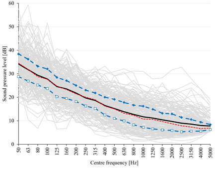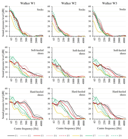 A A A Masking effect of HVAC noise on walking sounds on concrete floors Jesse Lietzén 1 , Mikko Kylliäinen 2 Tampere University Unit of Civil Engineering P.O. Box 600 33014 Tampereen yliopisto, Finland Ville Kovalainen 3 AINS Group Department of Acoustical Engineering Ilmarisenkatu 18 A 20520 Turku, Finland ABSTRACT Background noise masks living sounds in apartment buildings. Depending on the sound insulation properties of the structures of the apartments, background noise affects the audibility of the perceived airborne and impact sounds from neighboring dwellings. This preliminary study focused on the masking effect of the background noise generated by HVAC systems on the impact sounds generated by walking on concrete floors. The study was carried out by determining the signal-to- noise ratios of walk induced sound levels on the concrete floors and measured background noise levels. The walking sounds were generated by walking with socks and shoes on nine concrete floors, and the sound pressure levels were measured in a receiving room below the floors. These walking sounds were compared with background noise levels which consisted of the results collected in 210 measurements in Finnish apartment buildings. The results of the study indicate that the background noise masks sound from walking with socks and shoes differently. 1. INTRODUCTION Living sounds comprise both airborne and impact sounds caused by human activities such as talking, music, children playing, and walking. A subjective perception of sound insulation against living sounds between neighboring dwellings is affected by the level and the character of the sounds as well as the sound insulation properties of the structures between rooms. Furthermore, the perception of sound insulation depends on the background noise of the receiving room due to sound masking effect [1]. In apartment buildings, the background noise usually occurs due to environmental sound sources, such as traffic, and HVAC systems. In case of airborne sound insulation, it has long been recognized that the masking effect is an important factor for the perceived sound insulation [2–4]. Increasing background noise in buildings, leads to improved speech privacy between rooms [5]. The background noise also affects the perception of drum sounds, i.e., the walking sounds generated in the same room with listeners [6]. 1 jesse.lietzen@tuni.fi 2 mikko.kylliainen@tuni.fi 3 ville.kovalainen@ains.fi Furthermore, the masking effect is a relevant issue for the perceived impact sound insulation, however, at low-frequencies, it is possible that the background noise cannot affect the audibility of the walking induced impact sounds [7, 8]. The purpose of this preliminary study was to investigate the masking effect of HVAC noise on walking sounds on concrete floors. This study combines data from two studies carried out in 2012. First, the data includes laboratory measurements of walk induced impact sounds on nine concrete floors. Secondly, field measurement data from background noise level spectra measured in 210 Finnish apartment rooms have been used. To study the masking effect of the HVAC noise, signal- to-noise ratios (SNR) of walk induced sound levels and background noise were determined. 2. MATERIALS AND METHODS 2.1. Walking sounds on concrete floors The experiments were carried out at a laboratory, where the bearing floor structure was a 265 mm thick concrete hollow core slab (400 kg/m 2 ) [9]. The floor, on which the walking tests occurred, lied between vertically adjacent source and receiving rooms. The measured reverberation times of the receiving room corresponded well with those of typical furnished rooms in Finnish dwellings [10]. Therefore, the sound spectra measured in the receiving room can be considered to correspond well with the typical spectra in residential dwellings. In addition to the bare floor (F1), the experiments were carried out on eight covered floors (F2– F9) to cover the typical impact sound insulation spectra found in dwellings. The size of the floor covering was 3,0 x 4,0 m 2 in each case. Table 1 shows the layers of floor surface structures for all the studied floors, as well as the weighted reduction of impact sound pressure levels Δ L w for floor coverings, and dynamic stiffnesses s ’ for mineral wools. Furthermore, the measured single-number quantities (SNQ) L ’ n,w and L ’ n,w + C I,50-2500 have been shown for each floor in Table 1. These standard measurements were carried out by using a tapping machine. Note that in case of negative spectrum adaptation terms C I,50-2500 , the value of the term in the sum L ’ n,w + C I,50-2500 was 0 dB. Tab le 1: The structural layers of floor coverings on the nine studied floors, and SNQs of the floo rs. Denotation Structural layers of floor covering L ’ n,w L ’ n,w + C I,50–2500 Floor F1 No covering 80 dB 80 dB Floor F2 Cushion vinyl, Δ L w = 2 dB 78 dB 78 dB Floor F3 Cushion vinyl, Δ L w = 21 dB 59 dB 59 dB Floor F4 Multilayer parquet and soft underlay, Δ L w = 20 dB 60 dB 60 dB Floor F5 Wall-to-wall carpet, Δ L w = 21 dB 59 dB 59 dB Floor F6 Wall-to-wall carpet, Δ L w = 37 dB 43 dB 47 dB Multilayer parquet 14 mm Soft underlay 2 x plasterboard 15 mm (30 kg/m 2 ) Mineral wool 13 mm, s ’ = 16,1 MN/m 3 Floor F7 51 dB 56 dB Multilayer parquet 14 mm Soft underlay 2 x plasterboard 15 mm (30 kg/m 2 ) Mineral wool 50 mm, s ’ = 11,5 MN/m 3 Floor F8 44 dB 53 dB Multilayer parquet 14 mm Soft underlay 4 x plasterboard 15 mm (60 kg/m 2 ) Mineral wool 50 mm, s ’ = 11,5 MN/m 3 Floor F9 42 dB 48 dB The present standardized SNQs expect that the main impact sound source is walking with hard- heeled shoes. This sound type does not necessarily reflect the most typical impact sounds in all countries [11–14]. Therefore, three male walkers W1, W2 and W3 (Table 2) wore socks, soft- heeled shoes, and hard-heeled shoes in the walking sound experiments. The same personal footwear was used through th