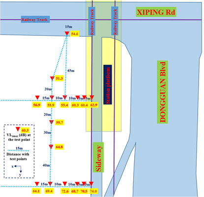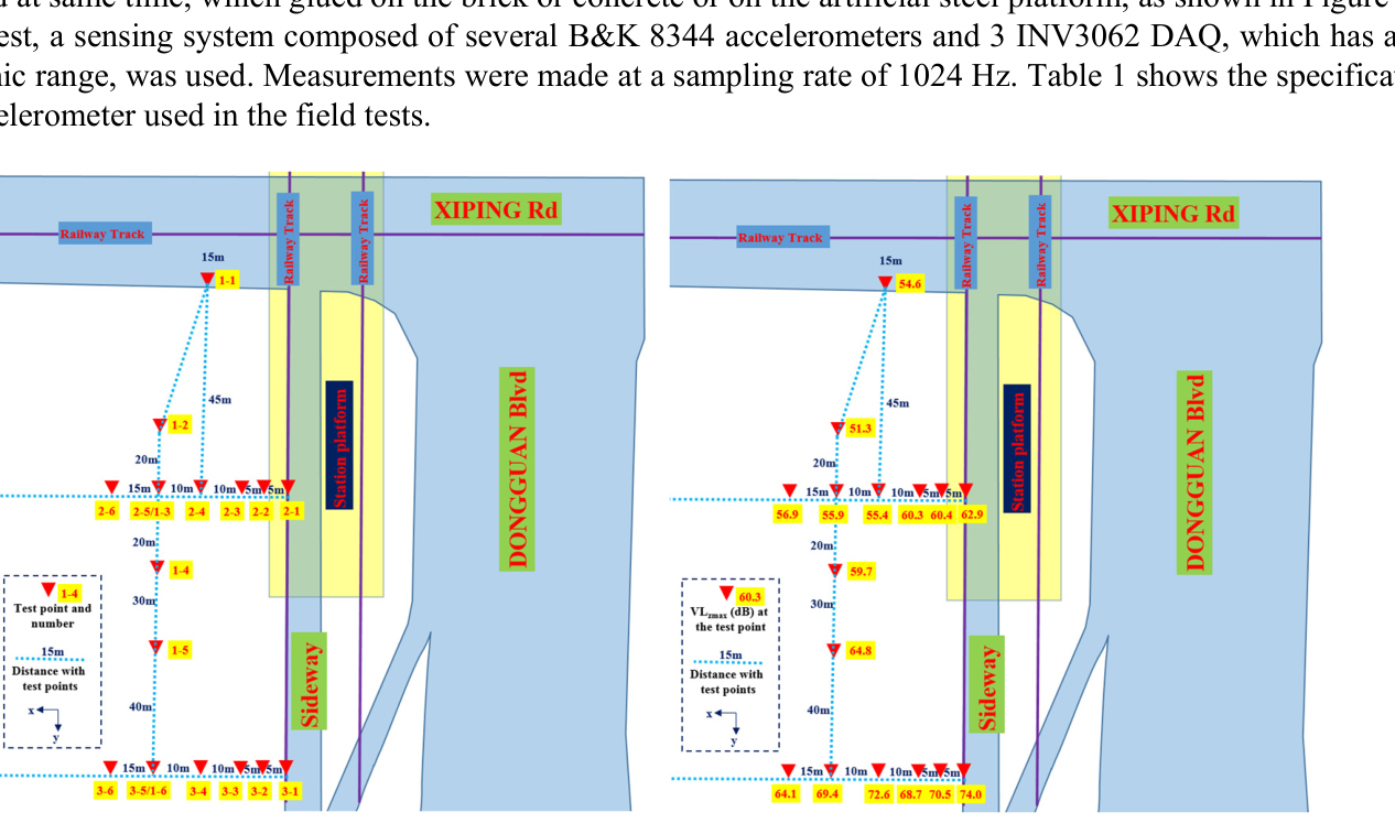 A A A The time-frequency characteristics analysis and prediction of ground vibration near a subway station Bideng Liu 1 , Yubin Wu, Ruixiang Song, Lei He and Qiong Wu Institute of Urban Safety and Environmental Science, Beijing Academy of Science and Technology No. 55, Taoranting Rd, Xicheng, Beijing, 100054, P.R. China ABSTRACT This paper presents the time-frequency characteristics of ground vibrations near subway stations through field tests and analyses. More than 15 ground vibration measurement points are set up in the longitudinal and transverse directions of the track near a subway station. Overall, the ground vibration level (VL zmax ) above the tunnel is approximately 73 dB on the border between the station and mainline, while it attenuates to 63 dB away from the tunnel by approximately 30 meters; the dominant frequency in the mainline area is approximately 63-80 Hz. The results in the longitudinal direction show that the ground vibration increases rapidly as the train drives away from the station because of the train speed growing, and VL zmax is less than 10 dB between the station and near the mainline areas, while the dominant frequency in the mainline area is higher than that in the station area. The attenuation rate of the ground vibration in the transverse direction for the mainline area is faster than that for the station area. The power distribution law y=A*x - ᅇ can describe the vibration attenuation characteristics, and its "peak and long tail effect" and "scale-free characteristics" can predict the vibration at any position by measuring two specified locations. 1. INTRODUCTION The speed of transit-oriented development (TOD) in metropolitan areas in China is becoming increasingly faster and significant for the following reasons: (1) With the deepening of the urbanization process, the need for increasing efficiency for traffic and growing intolerance to congestion by the huge number of private cars in core cities is increasing; (2) With the promotion of the integrated construction of metropolitan areas, the construction land available for development in central cities is becoming increasingly scarce. City blocks developed according to the TOD concept have become popular, such as in Hong Kong, Tokyo, Copenhagen, Guangzhou, Chongqing, Dongguan and Shenzhen [1], because of more possibilities brought by efficient transportation and open urban spaces, such as vertical urban design. There is little research on the assessment of environmental vibrations induced by subways near the station. However, vibration evaluation in the station area is of great significance to the application of TOD in metropolises in China. Researchers in England [2], Switzerland [3], Japan [4] and China [5] report that excessive environmental vibration is harmful to human beings. The vibration characteristics induced by railway operation in station areas are different from those in mainline areas because of the traveling speeds and accelerating or deceleration of trains, the type of tunnel structures, different wheel-rail systems, complex track line conditions and track bed systems. In this research, the ground environment vibration near a subway station, while the tunnel is buried approximately 15 meters below the ground and the Type-5B-Train was operated in the tunnel, was measured through a high-precision vibration sensing network. The analysis results of the maximum Z vibration level (VL zmax ) [6] and 1/3 Octave spectrum of multiple observation points show that the vibration increased rapidly with the train departures, and the vibration attenuated rapidly as the locations moved away from the tunnels. The power distribution law y=A*x - ᅇ can describe the ground vibration attenuation characteristics with the distance from the track, while the linear fitting equation y=B+C*x can predict the ground vibration level with the distance from the station. 2. METHODOLOGY The methodology for this research was reported in this part, such as instrument specifications, the sensor arrangement in the field testing for environmental vibration measurement, and the performance assessment criteria. 1 bidengliu@vip.163.com inter.noice’” 21-24 AUGUST SCOTTISH EVENT CAMPUS GLASGOW 2.1 Experimental setup and instrumentation Ground vibration measurement locations were categorized as (1) perpendicular to the track direction, which was defined as transverse (x), and (2) parallel to the track direction, which was defined as longitudinal (y). Twelve train- induced measurement sites with two profiles in the transverse (x) direction were selected to consider the different ground vibrations with different distances away from the track, which are in the mainline and station areas. Another 4 measurement sites in the longitudinal (y) direction were selected to consider the different ground vibrations with different distances away from the station. Figure 1 (a) shows the measurement sites setup in plan view, which contains a transverse direction profile in the station area (2-1, 2-2, 2-3, 2-4, 2-5, 2-6), in the mainline area (3-1, 3-2, 3-3, 3-4, 3-5, 3-6), and a longitudinal direction profile along the track (1-1, 1-2, 1-3, 1-4, 1-5, 1-6). The distance in the transverse direction of the mainline area and station area is approximately 90 meters. Sixteen accelerometers were positioned on the ground at same time, which glued on the brick or concrete or on the artificial steel platform, as shown in Figure 2. In the field test, a sensing system composed of several B&K 8344 accelerometers and 3 INV3062 DAQ, which has a 160 dB dynamic range, was used. Measurements were made at a sampling rate of 1024 Hz. Table 1 shows the specifications of the accelerometer used in the field tests. (a) Measurement setup (b) Measurement results for one simultaneity case Figure 1 : Sketch map of the measurement locations (Plan view) and VL zmax at each location. (a) On the brick (b) On the concrete (c) On the artificial steel platform Figure 2 : Accele