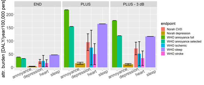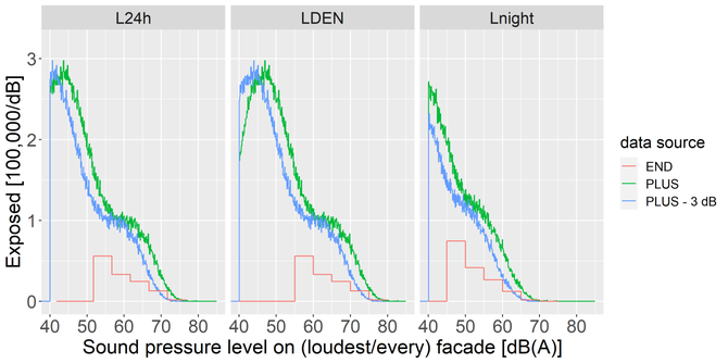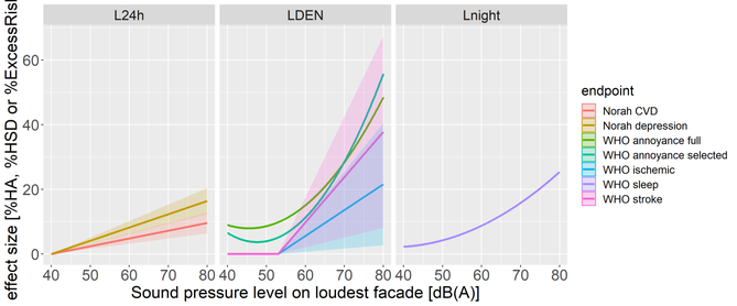 A A A Assessing the environmental burden of disease due to road traffic noise in Hesse, Germany Matthias Lochmann 1 HLNUG (Hessian Agency for Nature Conservation, Environment and Geology) Rheingaustraße 186 65203 Wiesbaden Germany Janice Hegewald 2 Melanie Schubert 3 Andreas Seidler 4 Institute and Policlinic of Occupational and Social Medicine, Faculty of Medicine, Technische Universität Dresden, 01307 Dresden, Germany ABSTRACT As guidance for informed decision-making, we estimated the environmental burden of disease at- tributable to road-traffic noise in Hesse. Using detailed road-traffic-noise exposure data provided by HLNUG, we calculated the DALYs due to road-traffic noise > 40 dB(A) L 24h (unweighted average 24 h noise level) and other noise metrics for endpoints with known dose-response functions and evidence in the literature (NORAH-study on disease risks and WHO reviews). For Hesse, we found a total of 26,501 DALYs attributable to road-traffic noise or 435 DALY per 100,000 persons for the reference year, 2015. The end points "Annoyance" and "Sleep disturbance" contribute more than 70 % of the burden. Further, we estimated that a hypothetic uniform road-traffic-noise reduction of 3 dB would prevent 23% of this burden of disease. We are planning to suggest an alternative approach to extract an annoyance function from raw data used in the WHO-review. Our findings imply that the burden attributable to street-traffic-noise is of the same order of magnitude as, for example, the more fully researched environmental risk factor particulate matter. HLNUG is evaluating expanding the BoD- approach including uncertainty assessment to other environmental risk factors and its use for inform- ing decision makers. 1 INTRODUCTION In our contribution to INTER-NOISE 2022, we summarize the outcomes of a project which is re- ported in [1] with more epidemiological details. Here, we focus on the technical/ acoustical aspects. Road-traffic noise is the largest source of noise pollution in Europe by far [2]. According to the World Health Organization (WHO), about 40% of the European population is exposed to road traffic- weighted day–evening night-noise levels (LDEN) of ≥55 dB(A) [3]. Exposure to road-traffic noise 1 Matthias.Lochmann@hlnug.hessen.de 2 janice.hegewald@tu-dresden.de 3 melanie.schubert@tu-dresden.de 4 andreas.seidler@tu-dresden.de worm 2022 has short- and long-term adverse effects on physical and mental health and well-being. Cardiovascu- lar and metabolic effects [4], sleep disorders [5] as well as mental disorders [6], and severe annoyance [7] are associated with prolonged exposure to road-traffic noise. One method of quantifying health loss is to calculate disability-adjusted life years (DALYs). DALYs are a measure that sums the pro- jected years of life lost due to mortality and years of healthy life lost due to non-fatal morbidity. The WHO and the World Bank introduced this concept in their Global Burden of Disease (GBD) study to quantify and compare health loss in different world regions [8, 9]. DALYs aid decision-making and help to derive recommendations for intervention measures. 2 DATA SOURCES worm 2022 Figure 1: Road noise mapping according to END (left) and PLUS (right) at the example of a hessian community. 2.1 Exposure data The HLNUG is in charge to perform the noise mapping according to the European Noise Directive (END). The required noise measures are the time-weighted day-evening-night level 𝐿 𝐷𝐸𝑁 and the unweighted night level 𝐿 𝑛𝑖𝑔ℎ𝑡 . However, the HLNUG also performed a more detailed noise mapping [10] 1. based on a more complete dataset of road traffic data provided by Hessen Mobil, covering not all, but more roads than required by END 2. calculating down to 𝐿 𝐷𝐸𝑁 > 40 dB(A) and 𝐿 𝑛𝑖𝑔ℎ𝑡 > 40 dB(A) auterbaéh LDEN [dB(A)] >40. G-«. _es _ Mo mss. a>: 002505 1 6 ReRB ” a 45 ‘ddometer These two differences are obvious in the comparison of both mapping versions in Figure 1. The third main difference between the END- and PLUS-exposure data as used here consists in the way of his- togramming: the assignment of exposure levels to inhabitants of buildings. The END requires dis- tributing the inhabitants of a house to a set of façade points, and assigning the respective exposure levels as indicated in Figure 2. Figure 2: Illustration of the distribution of façade points on a building; taken from [11, p. 6]. At every façade point, the exposure levels have to be calculated. For our mapping “END” in 2016, all of them were assigned to inhabitants; for the upcoming noise mapping round 2022, only the loudest half of the façade points is used (this method is not considered here). For our mapping “PLUS” only the façade point with the highest level was considered for all inhabitants. worm 2022 However, virtually all dose-response studies considered here, imply the assignment of the loudest façade level to all inhabitants of the building instead. This leads to an important upshift of the expo- sure distribution compared to the END-required assignment. We decided to use the loudest façade assignment for our PLUS-data and rather to be compatible to the dose response-literature, than to the official END-requirements. In [10] however, also the assignment to the respective façade level was used. For burden estimations, we used histogrammed exposure data, as shown in Figure 3. In order to be able to use the 𝐿 𝐷𝐸𝑁 -exposure data with the dose-response functions derived for unweighted contin- uous sound pressure levels over 24 h ( 𝐿 24ℎ ), we transformed the exposure data using the conversion, 𝐿 𝐷𝐸𝑁 − 3.3 𝑑𝐵 = 𝐿 24ℎ [14]. 2.2 Dose-Response-functions We selected the health outcomes for our DALY calculations based on systematic reviews conducted for the “WHO Environmental Noise Guidelines for the European Region” project [4, 5, 7, 12–18] and on more recent evidence 