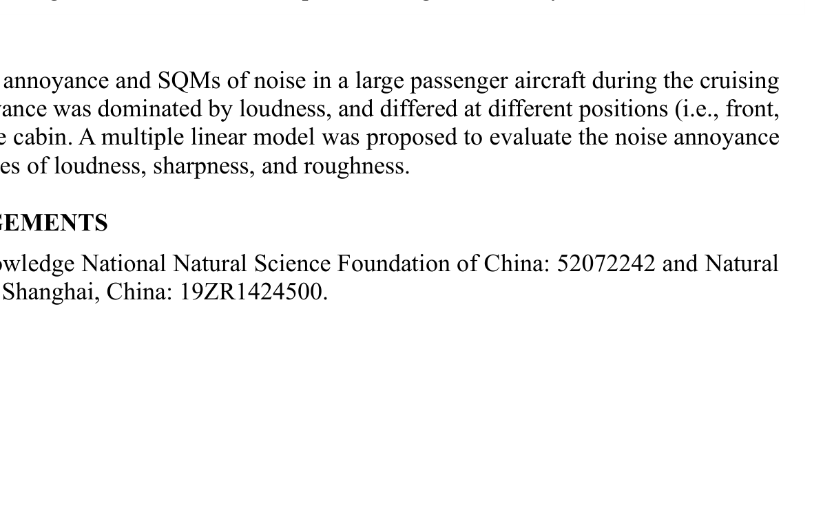 A A A Subjective evaluation of the acoustic annoyance in a large passenger aircraft cabin Bingcong Lv Institute of Vibration Shock and Noise, State Key Laboratory of Mechanical System and Vibration, School of Mechanical Engineering, Shanghai Jiao Tong University 800 Dongchuan Road, Minhang District, Shanghai, China Yu Huang 1 Institute of Vibration Shock and Noise, State Key Laboratory of Mechanical System and Vibration, School of Mechanical Engineering, Shanghai Jiao Tong University 800 Dongchuan Road, Minhang District, Shanghai, China Weikang Jiang Institute of Vibration Shock and Noise, State Key Laboratory of Mechanical System and Vibration, School of Mechanical Engineering, Shanghai Jiao Tong University 800 Dongchuan Road, Minhang District, Shanghai, China ABSTRACT People demand better acoustic comfort for higher travelling quality and security in aircraft. It is necessary to evaluate and predict the subjective annoyance caused by the noise in aircraft cabins. This study investigates the noise-induced annoyance in a large passenger aircraft. We recorded the noise at 21 positions in the aircraft cabin without passengers and selected 21 stimuli during the cruising. Each stimulus has a duration of 5 seconds and a sound pressure level in the range of 72–81dB(A). The psychoacoustic parameters such as loudness, sharpness, roughness, and fluctuation strength were also calculated. Twenty-four subjects evaluated the subjective annoyance of the stimuli by the absolute magnitude estimation method. Results showed the noise annoyance at the middle section of the cabin is significantly higher than that in the front or rear section. The principal component analysis and correlation analysis found that annoyance is mainly affected by loudness, sharpness, and roughness and is dominated by loudness. We proposed a multiple linear regression model between the subjective magnitudes of annoyance and the psychoacoustic parameters to evaluate and predict the noise annoyance in the aircraft cabin well. Keywords: Noise annoyance, Aircraft cabin noise, Psychoacoustic parameters, Sound quality, Noise evaluate 1. INTRODUCTION Acoustic comfort, as the perceived state of well-being and satisfaction with the acoustic conditions in an environment, has attracted more and more attention in the aerospace industry [1-3]. Noise significantly impacts subjective annoyance and increases the awareness of swollen feet, headache, and tiredness, whereas good acoustic comfort diminishes fatigue of the journey, and improves the safety and performance of all occupants [4]. It is essential to investigate, estimate, and design acoustic 1 Corresponding email address: yu_huang@sjtu.edu.cn 1 worm 2022 comfort in large passenger aircraft cabins. There are comprehensive studies on acoustic comfort, including rating noise-induced annoyance with a strong positive correlation with discomfort, unpleasantness, disgust, and disturbance [5, 6]. The sound quality metrics (SQMs), e.g. loudness, sharpness, roughness, and fluctuation strength can accurately represent subjective responses to different sound features [7] and work as psychoacoustic indices for establishing annoyance models, e.g. [7-13]. A few studies have been concerned about comfort related to noise in the aircraft cabin. Quehl has found increasing loudness, roughness, fluctuation strength, and vibration magnitude would reduce comfort in the aircraft cabin [5]. Both noise level and exposure duration would greatly influence the annoyance [4][14]. Pennig et al. have found the comfort sensation was dominated by sound pressure level (SPL) and significantly affected by the frequency characteristics determined by seat positions in the aircraft cabin (front, middle, rear) [15]. The noise annoyance and its influential factors are complex. Studying the noise annoyance and SQMs may provide a better understanding of subjective responses to noise, and better means to establish quantitative comfort models based on SQMs in the aircraft. worm 2022 This article intends to investigate annoyance caused by noise in a large passenger aircraft cabin during its cruise through a subjective evaluation experiment. The primary purpose is to quantify the subjective annoyance at different positions of the aircraft cabin by the SQMs. Two main hypotheses are proposed: (1) the annoyance differs significantly among different positions of the cabin; (2) the annoyance significantly increased with increasing loudness. 2. METHODS 2.1. Apparatus The experiment was conducted in the semi-anechoic chamber. The stimuli were played via headphones (Sennheiser HD600, Germany) driven by a digital to analogue converter (RME ADI-2 DAC, Germany) connected to a laptop (Xiaomi Notebook Pro 15, China). The MATLAB (version R2020a) performed as the playing software. The subjects sat on a chair with the headphones in the chamber. The connection diagram of the experiment set-up and the scene during the experiment are shown in Figure 1. Figure 1: The scene of the set-up when calibrating the stimuli (left), and the connection diagram of the experiment set-up and the scene during the experiment (right). 2 2.2. Stimuli We recorded noise during a flight of a narrow-body large passenger aeroplane with two jet engines. It was 37.6m long, 11.76m high, 35.8m wingspan, 3.70m cabin width and with a passenger capacity of 150 to 186. The positions of all the measuring points are shown in Figure 1. There were 21 measuring points in the front, middle, and rear sections of the aircraft cabin, as indexed as No 2 ~22 in Figure 2. The microphones of No.2 ~ No.12 were located at the seat headrest with a height of about 1.2m; No.13 ~No.18 at the aisle, with a height of about 1.7m from the floor; No.21 ~ No.24 at about 10cm far from the Air conditioning outlet. All stimuli of this experiment were recorded during the cruising flight. During the recording, the seats back were upright, and the pressurization and air conditioning systems were in regular operati