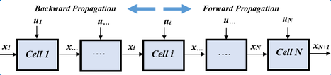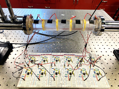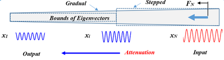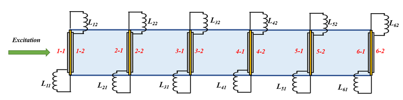 A A A A piezoelectric-nonreciprocal metamaterial with shaped eigenvectors using shunted piezo-networks Han Zhou 1 University of Maryland Mechanical Engineering Department, College Park, MD 20742 Amr Baz 2 University of Maryland Mechanical Engineering Department, College Park, MD 20742 ABSTRACT This paper presents a class of passive nonreciprocal metamaterials (PNMM) which are designed to control the flow of acoustic waves along a one-dimensional periodic acoustic duct. The proposed PNMM consists of a multi-cell array of acoustic cavities which are provided with piezoelectric boundaries. These boundaries are connected to an optimally designed array of shunted inductive networks in order to spatially shape the eigenvectors of the array in such a manner that breaks the reciprocity of the acoustic duct. This approach distinguishes itself from other approaches where non-reciprocities are controlled either actively or passively by various means such as sources of nonlinearities, circulators and gyroscopic/gyrator components, and/or spatio-temporal modulation. A finite element model (FEM) is developed to analyze and predict the dynamic characteristics and behavior of the proposed PNMM for various shunting strategies and distributions of the networks. The predictions of the FEM are validated experimentally using a five-cell array which are provided with electronically synthesized inductances to enable significant tailoring of the eigenvectors of the PNMM. The obtained results indicate significant breaking of the non-reciprocity when the characteristics of the PNMM are determined during forward and backward wave propagations. The theory governing the operation of this proposed approach is introduced and a comprehensive experimental validation effort is presented to demonstrate the basic features and non-reciprocal behavior. Generalization of the presented strategies to two dimensional acoustic systems is a natural extension of the present work. 1. INTRODUCTION Recently, a considerable interest has been focused on the development of various classes of non-reciprocal metamaterials that aim at controlling the spatial distribution of the flow of acoustic energy through these metamaterials. The development of such non-reciprocal behavior is achieved either via simple passive means or more sophisticated active control approaches. Among the 1 zhouhan@umd.edu 2 baz@umd.edu a Shea mar ce 21-24 AUGUST SCOTTISH BENT caso commonly adopted approaches are those utilizing sources of nonlinearity [1-2], gyroscopic components [3-5], spatiotemporal modulation approaches [6-8], as well as other innovative concepts [9-10]. The basic physical concepts, the realization approaches, and the associated characteristics of these non-reciprocal systems are outlined, in a comparative manner, by Fleury et al . [11] and Nassar et al . [12]. In this paper, the goal is to build on the work of Baz [13-14] and Zhou and Baz [15] which has laid the foundation for the development of the novel approach of actively shaping the eigenstructure of the metamaterial in an attempt to spatially altering and controlling the acoustic energy flow along a special class of non-reciprocal metamaterial. With that approach, it has been demonstrated that it is possible to achieve desirable and reversable non-reciprocal patterns in a programmable manner. In the present paper, the emphasis is placed on passively shaping the mode shapes of the metamaterials using arrays of shunted piezo-networks in order to break the reciprocity. The developed “ Passive Non-reciprocal MetaMaterial ” ( PNMM ) is investigated theoretically and experimentally in a comprehensive manner. A finite element model ( FEM ) is developed to analyze and predict the dynamic characteristics and behavior of the proposed PNMM for various shunting strategies and distributions of shunting networks. The predictions of the FEM are validated experimentally using a five-cell array consisting of acoustic cavities provided with piezoelectric boundaries. In the experimental model, the inductances are synthesized electronically to enable significant tailoring of the eigenvectors of the PNMM . This paper is organized in five sections. In section 1, a brief introduction of the passive and active control approaches of non-reciprocity is presented and the concept of the active nonreciprocal metamaterials with shaped eigen-vectors is outlined in Section 2. A finite element model of the metamaterial with shunted inductors is presented in Section 3 along with the theoretical predictions of the behavior of this class of metamaterials. Section 4 presents the experimental validation of the proposed concept of PNMM as a viable means for breaking the reciprocity in acoustic systems. Finally, Section 5 summarizes the conclusions and possible recommendations for future studies. 2. CONCEPT OF METAMATERIAL WITH SHAPED EIGENVECTORS In this section, the concept of the proposed passive nonreciprocal metamaterial ( PNMM ) configuration consisting of an array of periodic system which consist of N cells that are provided with array of shunted inductances as shown in Figure 1. The inductances being the electrical analogs to mechanical masses effectively load the nodes to which they are connected to. Such loading alters the eigenvectors of the acoustic duct and thereby enabling the spatial control of the acoustic energy flow along the metamaterial to achieve any desirable non-reciprocal characteristics. Figure 1: The metamaterial with shaped eigenvectors using shunted piezo-networks In Figure 2a, the metamaterial is arranged in a 1 D periodic configurations. This configuration has, in its reciprocal form, the bounds of the open-loop eigenvectors as displayed in Figure 2b. As these bounds for the original system are constant, then the system exhibits the well-known reciprocal behavior. But, as these bounds are altered and shaped as shown in Figure 2c, the wave propagation along the forward direction can be amplified t