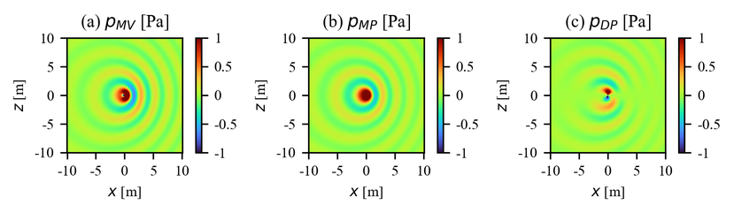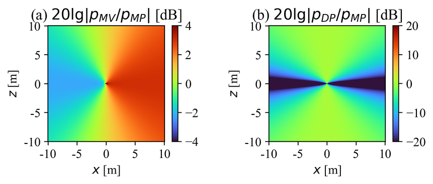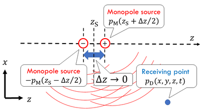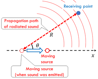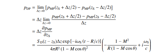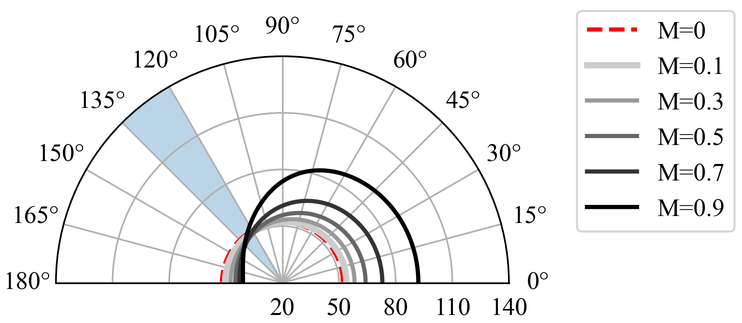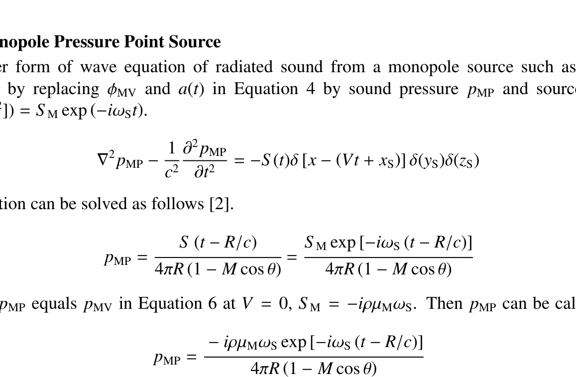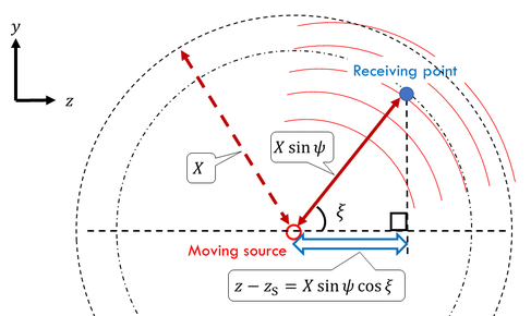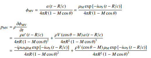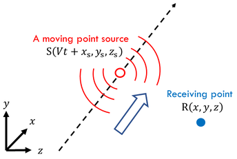A A A Sound source directivity considering source movement Yusuke MAKINO 1 and Yasushi TAKANO 2 Graduate School of Engineering, Kyoto University C1-4, Nishikyo-ku, Kyoto 615-8540, JAPAN ABSTRACT When sound sources move, frequency modulation (Doppler e ff ect) and amplitude modulation occur in radiated sound field. We investigated these e ff ects on directivity of radiated sound represented by three mathematical models: a monopole volume source, a monopole pressure point source and a dipole pressure point source. Assuming that a single tone point source is moving at constant velocity, we calculated sound pressure level from the source. When Mach number increases, radiated noise level increases if the radiation angle, which is the angle between source moving direction and a line from the source to a receiving point, is within a range from 0 to 120 degrees, and decreases if the angle is above 135 degrees. Amplitude modulation of radiated sound from the dipole pressure point source is greater than that from the monopole volume source when Mach number exceeds 0.5. Calculated acoustic power levels of all the three models increase as Mach number increases. The calculated power level variation of the dipole pressure point source is larger than that of the monopole volume source and it is larger than that of the monopole pressure point source. 1. INTRODUCTION There are many studies on predicting about transportation noise caused by automobiles, aircraft, railways, etc. conducted using sound propagation analysis, numerical simulations of radiated sound, for drawing noise map, sound source localization with microphone arrays to identify dominant sound sources, etc. In these studies, it is important to model the propagation of radiated sound from moving sources mathematically and represent sound field by some formulas. Multiple types of mathematical models or formulas representing radiated sound from moving sources have been proposed as volume sources [1] or pressure point sources [2]. Sound pressure can be calculated as a product of time derivative of velocity potential and air density analytically. When a single tone source with source frequency ω is stationary, time derivative of velocity potential ϕ ( t ) = ϕ 0 exp ( − i ω t ) at the time t is ∂ϕ/∂ t = − i ωϕ ( t ). Therefore sound pressure from the stationary source is proportional to velocity potential. However, when a single tone volume source is moving at constant velocity, velocity potential and sound pressure of radiated sound are not proportional because of the source movement [3]. When sound sources move, frequency modulation (Doppler e ff ect) occurs in radiated sound field. Directivity 1 makino.yusuke.77e@st.kyoto-u.ac.jp 2 takano@archi.kyoto-u.ac.jp a slaty. inter.noise 21-24 AUGUST SCOTTISH EVENT CAMPUS O ¥, ? GLASGOW of radiated sound also changes because amplitude modulation occurs when sound source moves. Zhang showed that horizontal directivity of rolling and aerodynamic noise sources of high-speed railway cars is changed significantly by these modulation e ff ects [4]. Makino et al. investigated the di ff erence of radiated sound from a monopole volume source and pressure point source considering source movement [5]. However, the e ff ect of there source movement on directivity on the radiated sound is not clarified. In this paper, we introduced three mathematical models representing radiated sound from a moving dipole pressure point source as well as a moving monopole volume source and a moving monopole pressure point source. Then we calculated sound pressure directivity of radiated sound represented by three kinds of models. We also discussed the e ff ect of directivity of the radiated sound from moving source due to source movement. 2. PRESSURE AND VOLUME SOURCE ON BOUNDARY SURFACE Radiated sound field from acoustical sources on a closed surface F can be expressed as a solution of Kirchho ff -Helmholtz integral equation which the integration over the surface. Velocity potential ϕ ( P ) at a receiving point P outside the surface can be expressed as Equation 1 [6] ϕ ( q ) ∂ G ∂ n q − ∂ϕ ( q ) ∂ n q G dS = ϕ ( P ) (1) F where q is a point on the surface F and n q is the unit vector normal to the surface at q . G is the free-space Green’s function for Helmholtz’ equation, i.e. G ( P , q ) = exp ikr Pq 4 π r Pq (2) where r Pq is distance from q to P . Space derivative ∂ G /∂ n q means Green’s function of a single dipole source. Provided that ϕ ( q ) = ϕ 0 ( q ) exp ( − i ω t ), sound pressure at q is p ( q ) = ρ∂ϕ ( q ) /∂ t = − i ρωϕ ( q ) where ρ is air density. Particle velocity v n ( q ) at q in the direction n q is ∂ϕ ( q ) /∂ n q . In addition, volume velocity a ( q ) of a point volume source at q with radius r q is 4 π r 2 q v n ( q ). Then the Equation 1 can expressed as the following. [ p ( q ) − i ρω ∂ G ∂ n q − a ( q ) 4 π r 2 q G dS = ϕ ( P ) (3) F First term of the integrated function in Equation 3 indicates a dipole pressure source because it is proportional to a product of sound pressure at q and Green’s function of a dipole source. The second term indicates a monopole volume source because it is proportional to a product of volume velocity of a volume source at q and Green’s function of a monopole source. Therefore the integrated function to be integrated means sound field radiated from a monopole source and a dipole source on a closed surface. This indicates that sources on finite surface area can be regarded as distributed monopole volume sources and dipole pressure point sources. 3. RADIATED SOUND FROM A MOVING SOURCE It is supposed that a single tone point source is moving at velocity V [m / s] on a straight track in parallel with the x axis (see Figure 1). t [s] is time, and the position of the point sound source is ( x , y , z ) = ( Vt + x S , y S , z S ). Figure 1: A moving point source on a straight track 3.1. Monopole Volume So