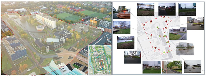 A A A Combining mobile measurements on noise and soundscape evaluation in a University Campus after a renovation plan. Efstathios Margaritis 1 Institution Department of Spatial Planning and Environment, University of Groningen Landleven 1, 9747 AD, Groningen Ferry van Kann 2 Department of Spatial Planning and Environment, University of Groningen Landleven 1, 9747 AD, Groningen ABSTRACT This paper contributes on the popular topic of smartphone-based noise mapping and in general participatory sensing. It has a dual aim as on one hand it provides a methodological framework on the spatio-temporal variability of noise and soundscape and in parallel it investigates the role of green space and water features on soundscape preference with respect to certain activities. The study was organised in Zernike University Campus in Groningen, Netherlands around 13 predefined locations, equipped with seating facilities. A big part of the study area was recently redesigned as part of the Zernike promenade. Students, enrolled in the course of Environment and Engineering, used the ArcGIS 123 Survey and the NoiseCapture mobile applications for soundscape and noise data collection respectively. Statistical analysis and GIS tools were used to investigate the noise and soundscape variability in different time periods from morning to evening. Additionally, the effect of green space and water features on soundscape quality and users’ preference is identified exploring the links with activities related to socializing and relaxing. The contribution of the above-mentioned technologies in participatory planning and urban design interventions is discussed parallel to the educational benefit of these tools in the achievement of the course learning objectives. 1. INTRODUCTION Over the years the topic of soundscape has gained more and more attention in multidisciplinary fields expanding from the traditional area of acoustic ecology [1]. Despite the technological progress with new approaches integrating VR, deep learning or image analysis techniques, it still remains a challenge to integrate the theoretical and analytical tools presented through the soundscape ISO series (12913-a,b,c) in the planning process. This should not undermine the fact that certain progress has been made in the field of participatory planning using mobile apps to assess the acoustic and visual environment (e.g Hush City [2], Noisetube [3]). It is also true that previous studies assessing the soundscape in a University campus did not always consider the landscape composition (e.g presence of green and blue elements), mainly emphasising on the socio-acoustic perspective [4] or a perceptual investigation restricted on the correlation 1 e.margaritis@rug.nl 2 f.m.g.van.kann@rug.nl between physical and psychoacoustic parameters [5]. It is very promising however that recent studies have indeed confirmed that a proper built environemnt in a University Campus can trigger creative encounters in public spaces [6]. Having this in mind, the current research also focuses on the public space of a University Campus. It contributes in the field of participatory sensing and VGI [7] with an aim to describe a robust methodology for noise and soundscape analysis using a smartphone-based data collection protocol [8] and innovative visualization techniques. The applied practices build on the ongoing discussion in three interlinked directions as presented below: a) Diversification of participatory tools and methods that are applicable in soundscape analysis and design. b) Soundscape and new technologies as a pedagogical tool in Higher Education combined with the corresponding learning objectives. c) Soundscape assessment as a dynamic diagnostic tool able to be incorporated in sustainable urban design. 2. METHODS 2.1. Study area and measurement point selection Zernike Campus is located at the north-west part of the city of Groningen and is the country’s fastest growing campus with 198 companies and start-ups in 2018 and the majority of 34,000 students studying in the University of Groningen. The closest highway (N370) runs 150m away from the southern border of the case study area with a dense vegetation in between. The Campus has undergone a big regeneration project (Upgrade Zernikelaan) - finalized in October 2021 - with an aim to make it more accessible and attractive for its users. For this research, the most significant locations are part of the new Zernike Promenade, a wide park along the Duisenberg pond with more than 200 trees, a bike and a footpath forming a connection of almost 1600 meters along the Campus. Coupled with the adjustment communal areas it provides an ideal recreational space with varied functions that is worthwhile to be investigated from an acoustic perspective concerning its efficiency and public acceptance. An overview of the Duisenberg pond is shown in Figure 1. Figure x1: Perspective of the area around Duisenberg pond before and after the renovation project (Zernike promenade). The entire acoustic project run as part of the 3 rd year course of Environment and Engineering, where students are called to familiarize themselves with the physics of sound propagation and aspects related to soundscape theory and assessment. The sample locations for analysis were selected taking into account the Zernike promenade and contextual factors of dominant use and visibility as presented by [9] in the SSID Protocol. The criterion of dominant use corresponds to the available so called “ passive zones ” in the Campus, which aim at promoting activities such as sitting, resting and socializing. Meanwhile, visibility in this study refers both to blue and green spaces in an attempt to account for the visual stimuli. In total 13 measurement locations as shown in Figure 2 (right) were selected with one of them acting more as a reference point valuable mainly in the stage of spatial analysis. Figure 2: Study area (left) and identification of the 13 sampling locat