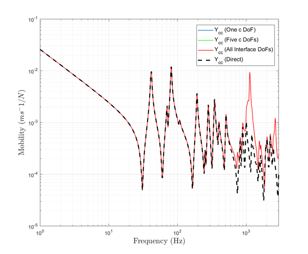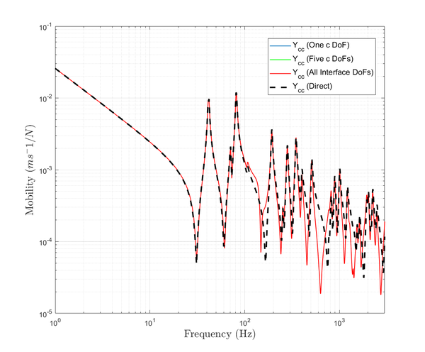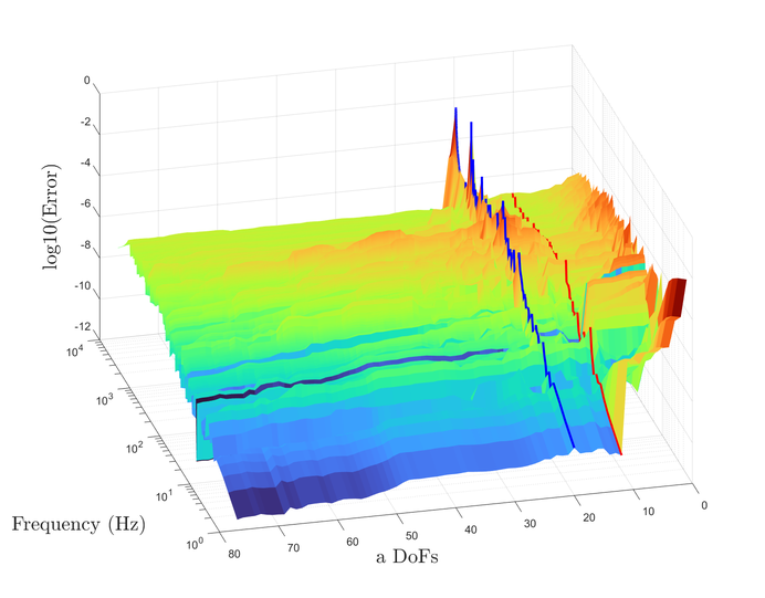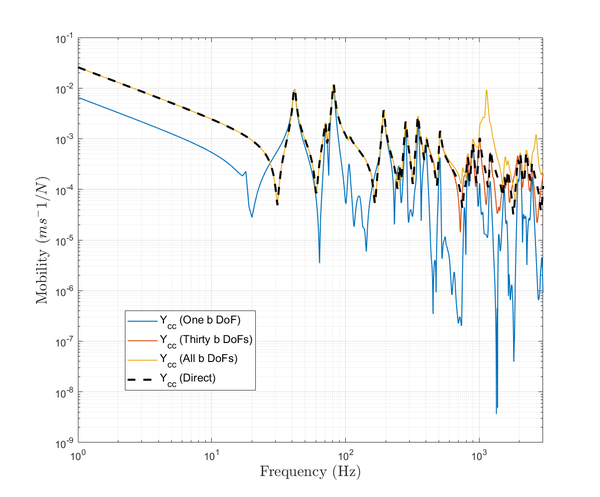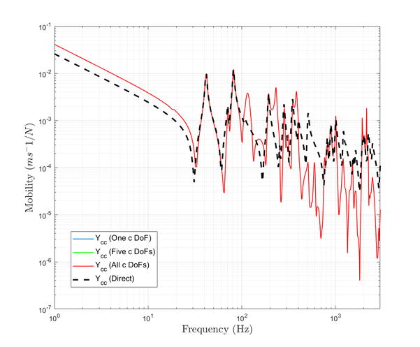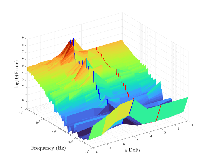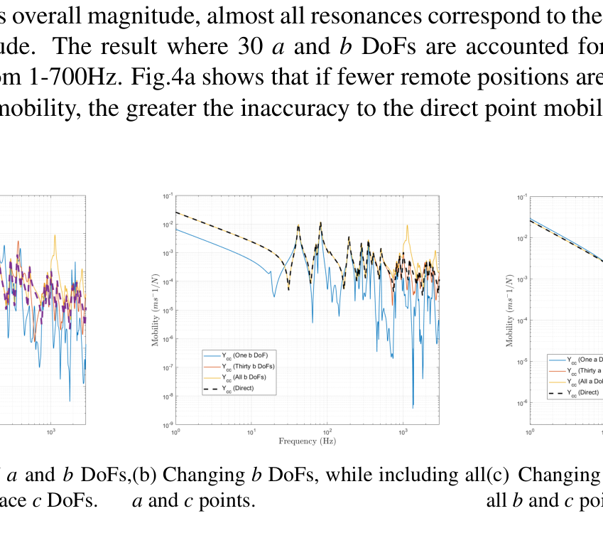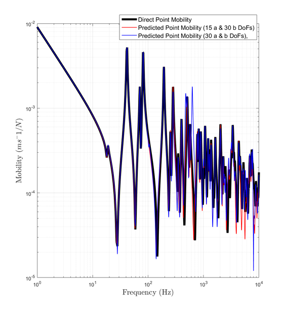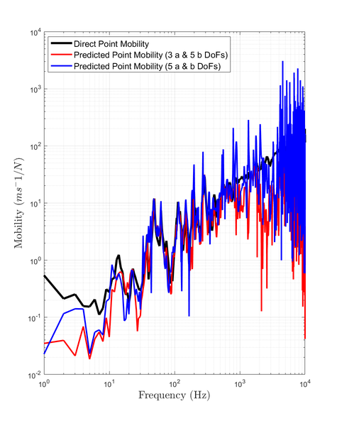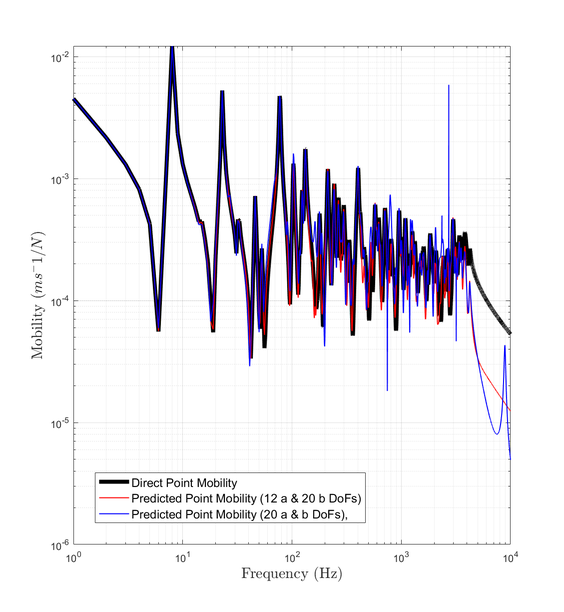 A A A Accurate reconstruction of an interface point mobility matrix using the round-trip method Ramin McGee 1 , Andrew Elliott 2 , Joshua Meggitt 3 University of Salford The Crescent, Salford, M5 4WT John Smith 4 University of Exeter Stocker Road, Exeter, EX4 4PY ABSTRACT The round-trip method enables the indirect determination of point mobilities along interfaces that cannot be easily excited. One embodiment of the method requires excitation at a subset of points either side of the interface, while responses are measured along it. This is typically done by instrumented hammer or shaker. In the present paper, we investigate the sensitivity of the round-trip method with respect to the number of remote measurement positions used, and the geometry of the structure. Numerical and experimental examples are provided which demonstrate that there exists an optimum number of excitation and response positions for the accurate reproduction of point FRFs. 1. INTRODUCTION The primary focus of this paper is to investigate the most optimum round-trip prediction of a point mobility matrix along a discretised interface. This is explored for a plate by altering two factors: the number of measurement degrees-of-freedom (DoFs), and the geometry of the plate. It was stated by [1] that the number of measurement points along an interface a ff ects the accuracy of the interface point mobility prediction. This study will show how this doesn’t appear to be the case, and reveal the sensitivities of the round-trip prediction. In Section 2 the background behind the round-trip method is presented. Section 3 displays the results of the round-trip prediction through the tests mentioned for finite-element (FE) and experimental models. Section 4 will discuss what the results from both models show about the round-trip prediction. Lastly, Section 5 concludes the findings of the investigation. 1 r.c.mcgee@edu.salford.ac.uk 2 a.s.Elliott@salford.ac.uk 3 j.w.r.meggitt1@salford.ac.uk 4 J.Smith4@exeter.ac.uk 1 a slaty. inter.noise 21-24 AUGUST SCOTTISH EVENT CAMPUS O ¥, ? GLASGOW 2. BACKGROUND 2.1. Round-trip method The round-trip method proposed by [2] constructs an M × M FRF matrix at an interface without needing an applied force at each measurement point. This technique replicates point FRFs at the interface by utilising remote measurement locations which are easier to access. In the past there have been successful attempts at reconstructing this matrix by measuring the responses at all M positions and applying one excitation at only of those points. [1] outlines how those previous methods are subject to error and presents a new method based o ff the "cavity equation" by [3]. Namely the method is a generalised version of the equation where the time reversed response at a ’receiver’ sub-structure due to an excitation at a ’source’ sub-structure, is expressed via convolution of impulse responses at both points across a virtual interface. (a) Diagram of an arbitrary structure divided into two substructures, A and B , by an interface c . (b) Diagram specifying the order and path of the measured FRFs in the round-trip method. Figure 1: Round-trip theory in illustrative form for an arbitrary structure made up of two sub-domains due to a discretised interface. Considering an arbitrary structure such as Fig.1a, we have two sub-domains A and B with multiple measurement positions in a given area of each, named as a and b . The interface c is also a multi- point measurement location, dividing the structure into two sub-domains. Firstly lets define an FRF between the sets of points a and b , given as Y ab . This is referred to as the reconstructed transfer mobility, relating a response at a and excitation at b . The reconstructed transfer mobility equation as presented by [1] is a rearrangement of the indirect measurement of mobility at the interface as proposed by [2]. This is referred to as the reconstructed point mobility, and is denoted Y cc as shown in Eq.1. It represents an FRF matrix of all positions at the interface c , due to three measured FRF matrices which are denoted in Eq.1 and represented in Fig.1b. It is clear from this figure why the method is termed ’round-trip’. The point mobility in Eq.1 applies to linear systems (as well as time invariant ones). Eq.2 represents the same equation that satisfies Maxwell-Betti reciprocal theorem. Y cc = Y cb Y − 1 ab Y ac (1) (Equally by reciprocity) Y cc = Y T cc = Y ca Y − 1 ba Y T cb (2) 2 3. RESULTS In this section we present results from finite-element and experimental examples using the round-trip method. In the first subsection the accuracy of the interface point mobility prediction is analysed against the direct measurement by a number of tests for an FE model. These test comprise of: changing the number of remote and interface DoFs, and the aspect ratio of the plate model. In the final subsection, an experimental example is presented. An error plot along with a direct vs. round-trip calculation is presented for comparison to be discussed in Section 4. 3.1. FE Model A finite-element model representing a steel plate is constructed in which the structural responses are calculated via modal summation. Firstly, a regular grid of discretised points are formed on the surface. Similarly to Fig.1a, Fig.2a shows how the FE model’s grid is divided into two remote sub-domains A and B , due to an interface c . (c) 20 a and 40 b points on the regular grid for remote positions. (a) All discretised points of a regular grid. (b) Randomly selected single remote points from regular grid. Figure 2: FE diagram of steel plate, divided into substructures A and B , divided by an interface c . 3.1.1 Accuracy due to the number of DoFs included Fig.3a, Fig.3b, and Fig.3c correspond to the sub-figures in Fig.2 respectively. All results within Fig.3 show the reconstructed point mobility is not sensitive to the number of interface positions used. Only one result is visible because all