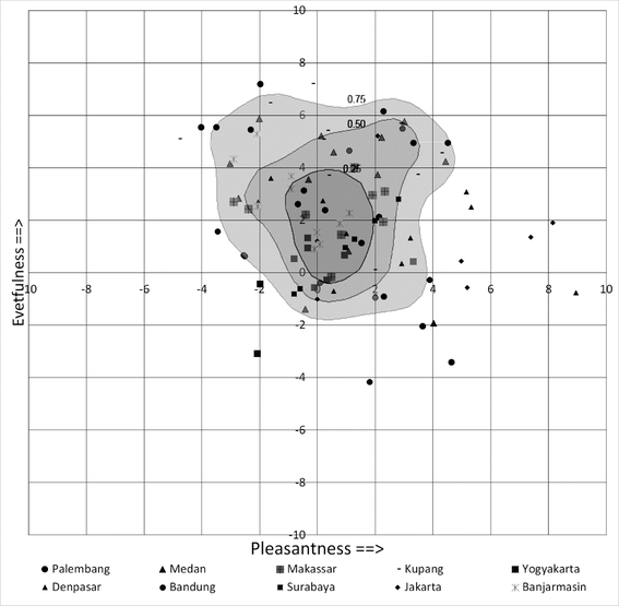 A A A The eventful environment that characterises Indonesia's urban sound- scape Christina E. Mediastika 1 Department of Architecture, Ciputra University Citra Land CBD Boulevard, Surabaya, Indonesia Anugrah S. Sudarsono 2 Kelompok Keahlian Fisika Bangunan, Institut Teknologi Bandung Jalan Ganeca 10 Bandung, Indonesia Sentagi S. Utami 3 Department of Physics Engineering, Universitas Gadjah Mada Jalan Grafika 2 Yogyakarta, Indonesia Isnen Fitri 4 Department of Architecture, Universitas Sumatera Utara Jalan Padang Bulan Medan, Indonesia Rizka Drastiani 5 Department of Architecture, Universitas Sriwijaya Jalan Raya Palembang - Prabumulih Km. 32 Indralaya, Indonesia MI Ririk Winandari 6 Department of Architecture, Universitas Trisakti Jalan Kyai Tapa 1 Grogol Jakarta Barat, Indonesia Akbar Rahman 7 Department of Architecture, Universitas Lambung Mangkurat Jalan A. Yani Km. 34.1 Kota Banjarbaru, Indonesia Asniawaty Kusno 8 Department of Architecture, Hasanudin University Jalan Poros Malino Km. 6 Gowa, Indonesia NW Meidayanti Mustika 9 Department of Architecture, Universitas Warmadewa Jalan Terompong 24 Denpasar, Indonesia Yuliana B. Mberu 10 Department of Architecture, Universitas Katolik Widya Mandira Jalan San Juan 1 Penfui Timur Kupang, Indonesia Ressy J. Yanti 11 Department of Physics Engineering, Universitas Gadjah Mada Jalan Grafika 2 Yogyakarta, Indonesia Zulfi A. Rachman 12 Department of Physics Engineering, Universitas Gadjah Mada Jalan Grafika 2 Yogyakarta, Indonesia 1 emediastika@gmail.com 2 anugrahsabdono@gmail.com 3 sentagi@ugm.ac.id 4 isnenftr@gmail.com 5 rizka.drastiani19@gmail.com 6 mi.ririk@trisakti.ac.id 7 arzhi_teks@ulm.ac.id 8 kusno_asniawaty@yahoo.com 9 meidayanti.mustika@gmail.com 10 liamberu31@gmail.com 11 ressy.jaya.y@mail.ugm.ac.id 12 zulfi.arachman@gmail.com worm 2022 ABSTRACT Noise control is still one method to improve the urban acoustic environment in many countries, in- cluding Indonesia. The noise control tries to reduce the sound level in a particular space to increase comfort. In other words, the acoustic environment is designed to be comfortable and uneventful. Pre- vious studies have shown that public spaces in Indonesian cities have a unique sound than cities in developed countries. Here, further studies to investigate whether the soundscapes of these cities are also unique are reported. Soundscape surveys added with sound pressure level (SPL) measurement and audio recording in 28 public places in ten major Indonesian cities indicate that a noise control approach to provide acoustic comfort and uneventful public spaces may not suit Indonesia. The anal- ysis shows that, in general, the soundscape is perceived as an eventful environment, which is com- patible with the SPL and audio recording. Furthermore, the results were significant among the ten cities. This study shows that soundscape improvement should focus on developing an environment that is perceived as eventful and comfortable at the same time. Therefore, a different strategy is needed to improve the acoustic environment in Indonesia. 1. INTRODUCTION Previous studies related to the noise of cities in Indonesia have shown that Indonesian cities are con- sidered noisy [1]. This is because city sounds have sound pressure levels (SPL) above the Indonesian standard and are dominated by human activities, traffic, construction, and industry [2]. However, the high noise level is not considered negative by Indonesians, which is quite surprising because noise is considered detrimental in many countries, so it needs improvement [3,4,5,6]. Furthermore, noisy pub- lic places are acceptable because Indonesians are mostly expecting communal activities while visiting public places [2]. In contrast, people with different cultures, such as in developed countries, usually carry out individual activities every time they visit public places [7]. Cities in Indonesia, represented by public places such as parks, squares, markets, memorial sites, and waterfronts, have unique sounds compared to cities in developed countries [2]. They are domi- nated by sounds from human activities, including people talking, children playing, music, etc. All these sounds indicate that Indonesians mostly interact with other people when in public, and the sounds they enjoy are the sounds they make based on their activities. This study focuses on identify- ing the concept of improving the acoustics of public spaces in Indonesia using soundscapes. This approach was selected because soundscape tries to analyse human interaction with the acoustic envi- ronment in a more holistic approach than noise measurement based on SPL [8]. 2. METHODS 2.1. Selection of Public Places Indonesia is a large country that stretches from a city called Sabang on the westernmost side to Me- rauke on the easternmost side. There are 98 cities in Indonesia [9], but only a few are categorised as large or metropolitan cities with high density, most of which are located on the island of Java. Based on the preliminary study to map the sounds of cities in Indonesia, ten Indonesian cities were selected for this research. The ten cities represent different city sizes, locations (entirely land or seaside), and cultures. They are Medan, Palembang, Jakarta, Bandung, Yogyakarta, Surabaya, Banjarmasin, Ma- kassar, Denpasar, and Kupang. All of them are provincial capitals covering the western to eastern parts of Indonesia – namely North Sumatra, South Sumatra, Special Capital Region, West Java, Spe- cial Region of Yogyakarta, East Java, South Kalimantan, South Sulawesi, Bali, and East Nusa worm 2022 Tenggara respectively. Twenty-eight public places in ten cities were surveyed. Each city is repre- sented by three public places, except for Jakarta and Surabaya, only two. Twenty-eight public places vary from parks to markets and shopping malls. As such, they comprehensively represent the diverse preferences of public places to be visited by Indonesians of various cultures and economic le