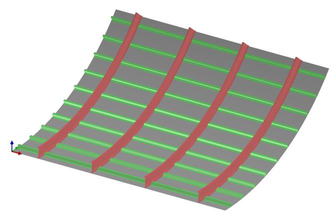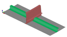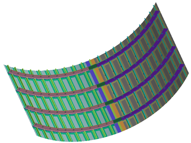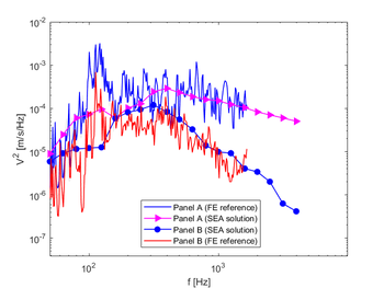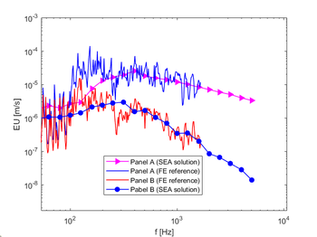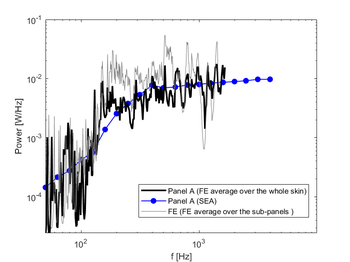 A A A On homogenized ribbed-panel model for SEA analysis Abderrazak Mejdi 1 ESI North America 12555 High Bluff Drive, Suite 160 San Diego CA 92130 Luca Alimonti 2 ESI North America 12555 High Bluff Drive, Suite 160 San Diego CA 92130 Bryce Gardner 3 ESI North America 12555 High Bluff Drive, Suite 160 San Diego CA 92130 ABSTRACT This paper presents an investigation into a recent model of homogenized rib-stiffened panels. An equivalent panel model is developed from the skin and the stiffeners of the panel. In this case a space- harmonic-based approach is used and first-order shear deformation theory is employed to account for the wavefield’s in-plane/out-of-plane coupling effect in the skin. The panel’s stiffeners interact with the skin through internal forces and moments at the connections. A periodic FE mesh is then used to compute the wave dynamics and the results are used to develop the required terms to solve for vibro-acoustic results in Statistical Energy Analysis (SEA). This process is used to predict the vibro-acoustic response of an aircraft structure. The SEA results are compared with detailed FE models of the rib-stiffened aircraft structure. 1. INTRODUCTION Rib-stiffened panels are extensively used in aerospace constructions. In the past decade several strategies have been developed to analyze their vibro-acoustic behavior. In general, conventional methods such as the Finite Element/Boundary Element Method (FEM-BEM) are used for vibro- acoustic analysis of these structures. Although accurate, these methods are computationally expen- sive, and their computational load increases to challenging levels with increasing frequency or size of the modelled system due to the large number of degrees of freedom required to model the structural deformation. There are two techniques that can be employed as an alternative to FEM-BEM tech- 1 Abderrazak.mejdi@esi-group.com 2 Luca.alimonti@esi-group.com 3 Bryce.gardner@esi-group.com worm 2022 niques: the Rayleigh-Ritz modal-based approach [1,2] for finite panels and the space-harmonic ap- proach for periodic infinite panels [3-5]. The modal approach assumes the structure to be rectangular and simply supported. Its transverse displacement can then be described with a modal expansion series which may become inefficient as the size of the series increase with increased structure size or decreased thickness. An efficient model where the modal approach is employed but the key vibro- acoustics properties of the ribbed panel are predicted in a Statistical Energy Analysis (SEA) context is presented in reference [6]. It has been shown that the wavenumber domain is dividable into four zones. The corresponding equivalent mass and stiffness can be approximated at each wavenumber domain. This technique has been extended in the work presented in reference [2] to handle ribbed plates with composite materials. On the other hand, the space-harmonic approach assumes that the displacement field of the panel consists of space-harmonics series when the partition is periodic and infinite. These series are set to consist of enough terms to ensure the convergence. Unfortunately, that number depends upon the nature of the structure and is, in general, relatively high [3,4]. Therefore, the size of the systems of equations associated with these models is also high. Moreover, most of the published studies on rib-stiffened panels invoke the classical thin-panel theory to describe the dis- placement field of the skin. The former is based on the Kirchhoff-Love kinematic hypothesis which neglects the transverse shear strain. Moreover, the in-plane displacement of the panel and its interac- tion with the stiffeners is often ignored. This may be acceptable for symmetric, thin stiffened panels but when the panel is asymmetric and the stiffeners are eccentric about the panel’s middle-plane, it is not well known to what extent the coupling of its in-plane motion with its bending out-of-plane motion and with the in-plane displacements of the stiffeners is negligible. To overcome this limita- tion, first-order shear deformation theory has been used [5]. In this paper, a wave-based approach is employed to develop an equivalent homogeneous model for periodic rib-stiffened panels. Based on the work presented in [5], the shear deformation theory is used to describe the displacement field of the skin and its interaction with the stiffeners is represented by their reactions at the connections. The distinct behavior of the panel in terms of wavenumbers is described based on the periodicity characteristic of the structure [2,6]. The equivalent properties of the homogenized unit cell are determined using the wave dispersion of the structure. A general peri- odic-based finite element (FE) approach is employed for modeling wave propagation in SEA subsys- tems as presented in Ref. [8,10]. The equivalent properties of the homogenized structure are used to define an FE model of a periodic unit cell. The solution of the proposed strategy is successfully com- pared to detailed FE representations of an aircraft fuselage. It is found that the homogenized model provides a relevant representation of the behavior of rib-stiffened panels with either isotropic or lam- inate composite skin. 2. THEORY In the following, a homogenized rib-stiffened panel model is described. This is used in a general periodic FE method for modeling wave propagation in ribbed panels. This approach is then applied for a generalized SEA wave-based approach framework as described in [8,10] 2.2. Rib-stiffened panel model Consider a rib-stiffened panel with laminate composite skin. The plate is orthogonally reinforced with stiffeners along the 𝑥 - and 𝑦 -direction of the skin’s local coordinate system (see Figure 1). The panel is assumed to be infinite. The stiffeners are modeled as beams and are periodically distributed on the panel’s surface. The 𝑥 -wise and 𝑦 -wise spacing between the stiffeners are 𝑆 