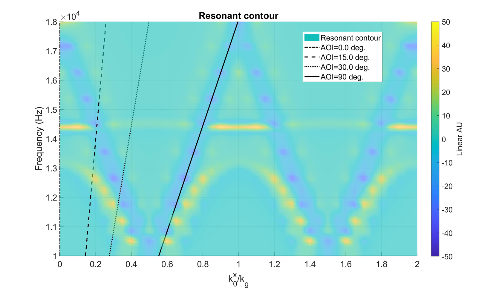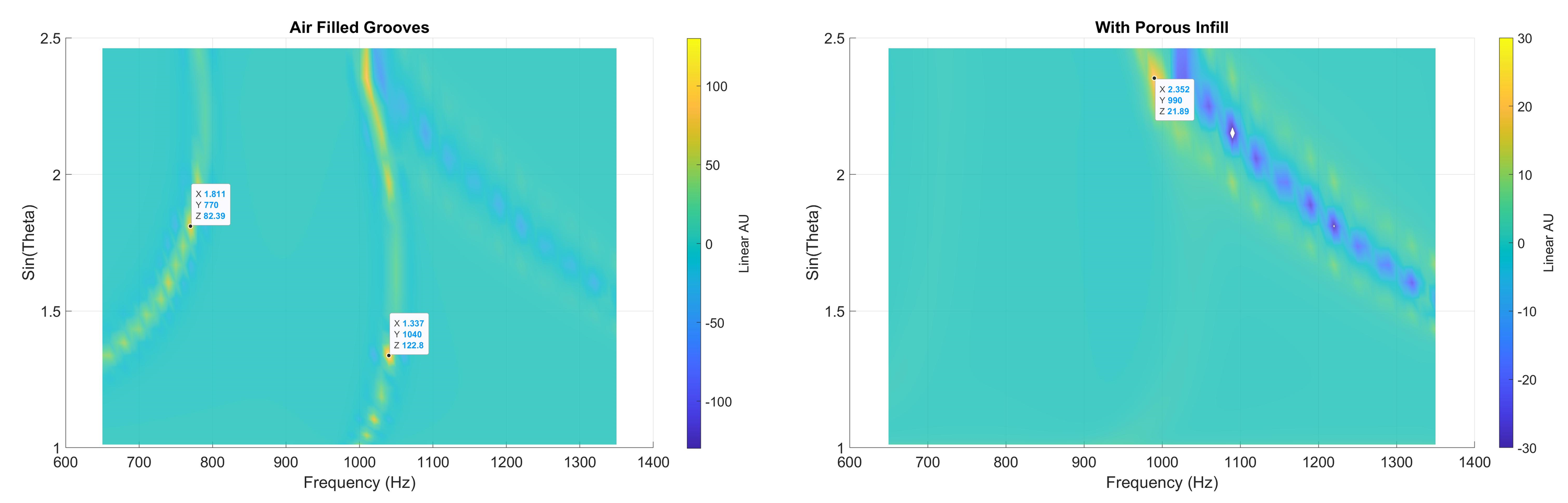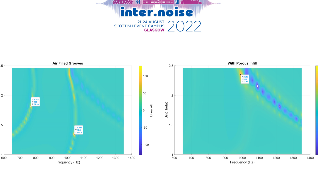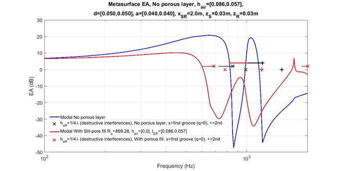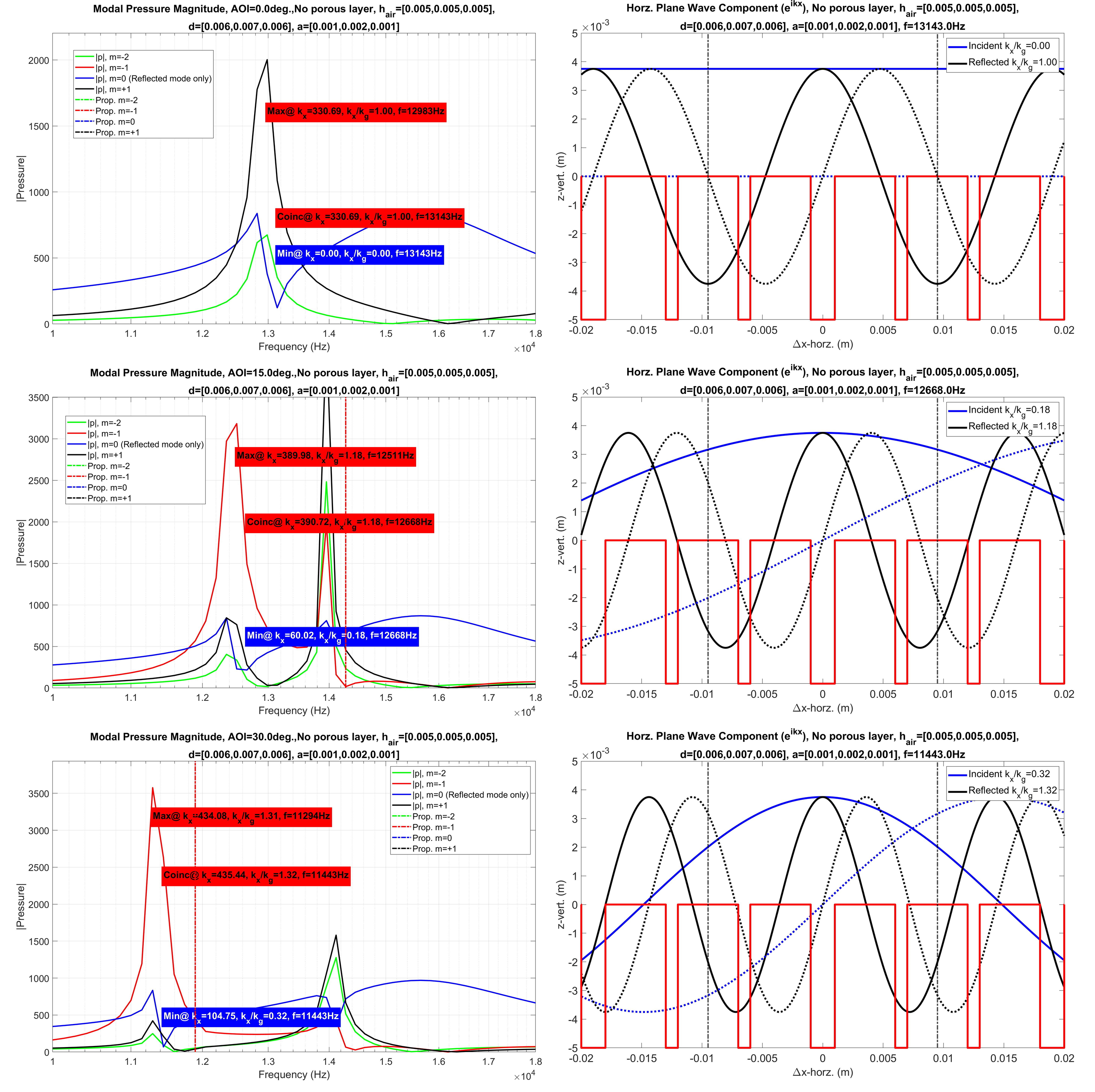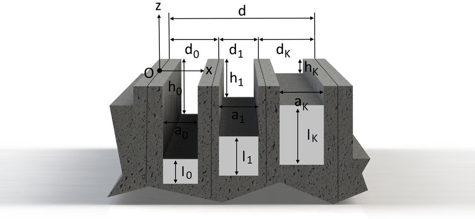 A A A AUDIO-FREQUENCY SURFACE WAVES OVER MULTIPLE WIDTH AND DEPTH GROOVES by Steve Mellish ‡ and Shahram Taherzadeh and Keith Attenborough ( Faculty of STEM, The Open University, UK ) ABSTRACT Previous studies of airborne surface waves have been carried out at audio-frequencies over periodically rough surfaces formed by lighting lattices and bricks and at ultrasonic frequencies over mm scale compound gratings involving grooves of the same depth but different widths. In this paper, a modal model, which has been found to give comparable predictions to BEM while being much faster to run is used, together with BEM, to investigate audio-frequency sound propagation over grooves of varying widths and depths in the order of cm . Predictions of excess attenuation spectra, pressure contours and zeroes in the effective reflection coefficient over grooves with multiple widths and depths are used to indicate the nature of the surface waves which involve overlapping quarter wavelength resonances. Predictions are extended to multiple depth grooved surfaces without and with porous infills. 1. Introduction Tolstoy [1] suggested a clear distinction between an evanescent surface mode and a true surface wave. The former exists only due to the geometric and boundary conditions imposed at a surface under excitation by an incident source and will not necessarily self sustain once the incident source is removed. An example of this is the evanescent field at the edge of an optical element under total internal reflection. A true surface wave, although excited initially by an incident disturbance, may persist in the absence of an incident field due to resonant properties of the surface itself. This work suggests the extent to which any periodic disturbance near to the surface † may be sustained, is a function of the resonant behaviour of the surface, much akin to the resonant behaviour of tuned circuits in electronics, so the distinction between a surface mode and surface wave is blurred and a matter of degree. In this paper we shall consider surface waves from a theoretical perspective using a modal model for rectangular grooves. Much attention has been given to rectangular gratings due to the ease with which they may be modelled, realised and their readiness to support surface waves. 2. A modal model for predicting the resonance contour of multiple grooved surfaces A modal model was derived by Hessel et al. [2] to investigate blazing of simple rectangularly grooved gratings in the electromagnetic domain and subsequently applied to acoustics with the purpose of investigating surface waves by Kelders and Allard et al. [3, 4]. The authors recently extended the method to predict acoustic point-to-point propagation [5] and then expanded the system of equations to include multiple grooved structures of the form in Figure 1, with or without a porous layer at the base of each groove [6]. The focus of our current research is to continue the work of Kelders et al. using the modal model to predict surface wave (SW) behaviour, but with the application of ‡ Corresponding author: steve@melectronics.co.uk † Which may in fact be propagating or evanescent, just that energy in the former is radiated whereas the latter is constrained to the surface 21-24 AUGUST SCOTTISH EVENT CAMPUS , O? ? GLASGOW Figure 1: Multiple grooved periodic surface with porous layers. our extensions to the model to admit more complex structures. The advances in computing power since the pioneering works also allow more involved simulations affording greater insight into the underlying physical processes involved. Given the vertical axis is z , infinite spatial periodicity in the horizontal x -axis and invariance in y is assumed as is an exp( − iωt ) time convention. A homogeneous plane wave is indcident upon the surface of the grating with angle of incidence (AOI) θ and propagation constant k , propagating in the x - z plane within an ideal inviscid medium. The modal model kernel is briefly described herein with full derivations to be found in [2–6]. The resulting 2d problem may be considered as a domain of two separate half spaces, a free field upper space for z > 0 and the lower groove space where z < 0 . Continuity of pressure p and normal particle velocity v z form the boundary conditions at the z = 0 surface. The acoustic field for the upper and lower space reduce respectively to infinite sets of m and n discrete modes, with complex amplitudes ˆ V m (upper space quantities are denoted by hat) and V n . The ˆ V m and V n sets are mutually related by an inner product relationship where ˆ V 0 = ˆ V i 0 + ˆ V r 0 . The incident wave amplitude ˆ V i 0 is given as initial conditions of the problem along with the geometry of the grating. The modal impedances, 21-24 AUGUST SCOTTISH EVENT CAMPUS , O? ? GLASGOW ˆ Z m = Z c k ˆ k z m , ˆ Z i m = − ˆ Z r m = − ˆ Z 0 (1) relate p to v z for each free-space mode m , where Z c is the characteristic impedance of the medium and the z -axis propagation constant ˆ k z m for each m is, s 2 (2) k 2 − k sin θ + 2 mπ ˆ k z m = d and the x -axis projected propagation constant, ˆ k x m , is given by the residual, ˆ k x m = q k 2 − ˆ k z m 2 . (3) The propagation geometry of each m is defined by θ and the grating pitch d and has the mode function ˆ e m upon z = 0 , ˆ e m = d − 0 . 5 exp i k sin θ + 2 mπ x . (4) d Considering each groove to behave as an acoustically hard waveguide [7], the corresponding mode function e q,n across the aperture of each groove becomes, s s nπ " #! j 1 a q , e q,n> 0 = δ e 2 a q cos x − X e q, 0 = δ e a q 2 j ∈ Z + (5) j 1 x ⩾ P 2 1 x ⩽ P j ⩽ q d j − d q − a q δ e = 2 0 else where index q denotes the q ’th groove within each period from q = 0 to q = K where K + 1 is the number of grooves per grating period d . Truncating the infinite m and n sets and equating them at z = 0 results in the following system of equations, which may be 