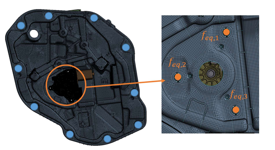 A A A Application of the Transfer Path Analysis to Vehicle Doors Thomas Michaelis 1 Technical University of Munich, Germany; TUM School of Engineering and Design, Department of Engineering Physics and Computation Boltzmannstraße 15, 85748 Garching b. München University of Applied Sciences Würzburg-Schweinfurt Ignaz-Schoen-Str. 11, 97421 Schweinfurt Steffen Marburg 2 Technical University of Munich, Germany; TUM School of Engineering and Design, Department of Engineering Physics and Computation Boltzmannstraße 15, 85748 Garching b. München Stefanie Retka 3 University of Applied Sciences Würzburg-Schweinfurt Ignaz-Schoen-Str. 11, 97421 Schweinfurt ABSTRACT Transfer path analysis (TPA) is a proven method for identifying critical structure-borne and airborne sound paths. The basic idea here is to divide the overall system into an exciting active component (source) and a passive component, e.g., the mechanical structure to be investigated, with their respective measurement points. By separating them, two independent systems are created, whereby on the one hand the excitation behavior can be characterized and on the other hand the transmission behavior can be assessed. Finally, it is checked whether both systems harmonize with each other or whether changes to the source or structure are necessary. The advantage here is the simple description as a black box without complex modeling. In this contribution, this systematic is applied to window regulator systems found in vehicle doors. The focus is on a hybrid approach between experimental and numerical transfer path analysis. For this purpose, the basic workflow of suitable TPA methods is discussed. This includes evaluation of the test rig, the calculation of the contact forces and the numerical analysis of the transfer paths. 1. INTRODUCTION Noise, Vibration, and Harshness (NVH) is an essential topic in modern vehicle development. Due to more and more electrification of the drive units and lightweight designs, it is easier to hear and feel acoustic issues for the customer. Classic transfer path analysis methods provide a tool to identify critical paths in a late stage of development [1]. However, changes of the design lead to high effort and costs. Component-based TPA attempts to decouple the source-receiver system, e.g., to perform experimental tests on separate test rigs. This allows changing the single components of 1 thomas.michaelis@fhws.de 2 steffen.marburg@tum.de 3 stefanie.retka@fhws.de Jai. inter noise 21-24 AUGUST SCOTTISH EVENT CAMPUS ? O ? . GLASGOW an assembly, e.g., window regulator motors in vehicle doors, to achieve an optimized system. The process of characterizing has already found its way into international standards [2]. System suppliers can use this method in an early development phase as a prediction tool. For example, different motors from tier three suppliers can be characterized and (virtually) coupled with their own receiving structures. In this case, a set of frequency response functions (FRF) is required. They can be achieved either by experimental testing or by calculating numerical models. Generally, few physical prototypes are available in an early phase, limiting the optimization process. In numerical models, design parameters can be changed easily but need high effort to be modeled correctly. This contribution attempts to establish the connection between experimental and numerical models of vehicle door components, e.g., lightweight carriers inside the door and window regular systems. The connection aims to set up virtual acoustic prototypes, which can predict the acoustic characteristics of the assembled system. For this purpose, we will show and discuss the workflow based on the ISO standard. Afterwards, we present an evaluation of the existing test rig to find whether the blocked force or in situ method can be applied. The last topic includes the description of the numerical model. 2. THEORY In order to characterize the active component of a source-receiver system (Figure 1) a variety of concepts based on the component TPA are shown in [1]. All those methods are trying to follow the equivalent source concept to characterize the internal excitation 𝒇 𝒔 . The aim is to find a set of equivalent forces 𝒇 𝒆𝒒 in the interface 𝒖 𝒊 such that all responses 𝒖 𝒓 of the entire assembly can be determined. Subsequently, detailed information on the blocked force and in situ TPA will be shown. Figure 1: Source-Receiver System. 2.1. Blocked Force TPA To achieve the blocked forces, the source is coupled to a rigidly fixed support (Figure 2). The internal excitation 𝒇 𝒔 is portrayed in the reaction forces such that the displacement 𝒖 𝒊 on the active component is zero [1]. The equivalent forces 𝒇 𝒆𝒒 can be found by equation (1) with 𝒀 𝒔,𝒊 (FRF internal source to the interface), 𝒀 𝒊,𝒊 (FRF of the interface of the active component), and the internal excitation 𝒇 𝒔 ି𝟏 𝒀 𝒔,𝒊 𝒇 𝒔 . (1) 𝒇 𝒆𝒒 = 𝒀 𝒊,𝒊 Theoretically, this is an easy way to find the equivalent forces, although it is hard in practice. The methods impose the boundary to be infinitely stiff. Furthermore, the direct measurement of the blocked force needs a force sensor, which is expensive and unable to measure rotational degrees of freedom. Figure 2: Schematic overview of the blocked force TPA. 2.2. In situ TPA The in situ TPA (proposed in [3-5]) is a method to obtain the equivalent forces regardless of the receiver system. The forces are achieved by measuring kinematic quantities while a connected source operates. Theoretically, the forces can be transferred to the original receiver system. Figure 3: Schematic overview of the in situ TPA. To calculate the forces in the interface 𝑓 , indicator points 𝑢 ௗ are placed near the interface. Those points will measure the kinematic quantities 𝒖 𝒊𝒏𝒅 while the source is operating. Trough inverse calculati