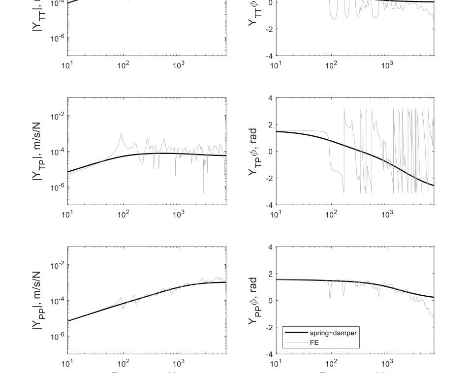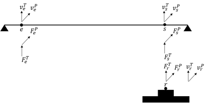 A A A Piano string vibration modelling using coupled mobilities and a state- space approach Pablo Miranda Valiente 1 , Giacomo Squicciarini 2 , David J. Thompson 3 Institute of Sound and Vibration Research, University of Southampton University Rd, Highfield, Southampton SO17 1BJ ABSTRACT The two transverse motions of the string in planes parallel and perpendicular to the soundboard are believed to contribute to some of the characteristic effects of piano tones. In this work we aim to model the coupling between a single string and soundboard, considering the two transverse motions. A stiff string model is coupled to the bridge of the soundboard. Modelling approaches are presented in both frequency and time domain, using mobility coupling and state-space equations, respectively. For time domain modelling, the soundboard mobilities are approximated by lumped elements, springs and dampers in this case. In the frequency domain model, the mobilities of the elongated string, detached from the bridge, corresponding to the transverse response to a transverse force, are the same in both directions and the coupling between them is neglected, while the soundboard mobilities are represented by a 2 2 matrix. The state-space model has the benefit of allowing inclusion of the non-linear hammer excitation. Although the frequency domain model can represent the linear characteristics of the coupling and give an insight into the importance of the cross-terms of the coupled mobility, it is the time domain model that is able to represent typical features of the interaction. 1. INTRODUCTION In piano acoustics the vibration of the strings is initiated by the hammer strike and plays an important role in determining the sound radiated from the soundboard. The two ends of the string are connected to the cast-iron frame of the piano by means of connection pins. These are the agraffe, near the action, and the hitch pin, at the opposite end [1]. At a distance, defined as the speaking length, the string is pressed against the bridge of the soundboard. This connection is the main path of vibration transmission from the string to the soundboard and can also be responsible for coupling the two transverse directions of string vibration [2] . Once the hammer hits the string at the striking point, the two remain in contact for a few milliseconds. The hammer force creates pulses that travels along the string and are reflected at the ends. After the hammer loses contact with the string, this is left free to vibrate and decay. Alongside other phenomena, decay rates in piano tones contribute to forming its 1 pmmv1g14@soton.ac.uk 2 G.Squicciarini@soton.ac.uk 3 djt@isvr.soton.ac.uk distinguishing sound and have been extensively studied in the past decades. The decay of piano tones and how this is related to the connection with the soundboard has been one of the areas of research in piano acoustics. Martin [3] recorded decay rates for different pianos, discussing the effect of the soundboard and showing that each piano tone has different decay rates along the piano range. The phenomena was later explained by Weinrich [2], who showed that double decay is caused by the coupling between strings of the same tone at the bridge and by double polarisation. This is the presence of two transverse vibrations on the string, one perpendicular to the soundboard, and the other parallel to it. The author showed experimentally that the vibration in the vertical direction decays faster because of the better impedance match between the string and the soundboard in this direction. According to the double- polarisation explanation, after the initial sound decays the remaining and more sustained section of the envelope is caused by the vibration in the plane parallel to the soundboard. Cheng et al. [4] have focused on modelling the specific characteristics of string’s vibration decay and its fitting to linear and non-linear models, showing that non-linear models may fit better to measured data and that the dynamics of the piano touch does not influence the decay rates. The effects of non-linearities in double polarisation, causing the pairs of modes in both directions to have different natural frequencies, have been addressed by Tan et al. [5], proving that whirling motion of the string occurs when accounting for these differences. More recently, Woodhouse [6] provided a criterion for double decay in different string instruments, showing that for double decay to exist, the loss factor given by the coupling to the bridge/soundboard needs to be higher than the loss factor of the medium in which the string vibrates. This study presents frequency and time domain models for string vibration including coupling to the soundboard. Two transverse motions of a single string are considered which are normal and parallel to the soundboard. These are coupled to each other at the bridge either by means of a mobility matrix, in the frequency domain, or by an equivalent lumped parameter model for time domain simulations. The string dynamics are represented with a stiff-string model [7] while the dynamical properties of the soundboard at the connection point are obtained by means of Finite Elements (FE). 2. STRING AND SOUNDBOARD The string-soundboard system is shown in Figure 1 together with the conventions adopted for velocities, 𝑣 , and forces, 𝐹 . For the different variables defined in Figure 1, the subscript 𝑒 indicates the excitation point where the hammer interacts with the string, the subscript 𝑠 denotes the string at the connection point with the bridge while 𝑟 is the connection point on the bridge side. The superscripts 𝑇 and 𝑃 indicates the two vibration directions transverse to the string: normal to the soundboard ( 𝑇) and parallel to it ( 𝑃 ). Figure 1: String and soundboard system. ee 2.1 String In pianos, it is common to have more than one string for the same note, particularly in the mid-high frequency range. In this paper on