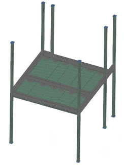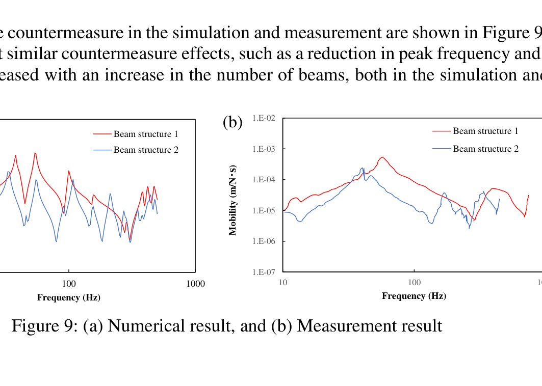 A A A Numerical prediction method for vibration characteristics of steel- framed ALC floor structure Haruki Mizunuma 1 , Takumi Asakura 1 , Yasuhiko Ishiwatari 2 , Takayuki Shiraishi 2 , Fumiaki Satoh 3 1 Tokyo University of Science 2641 Yamazaki, Noda-shi, Chiba, 278-0022, Japan 2 CEL corporation 3-7-1 Kyobashi, Chuo-ku, Tokyo, 104-0031, Japan 3 Chiba Institute of Technology 2-17-1 Tsudanuma, Narashino-shi, Chiba, 275-0016, Japan ABSTRACT The prediction of floor vibration is of great importance from the viewpoint of accurate prediction of sound environment in the room. In this paper, applicability of the finite element analysis to the vibra- tion simulation of autoclaved lightweight aerated concrete (ALC) floor structure on a steel-framed structure was verified. The results of a numerical case study has confirmed that the numerical cou- pling scheme of the ALC floor panels and the steel-framed structure had a significant effect on the simulated vibration characteristics of the ALC floor panels. Then, validity of the proposed method was finally confirmed by comparison with the measurement results. 1. INTRODUCTION In recent years, there has been growing interest in sonic environmental performance in building against a background of increased of staying time. Various studies have been reported on prediction methods for heavy weight floor impact sound insulation performance for reinforced concrete build- ings, but there are limited studies for steel-framed buildings. Examples of study on prediction meth- ods for heavy weight floor impact sound insulation performance of steel-framed buildings so far re- ported include the application of a finite element vibration analysis method for reinforced concrete buildings to steel-framed buildings [1], and the application of a coupled displacement in-plane and out-plane for deck plate slabs [2], but further studies are needed to improve the accuracy of the sim- ulation and expand the range of application. In this paper, measurements were carried out on the vibration of ALC floor panels in a steel-framed building, and the modelling method of the finite element analysis was investigated for steel-framed building with ALC floor panels. Then, the proposed method was finally verified by comparison with the measurement results and the numerical results. 2. MEASUREMENT For a span of the target building of measurement, ALC distribution setup showing measurement points and beam plan are shown in Figure 1. The target building of measurements is a three-story steel-framed building. The target floor of the measurements is a span of the second floor. The con- struction of the building was completed only frame when the measurements were carried. The floors consisted of ALC floor panels that have a thickness of 100 mm. worm 2022 (b) (a) E’ 5 1365 1365 455 455 1365 1820 E’ 0 worm 2022 D 5 D 0 Column Pillar Unit : mm 3185 2730 455 Unit : mm Figure 1: (a) ALC distribution setup showing measurement points, and (b) Beam plan 3. CASE STUDIES Preparatory to generate a numerical model for a comparison with measurement results, some case studies were carried out. 3.1. Effect of the Cross-sectional Shape of Beams In order to predict floor vibration in steel-framed buildings, the treatment of H-shaped beams, which are unique to steel construction, is an important point of the simulation. Therefore, the effect of beam cross-sectional shape was carried out by comparing the numerical results obtained from the two types of numerical models differing only in cross-sectional shape. The software used for simulations in this paper was SIMCENTER 3D from Siemense and direct frequency response analysis was carried out using FEM. The dimensions of the beams used in the case study are shown in Table 1. Table 1: Beam dimensions The numerical results are shown in Figure 2. The figure confirmed that the vibration characteristics of the ALC floor panels are significantly affected by the cross-sectional shape of the beams. Even when the second moment of area were equal, the vibration characteristics differed significantly when there were differences in the cross-sectional shape of beam. Therefore, it was confirmed that to sim- ulate the cross-sectional shape of the beam accurately is important in order to accurately predict the floor vibration of the steel-framed building. 1.E+01 Beam 1 worm 2022 Beam 2 1.E+00 Accelerance (m/N s 2 ) 1.E-01 1.E-02 1.E-03 1.E-04 10 100 1000 Frequency (Hz) Figure 2: Effect of cross-sectional shape of beam 3.2. Effect of Constraint Conditions of ALC floor panels. The target building of measurement was constructed by dry construction method and ALC floor panels were fixed to beams at two points by mounting parts as shown in figure 3 (b). In order to accurately predict the vibration characteristics of ALC floor panels, it is considered to be important to accurately simulate the restraint conditions of ALC floor panels. Therefore, the effect of the re- straint conditions of ALC floor panels on the vibration characteristics was carried out. A numerical model (a), the ALC floor panels were directly fixed to the beams. In contrast, the other numerical model (b), the ALC floor panels were fixed to the beams by mounting parts. The numerical model of joint parts between the ALC floor panels and beams are shown in Figure 3. (a) (b) General view of back side of the numerical model Figure 3: The numerical model of joint parts between the ALC floor panels and beams (a), the ALC floor panels were directly fixed to the beams and, (b) the ALC floor panels were fixed to the beams by mounting part The numerical results are shown in Figure 4. The figure confirms that the vibration characteristics of ALC floor panels are significantly affected by the constraint conditions of ALC floor panels. This figure shows that the results obtained from the two numerical models (a), and (b) are significantly different. Therefore, it was confirmed that to simulate the constraint conditions of t